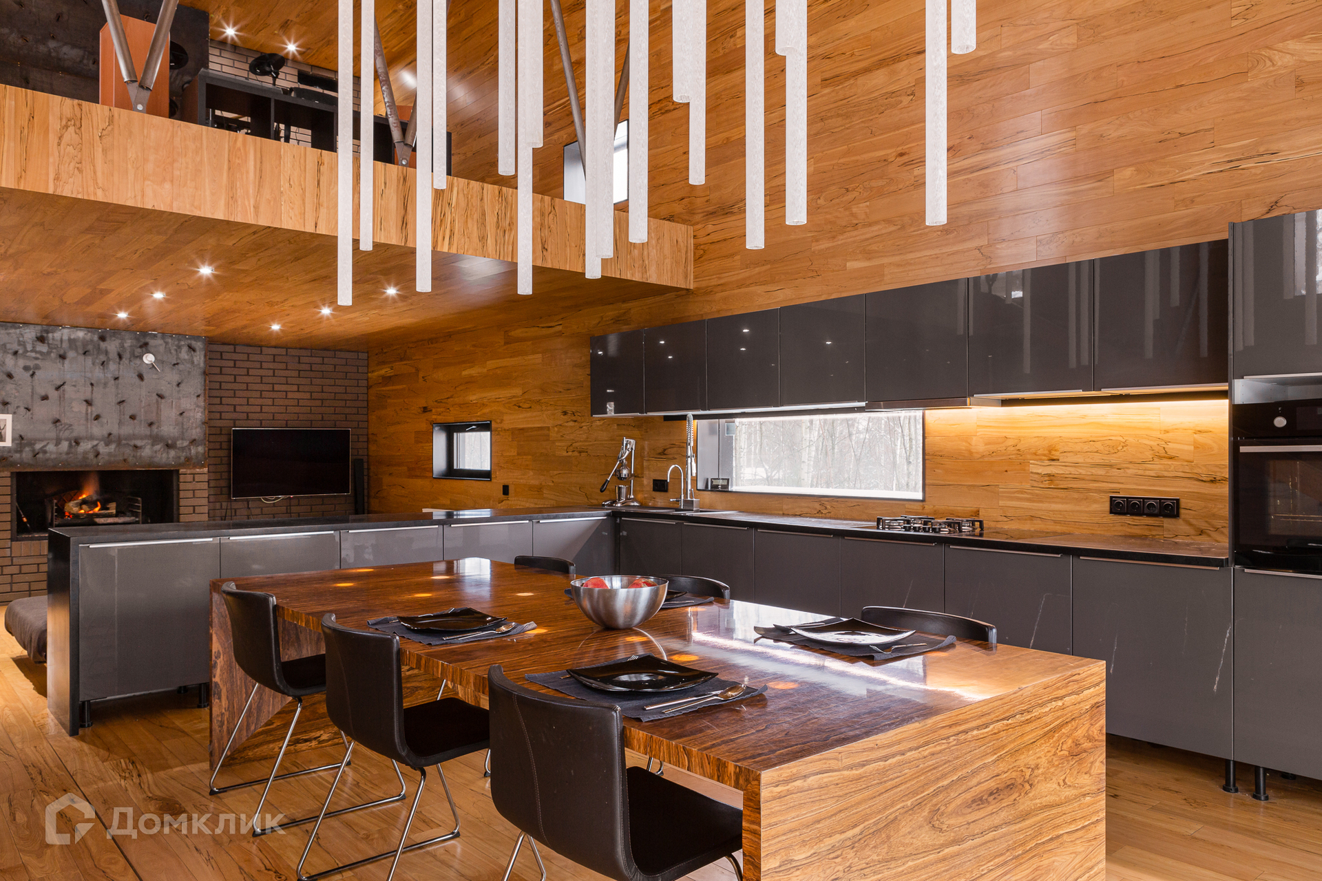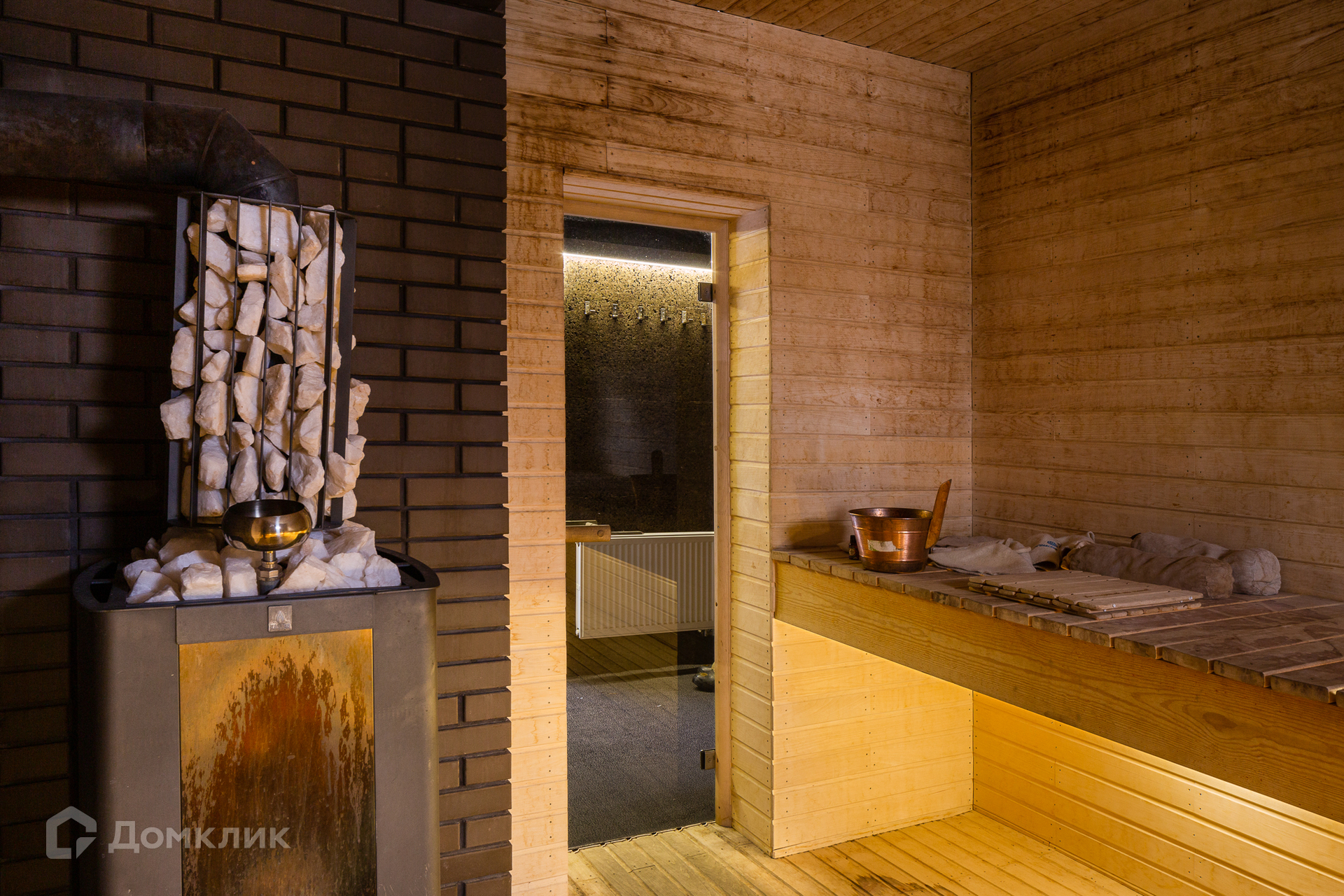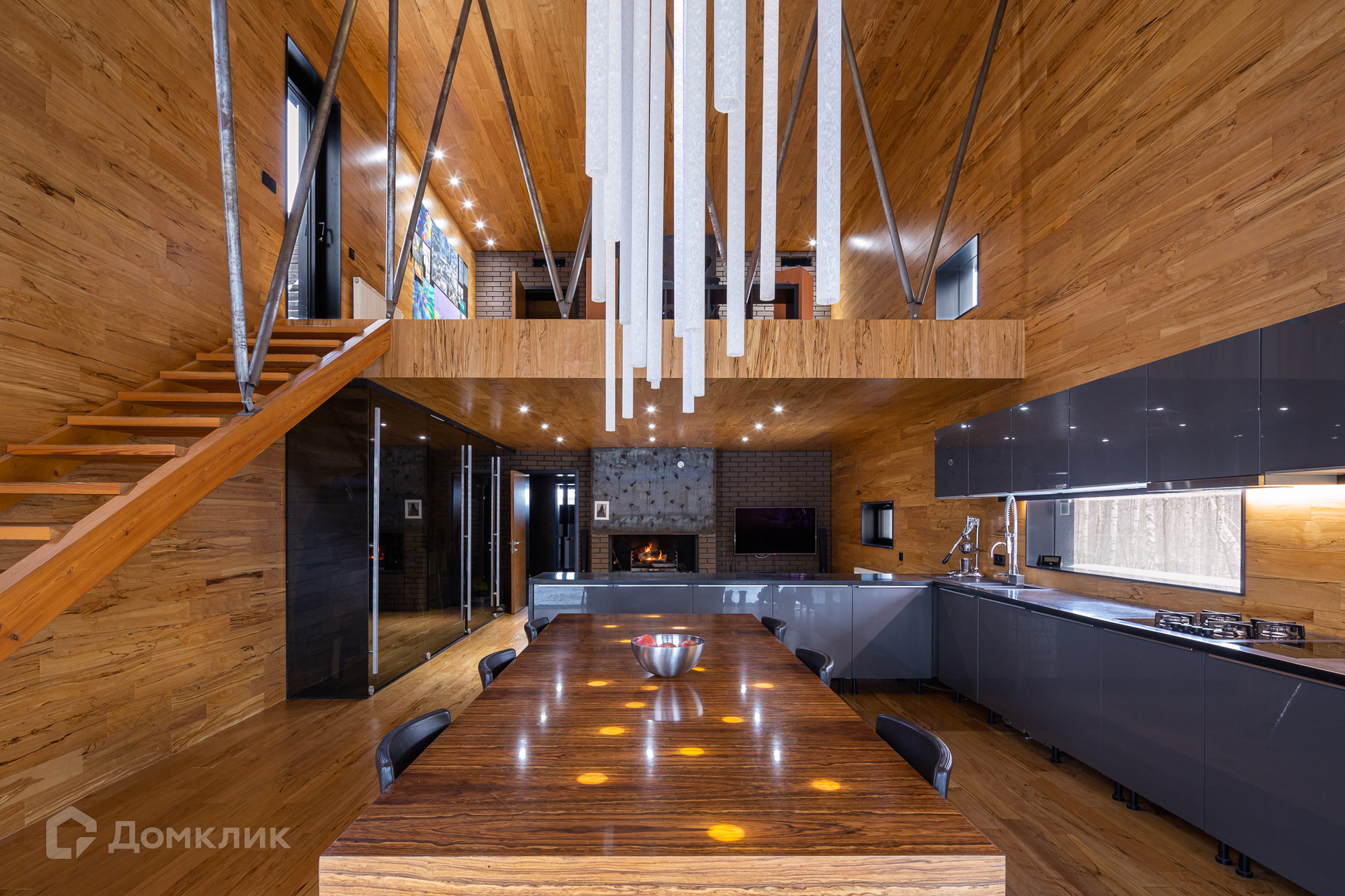 На 1-м этаже: гостиная с настоящим камином, кухня, оборудованная всей необходимой мебелью и техникой, которая удовлетворит запросы самой взыскательной хозяйки, просторная сауна, санузел совмещенный. Прямо напротив сауны имеется выход на террасу с купелью.