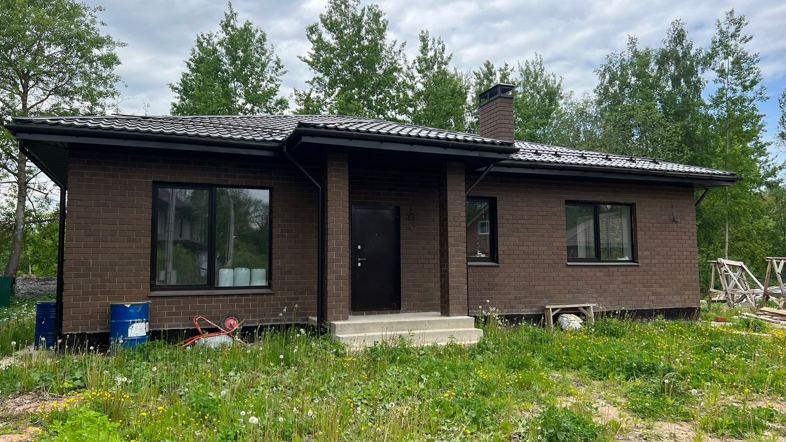 В доме 3 спальни, в одной из которых отдельный санузел, гардероб. Также в доме имеется гостевой санузел, кладовая и темная комната, которую можно использовать для хранения зимних заготовок. Большая кухня-гостиная с выходом на общую террасу, которая находится под общей крышей с выходом из хозяйской спальни.