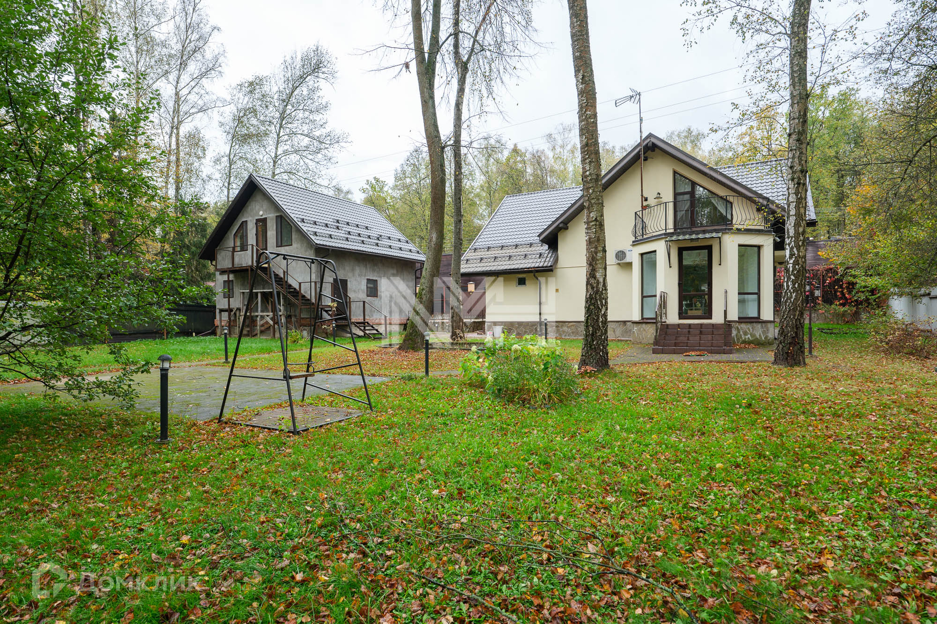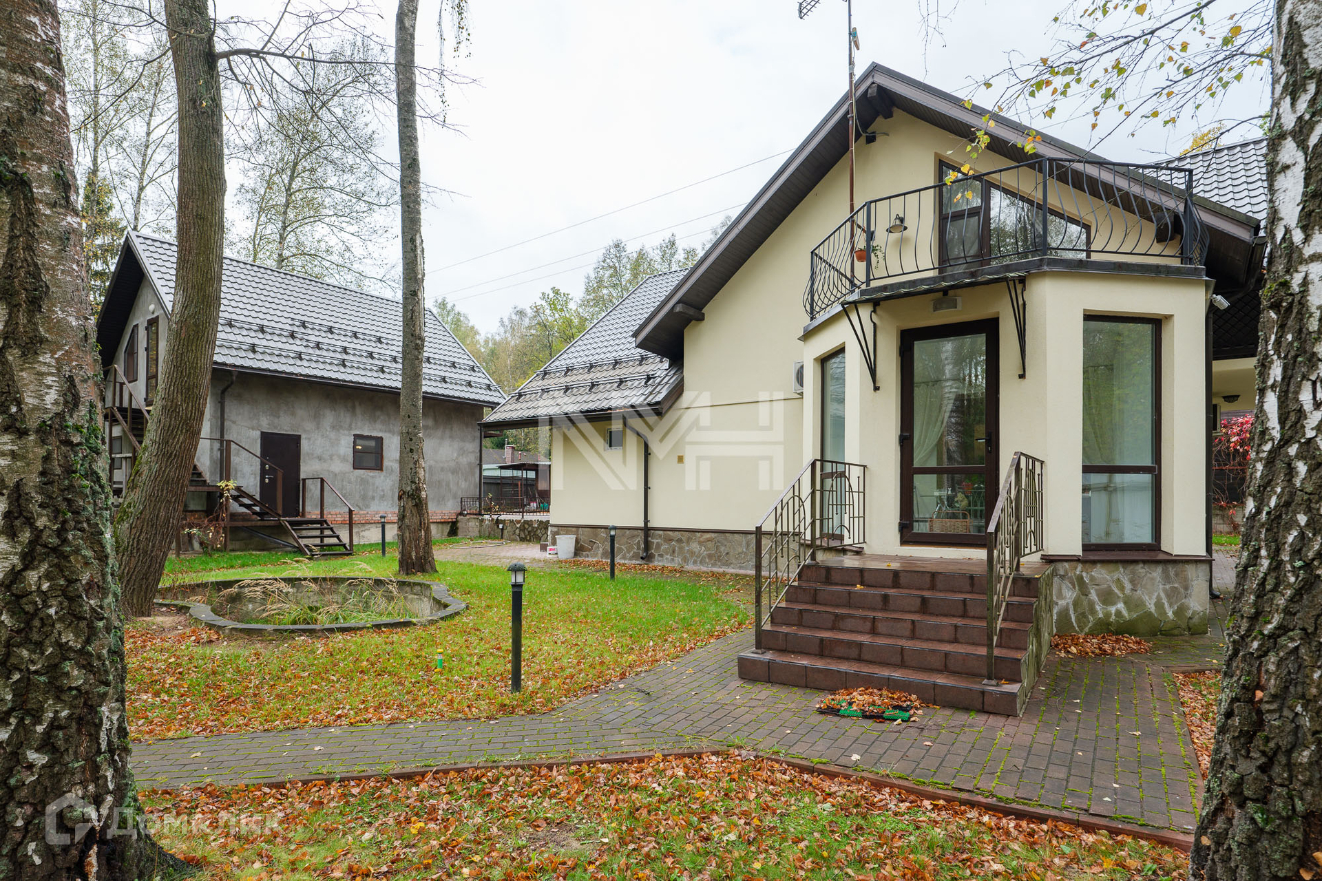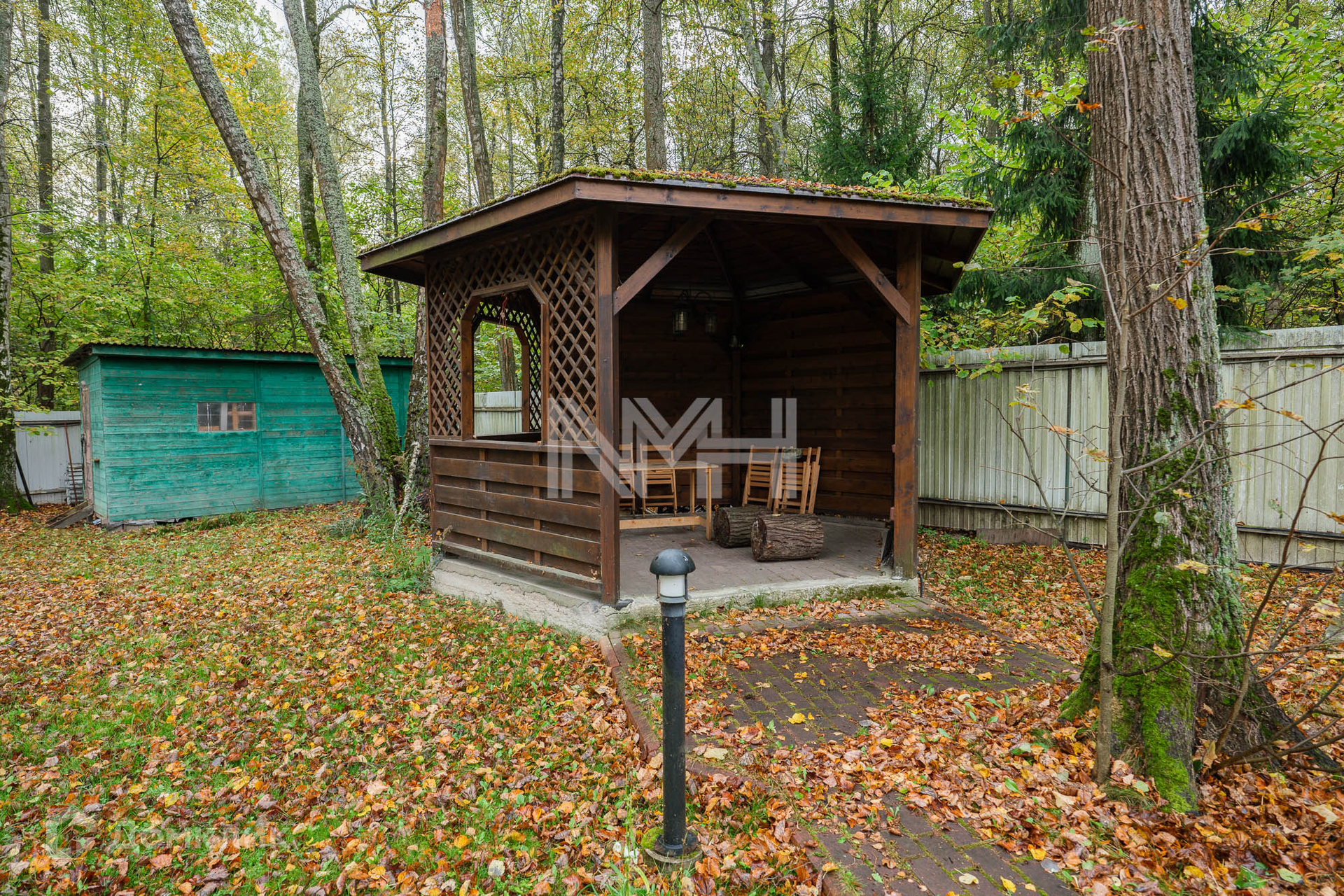 На прилесном участке 20 соток: ровный газон с лесными деревьями, беседка с барбекю, хозяйственная постройка и гараж на две машины с помещением для персонала на втором этаже.