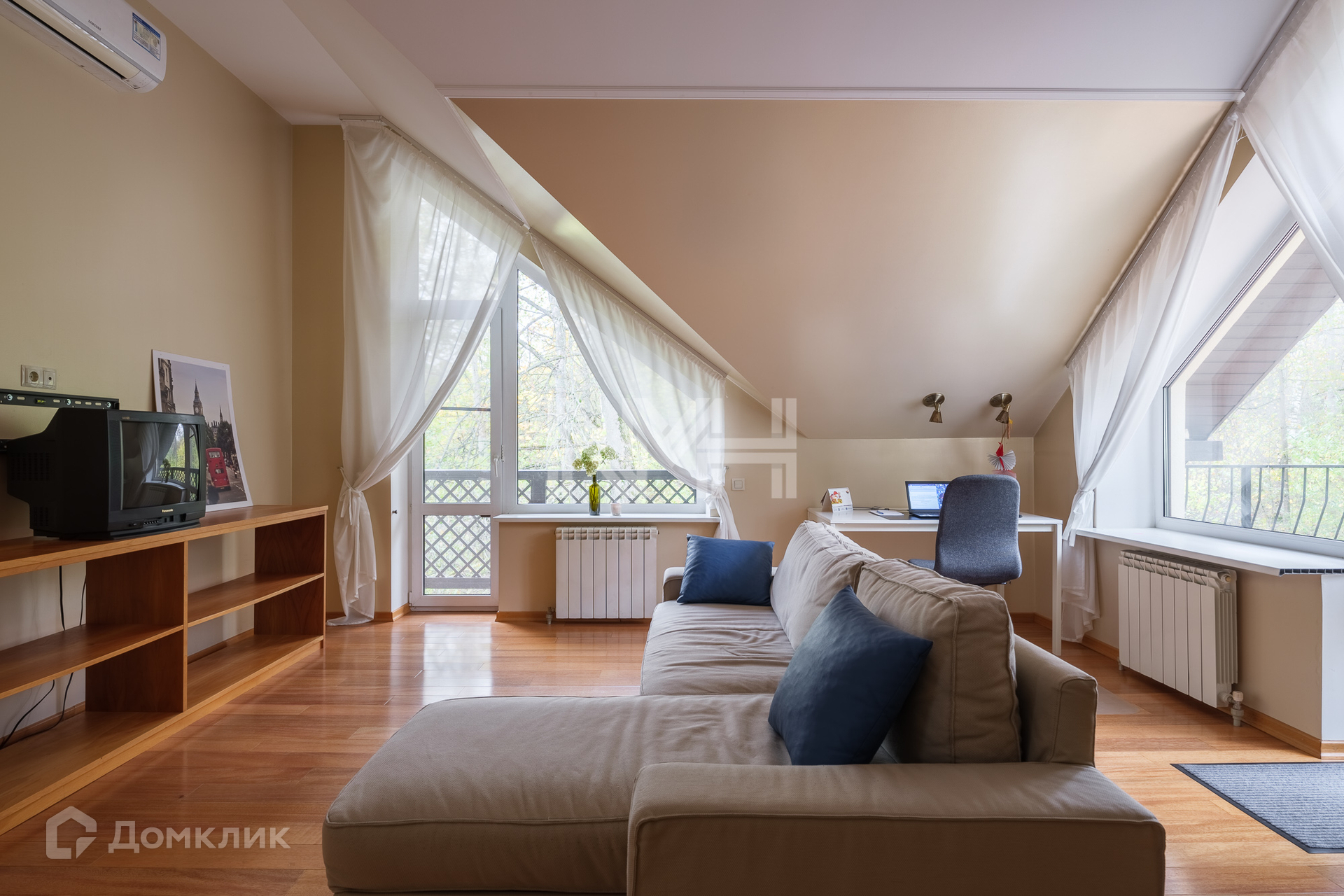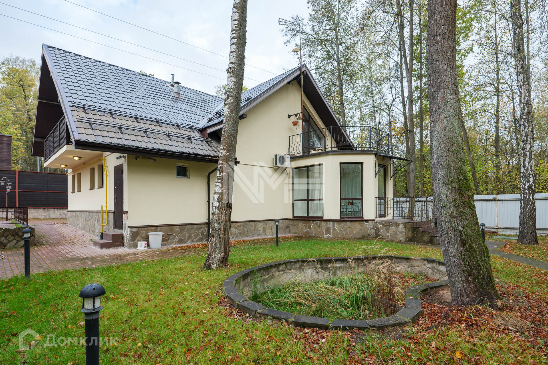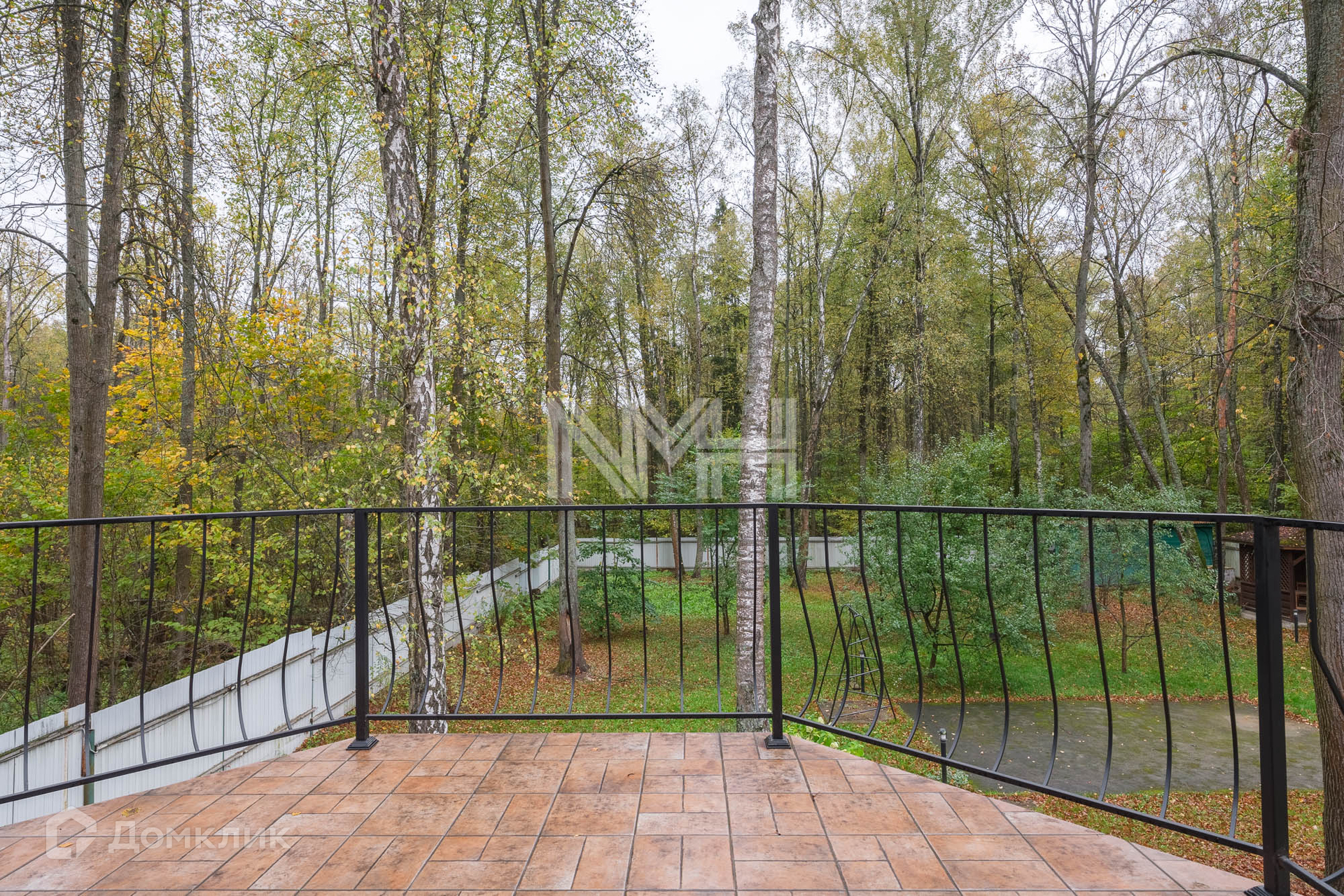 На прилесном участке 20 соток: ровный газон с лесными деревьями, беседка с барбекю, хозяйственная постройка и гараж на две машины с помещением для персонала на втором этаже.
