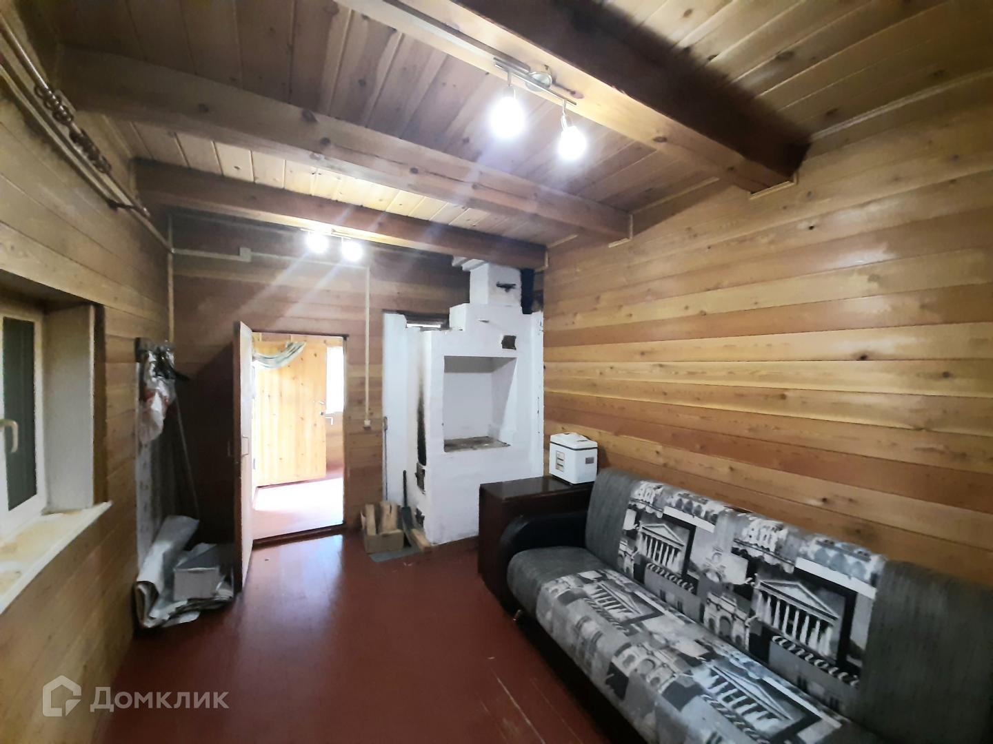 Дом на фундаменте, из 20 бруса в два этажа, внутри обшит вагонкой, печное отопление, вода в летний период из летнего водопровода, зимой скважина. Электричество 15 кВт