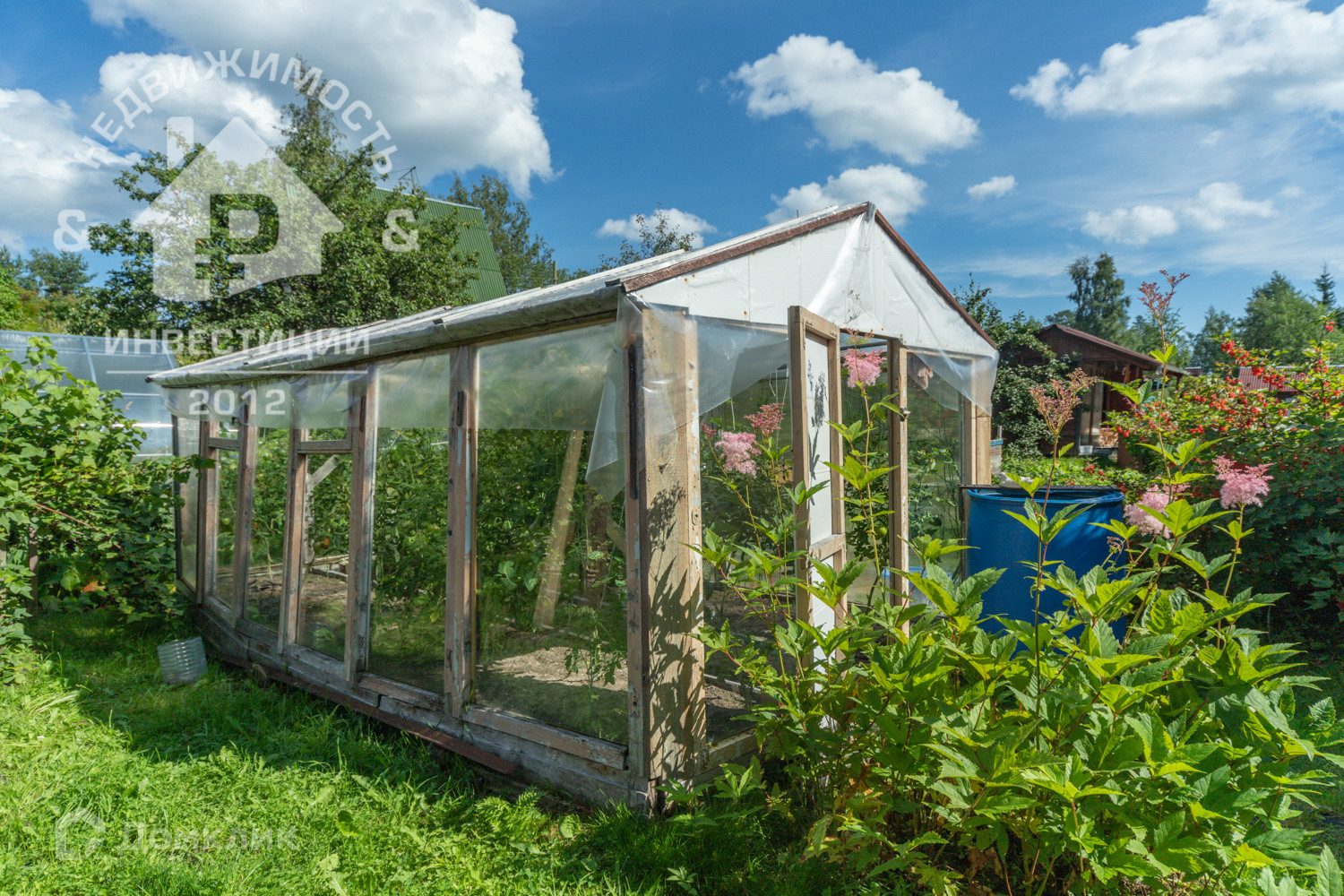По периметру земельного участка растут кусты смородины (красной и черной), крыжовника, яблоня, слива, также есть две туи.
