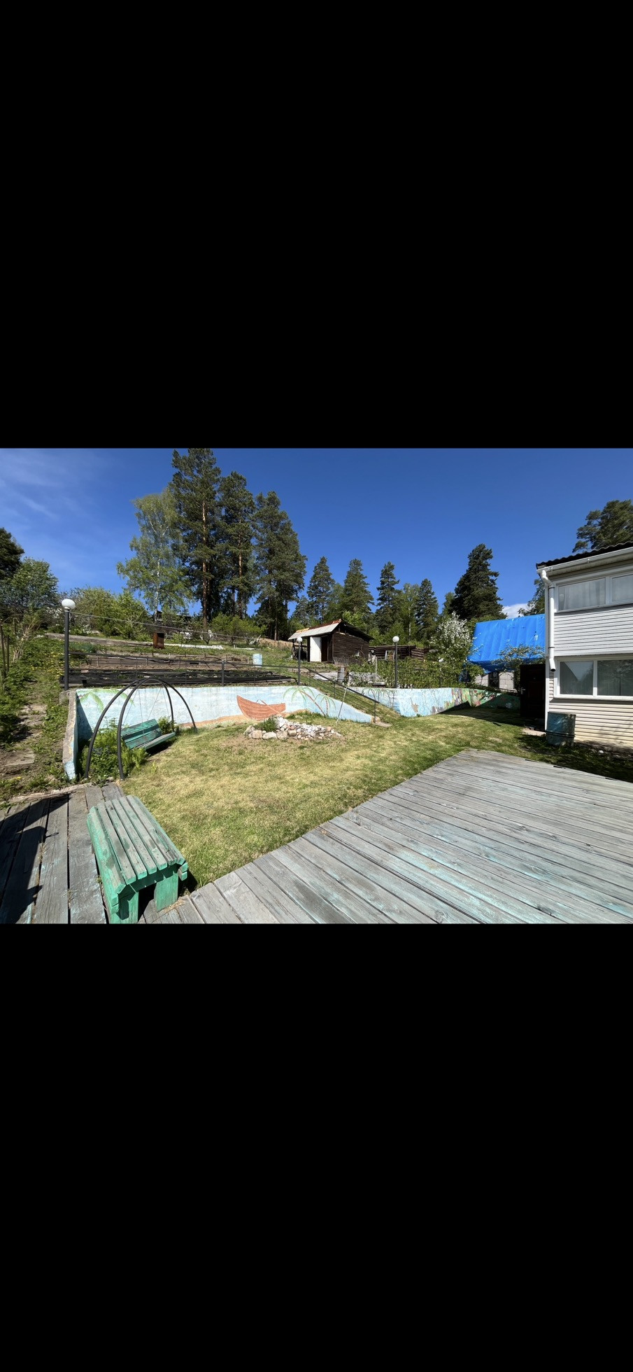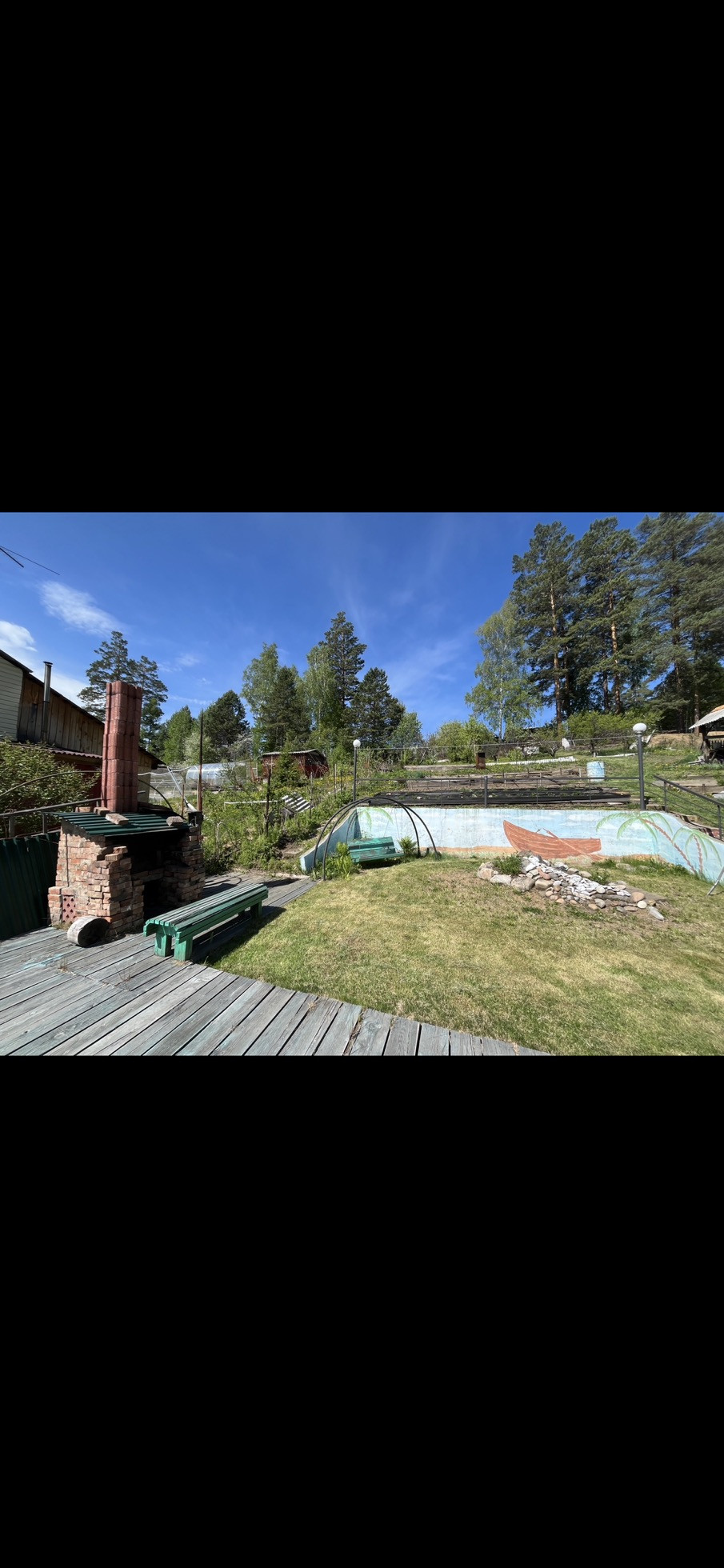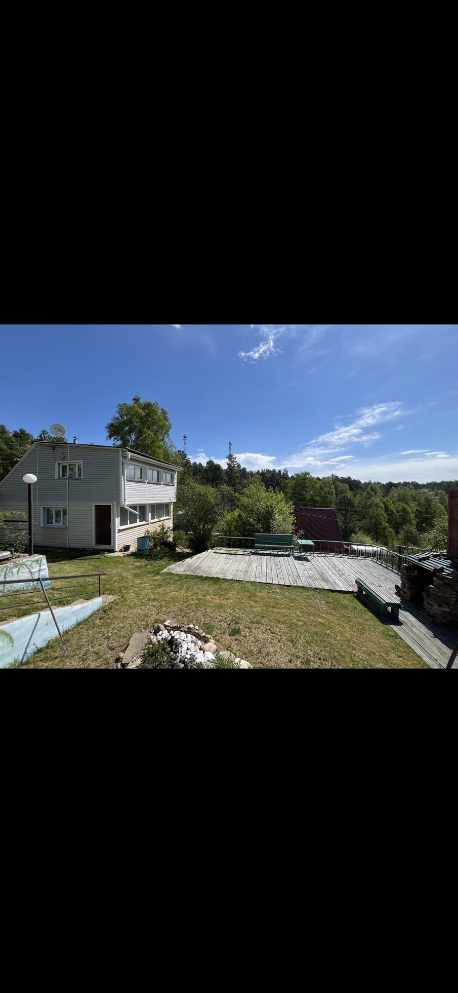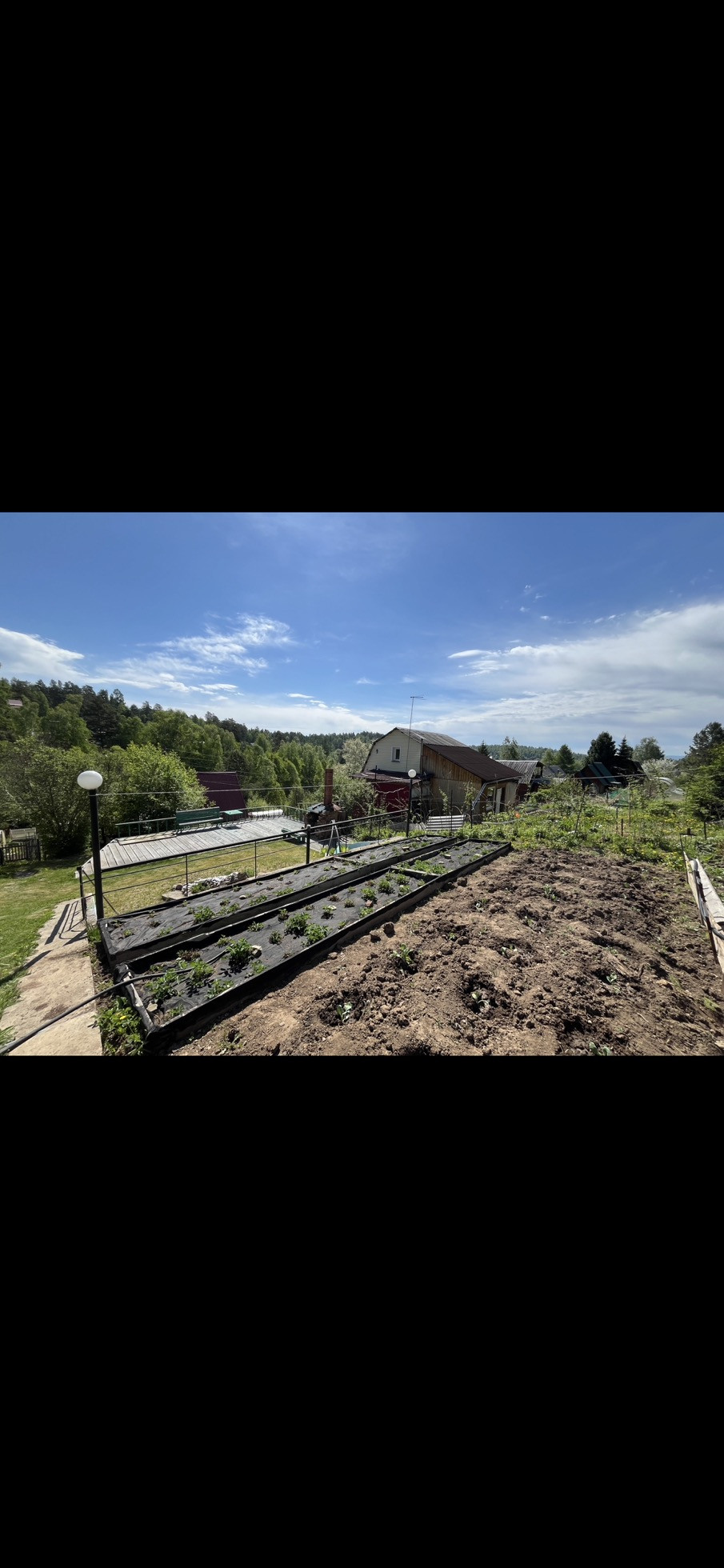 На участке есть ровная зона отдыха и барбекю с лавочками, качелями и специальной печкой. Место для установки бассейна летом. Огород разработан, есть сформированные грядки с клубникой, плодово-ягодные деревья и кусты: чернослив и бордовая слива, яблони, вишня, абрикос, малина. Есть хорошая действующая небольшая банька. Перед домом личная специально оборудованная и выровненная бетонными плитами ровная площадка для парковки еще двух машин. Также есть второй подъезд к участку по верхней дороге, заезд с другого СНТ.