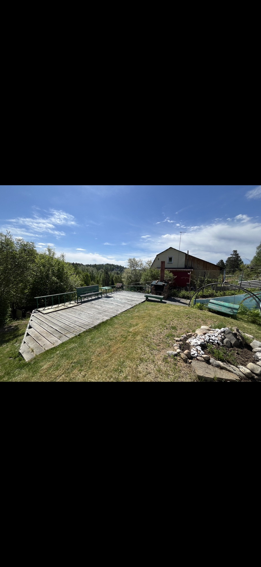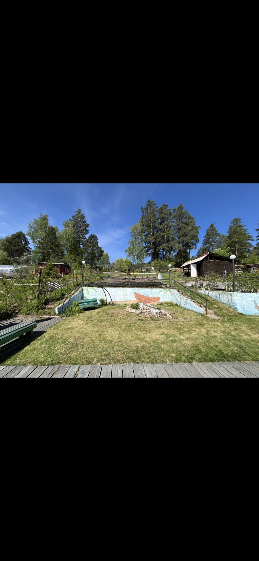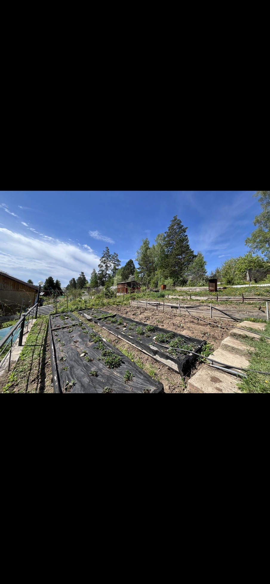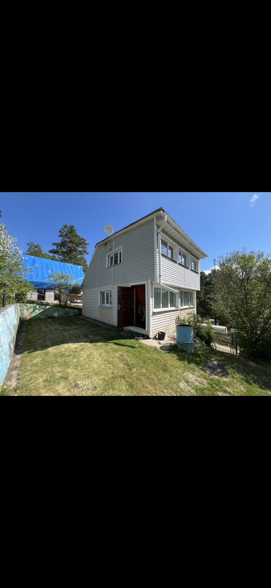 На участке есть ровная зона отдыха и барбекю с лавочками, качелями и специальной печкой. Место для установки бассейна летом. Огород разработан, есть сформированные грядки с клубникой, плодово-ягодные деревья и кусты: чернослив и бордовая слива, яблони, вишня, абрикос, малина. Есть хорошая действующая небольшая банька. Перед домом личная специально оборудованная и выровненная бетонными плитами ровная площадка для парковки еще двух машин. Также есть второй подъезд к участку по верхней дороге, заезд с другого СНТ.