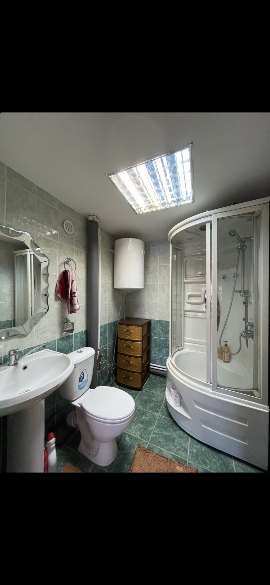 Дом построен из бруса, сверху сендвич-панель, окна все стеклопакеты. Проведено отопление, на каждом этаже включая гараж стоят радиаторы. Отопление идет с гаража круглый год, там стоит котел и печка с тенами Zota, может работать и от электричества и от дров, поэтому в случае какой нибудь аварии на электросетях вы в любом случае не замерзните зимой :) Также проведены полы с подогревом на кухне и в ванной комнате. Горячая вода поступает из бойлера на 80л установленного в ванной. В гостиной деревянный пол из кедра толщиной 10см доски. Душевая кабина на 1 этаже, на 2 этаже только туалет с раковиной, горячая вода также туда проведена. Вода поступает из скважины глубиной 92м. Воду можно пить, хорошая, без примесей, без запаха. Воду качает качественный немецкий насос.