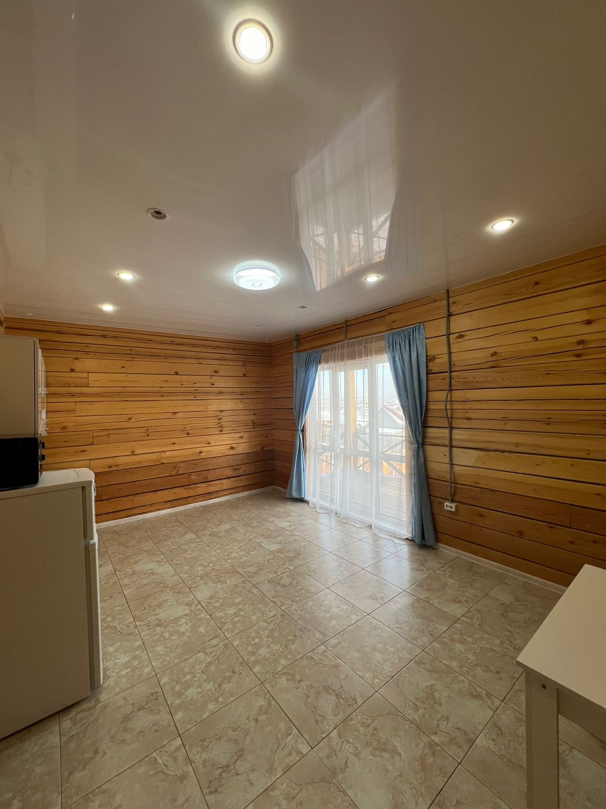 Натяжные потолки в прихожей и кухне - глянец, в комнатах - матовые.