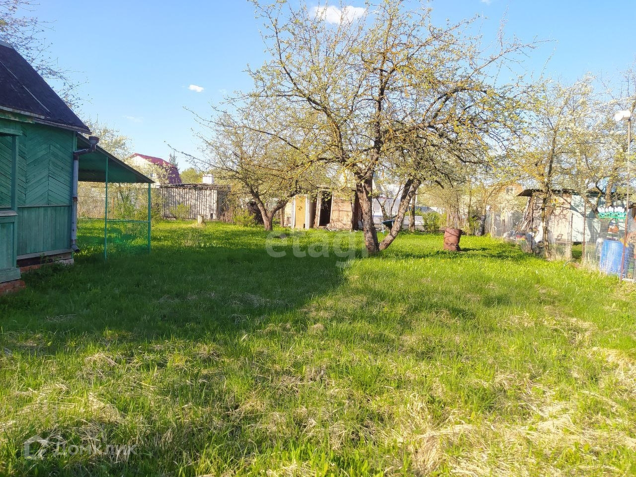 На даче есть уютный домик, плодовые деревья, ягоды, цветы, навес сзади дома.