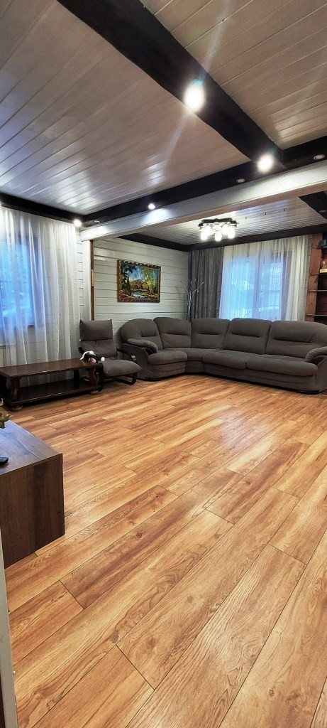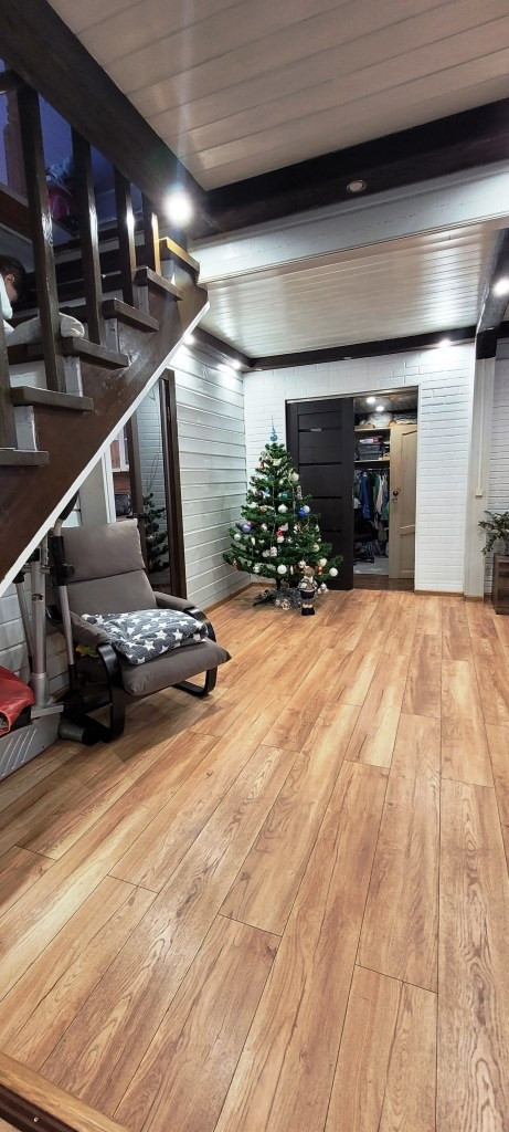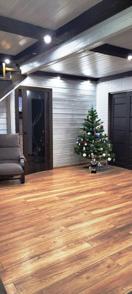 Первый дом из бруса 105 м² на ленточном фундаменте внутри засыпан песком и сверху з бетонная стяжка.