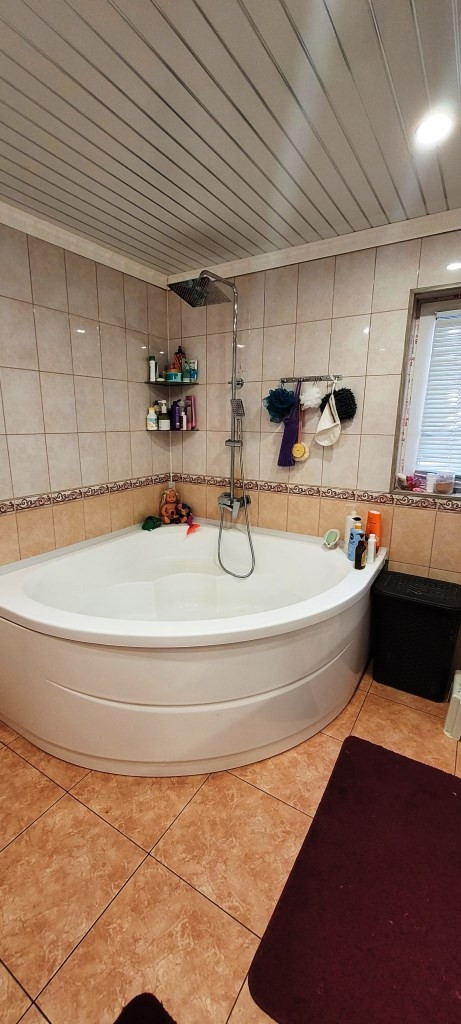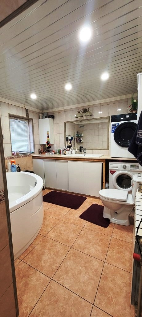 На первом этаже теплые полы. Вода из скважины, канализация септик, горячая вода и отопление двухконтурный газовый котёл, свет 15 кВт тариф городской. На воду стоят фильтра.