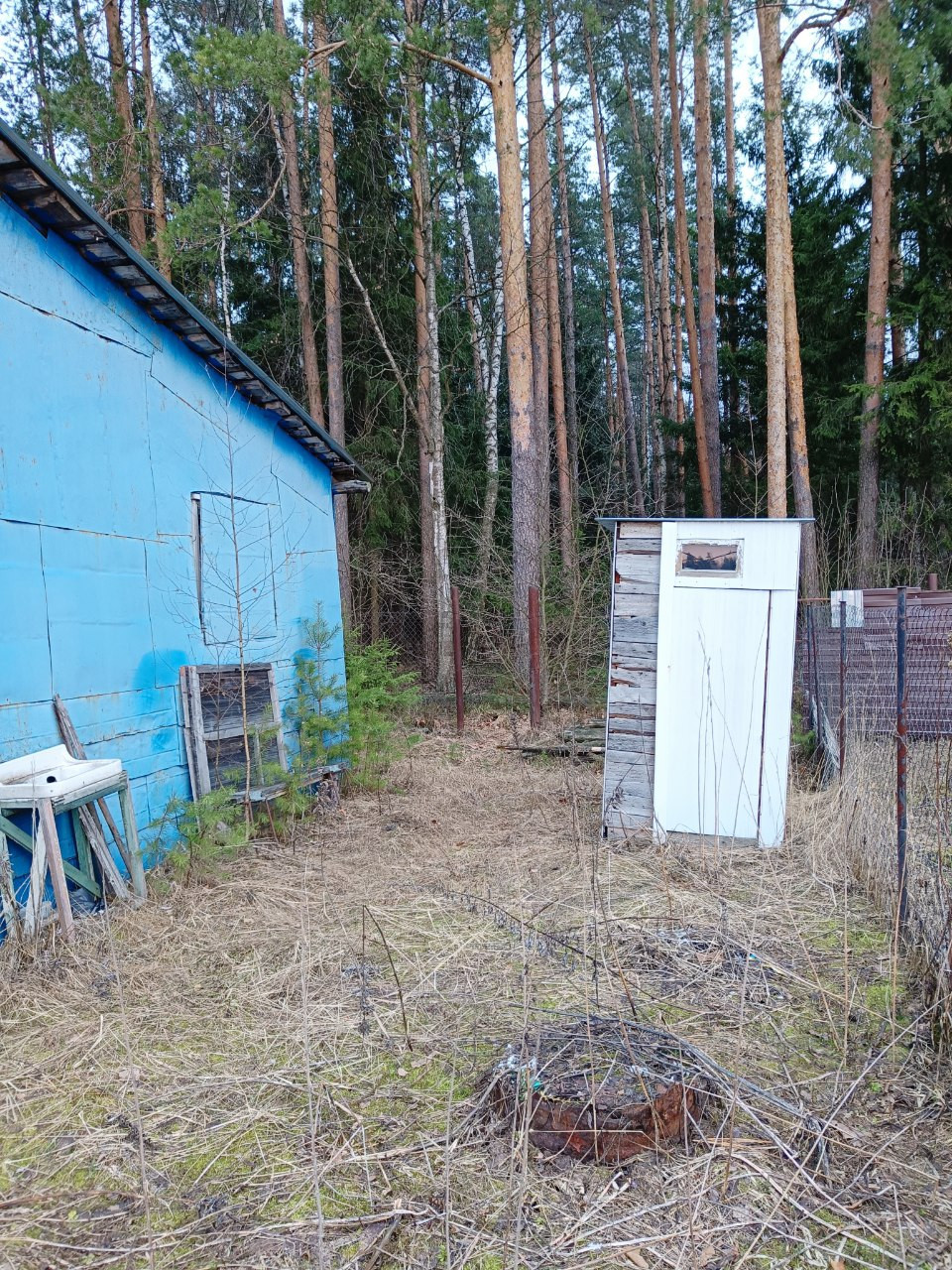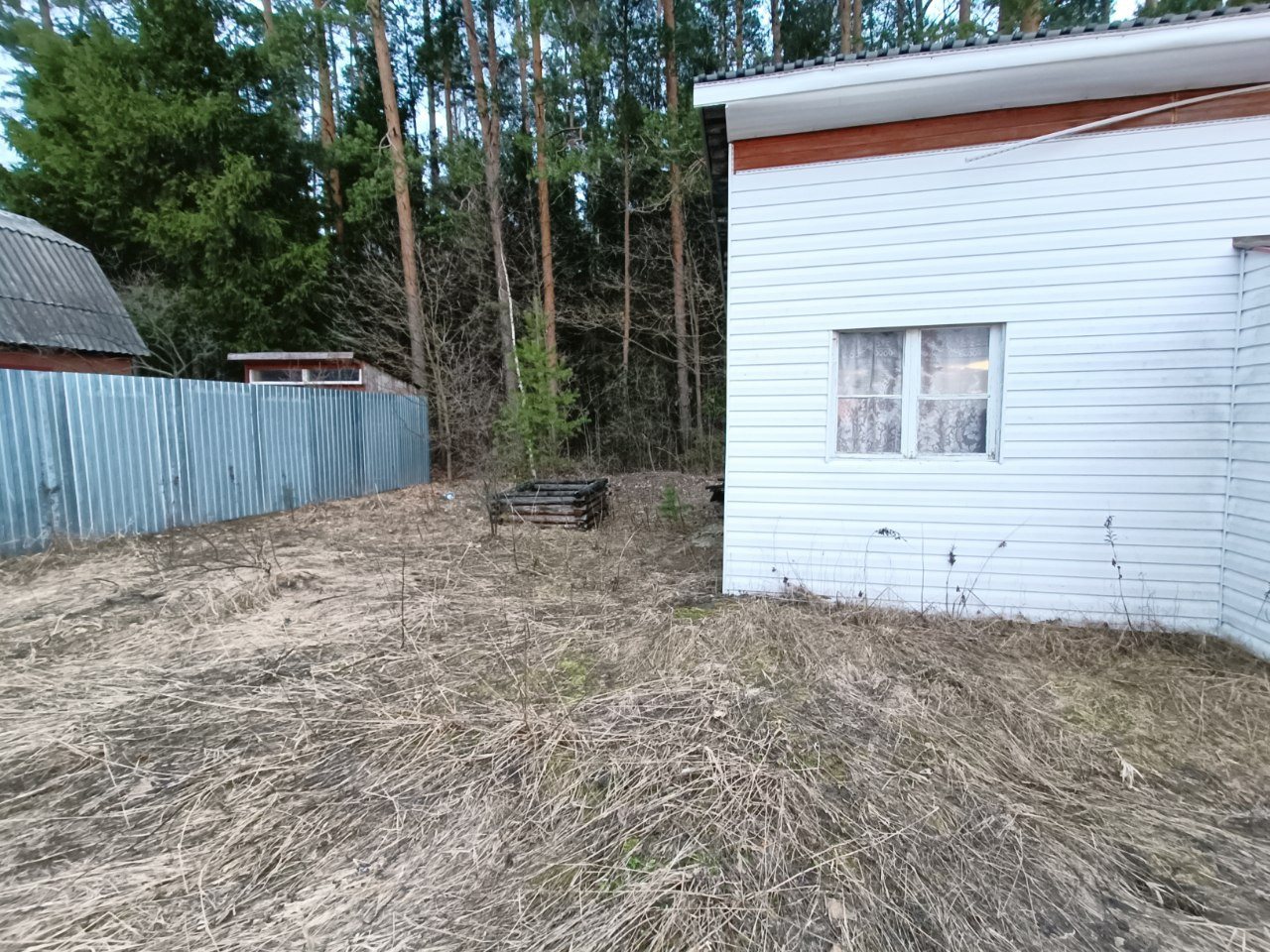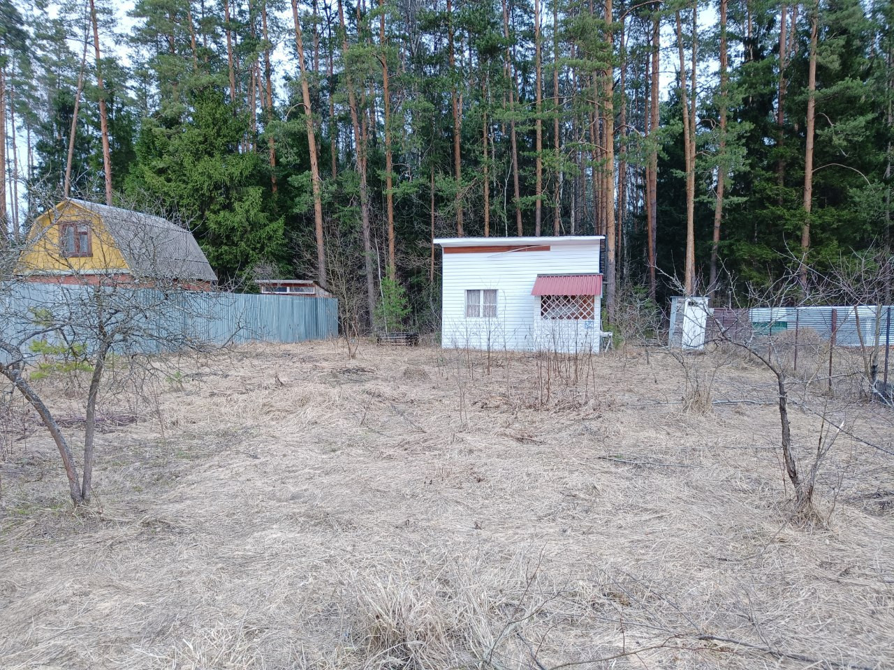 Огорожен забором из сетки рабица, со стороны соседей профлистом.