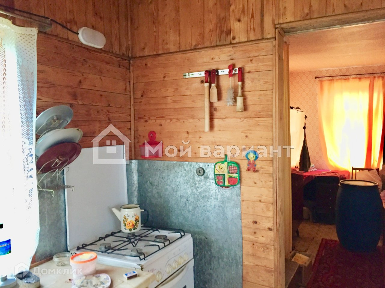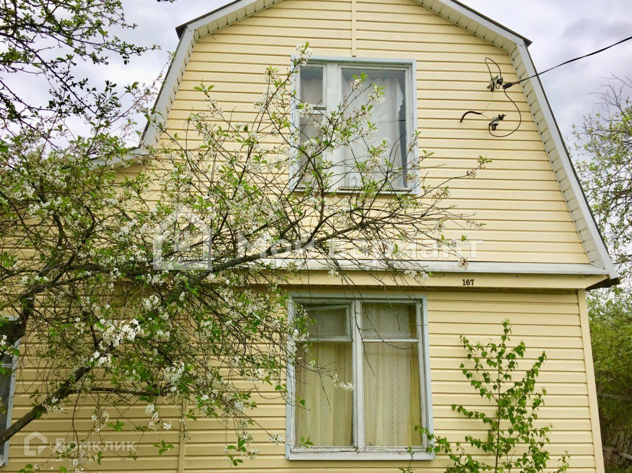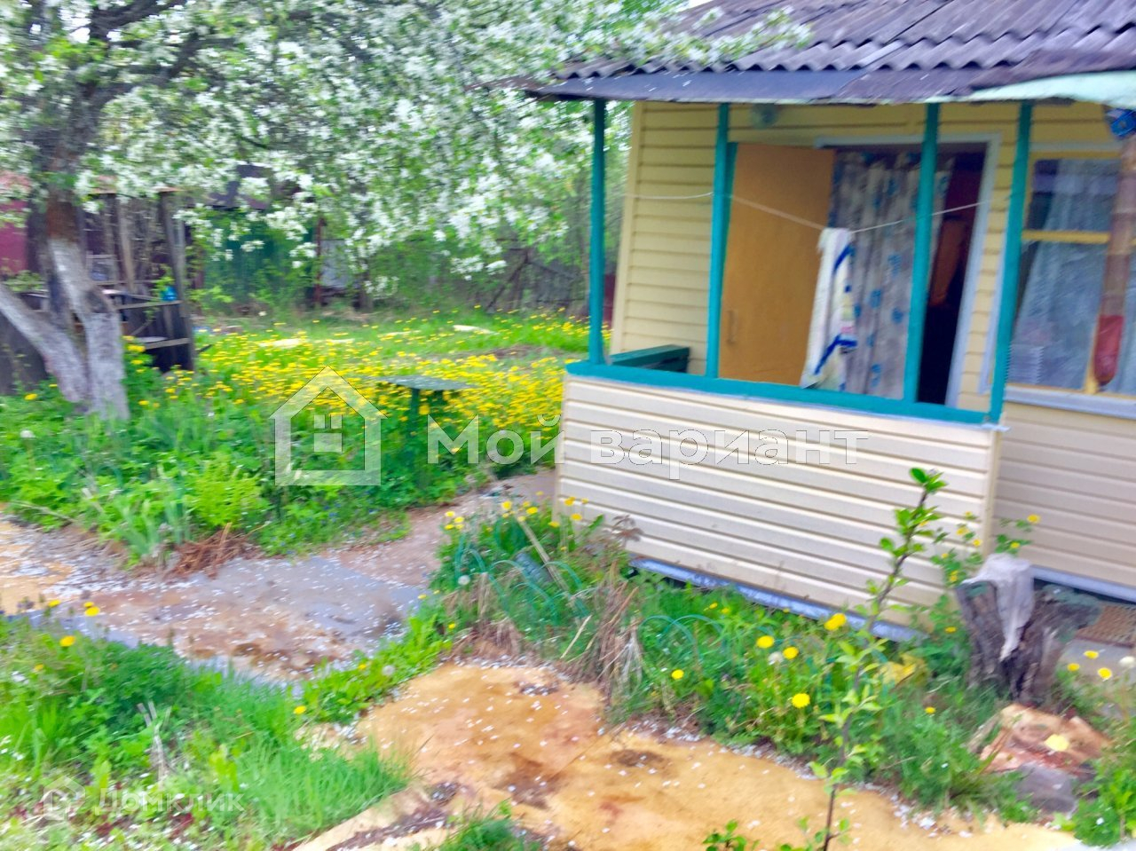 На участке имеется 2х эт. деревянный дом 50 м2, обшитый сайдингом. На 1 этаже: терраса, кухня, 2 комнаты ( одна проходная). На 2 этаже одна большая  комната. Дом пригоден для сезонного проживания.