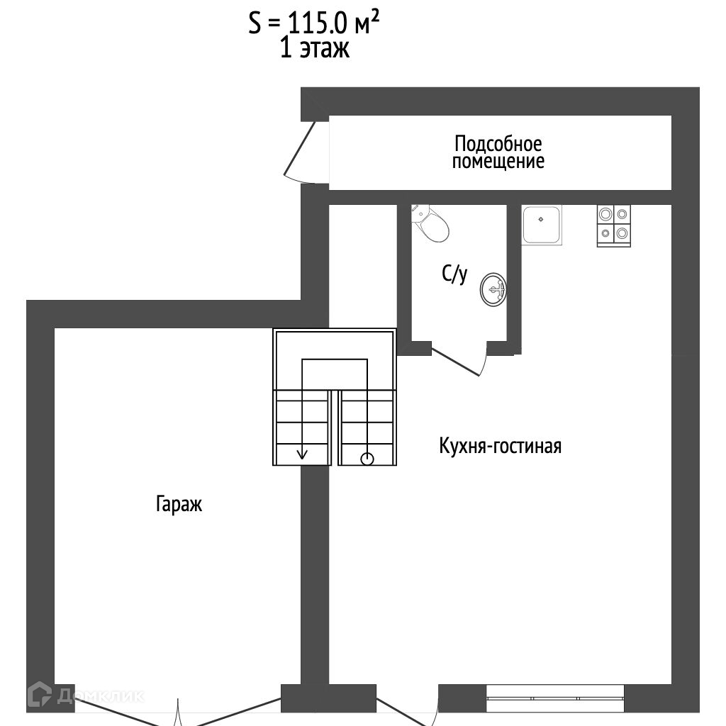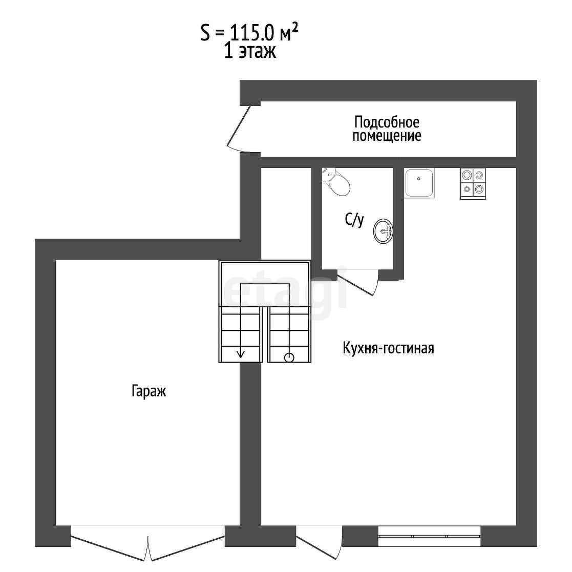 Первый этаж: кухня-гостинная, санузел и удобная лестница на второй этаж Плюс - отдельное техническое помещение и гараж под автомобиль.