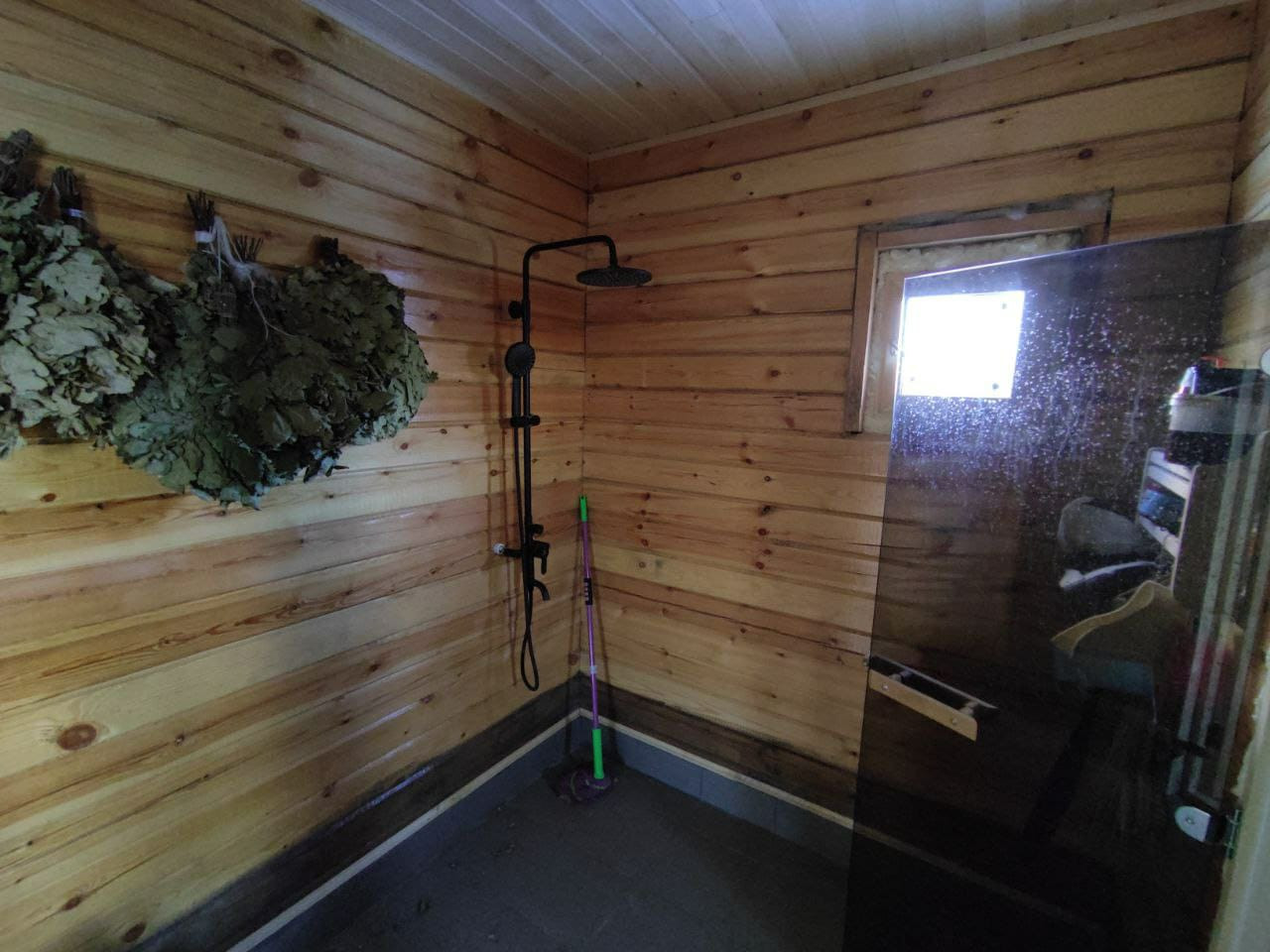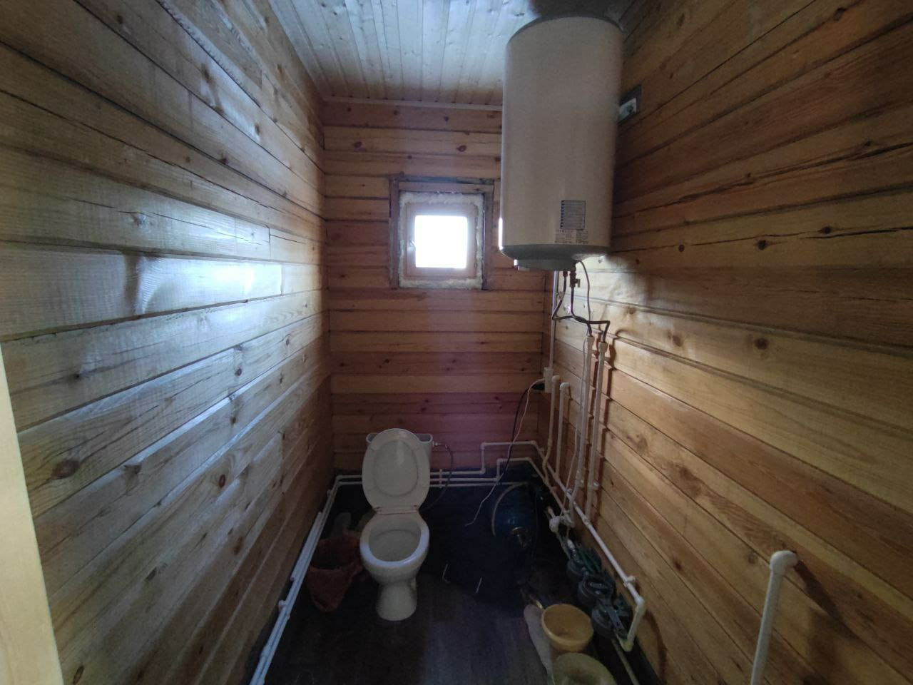 - душевая стойка в мойке, в туалете расположена разводка всех водных коммуникаций, по дому труб нет. Котел на 100 литров Ресанта.