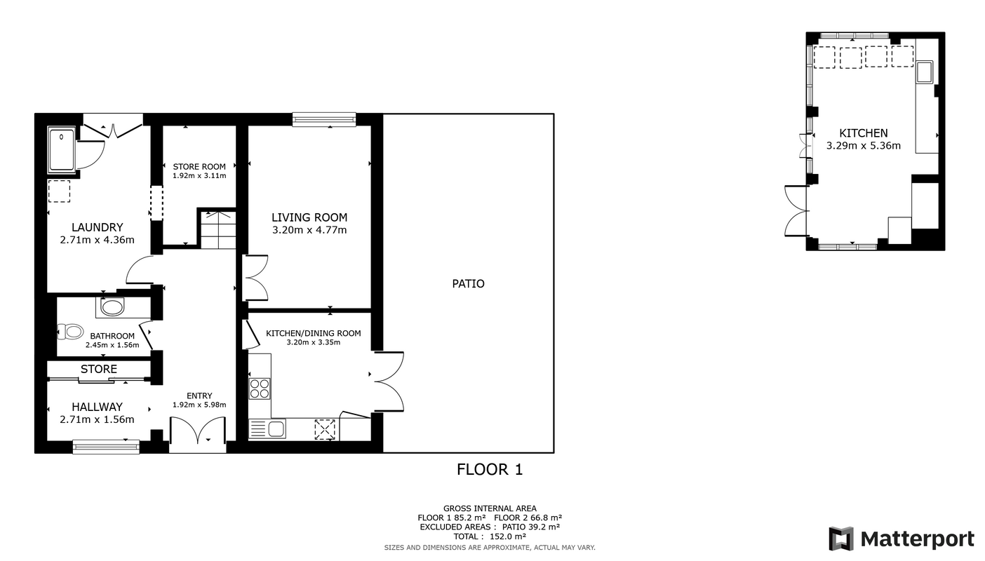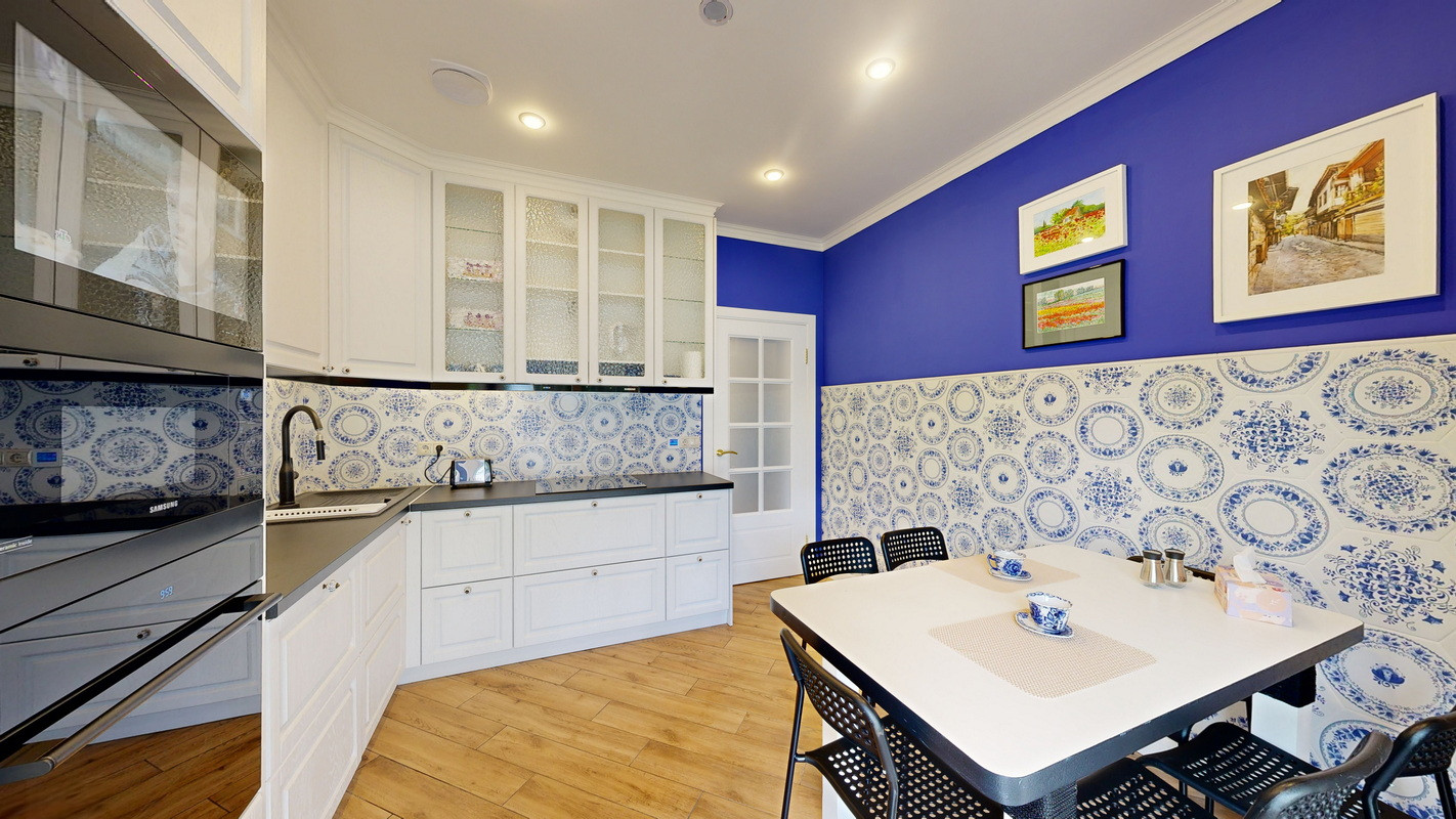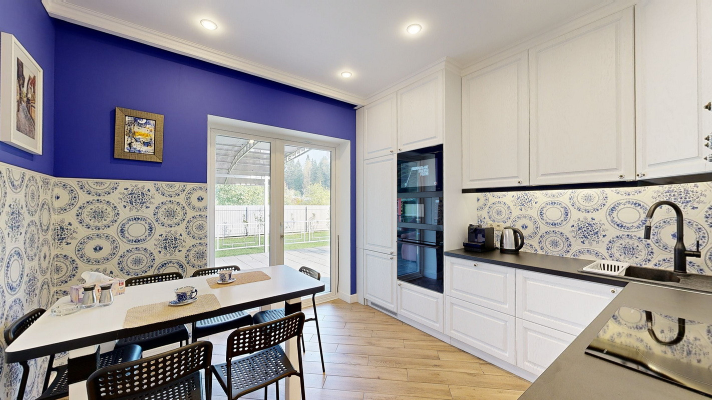 Кухня со встроенными: смарт телевизором, микроволновкой, духовкой, двухкамерным холодильником, посудомойкой и вытяжкой над варочной индукционной панелью, имеется и независимая принудительная вытяжка, всевозможная мелкая бытовая техника, посуда, вплоть до столовых приборов, встроенный медиаплеер с цифровым дисплеем, динамики которого установлены в потолке самой кухни, а также в потолке санузла первого этажа.