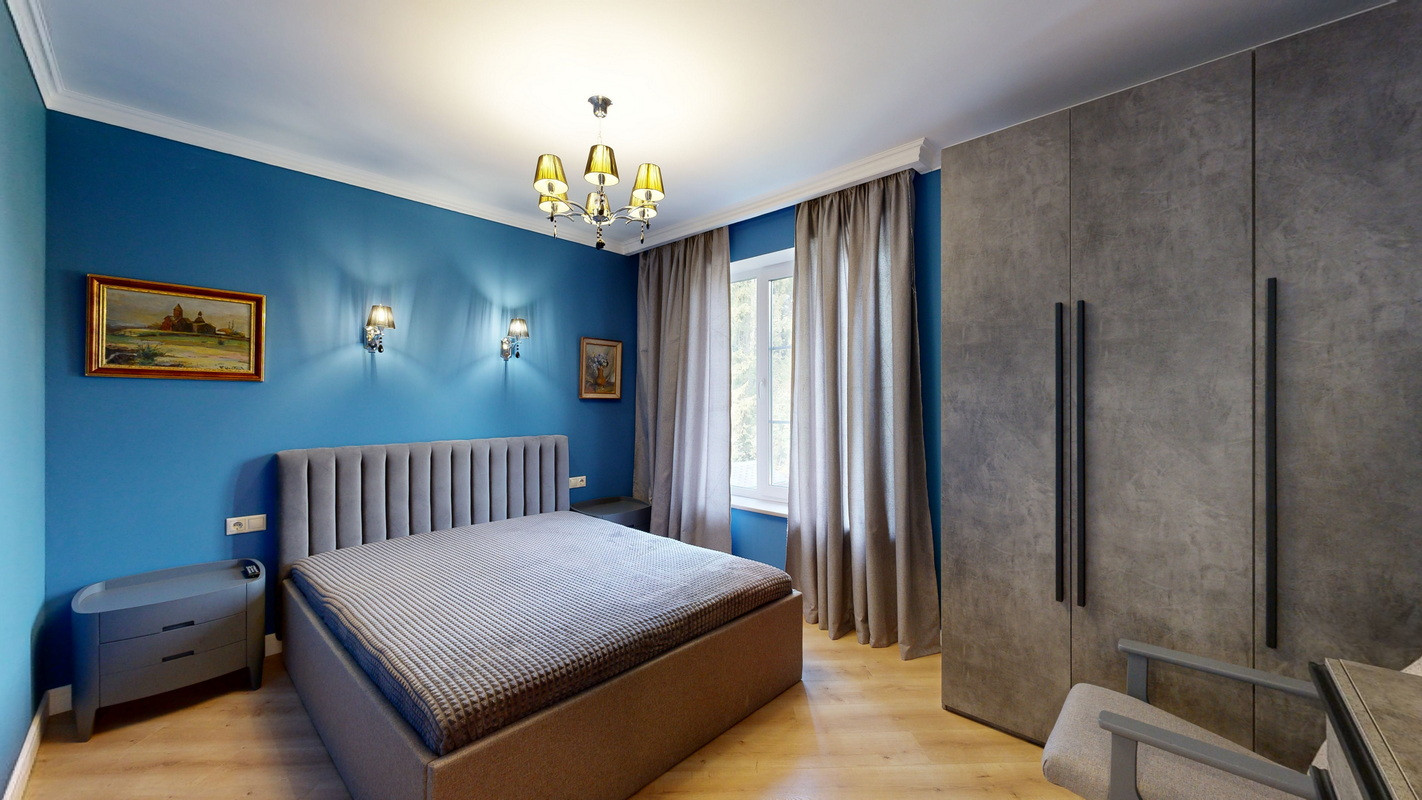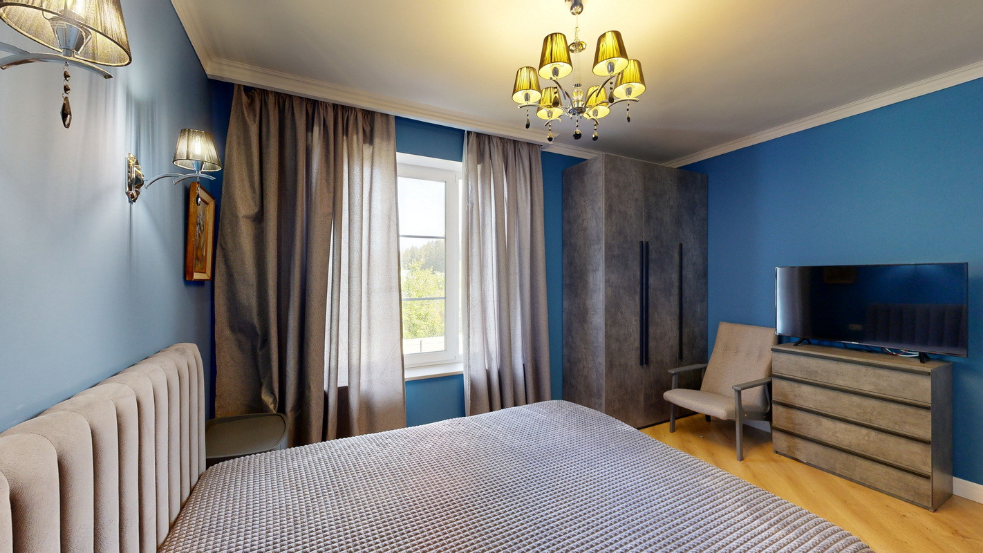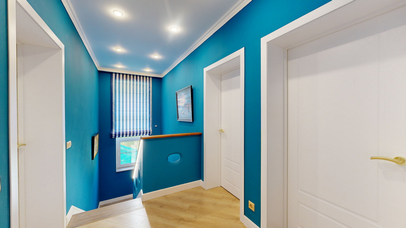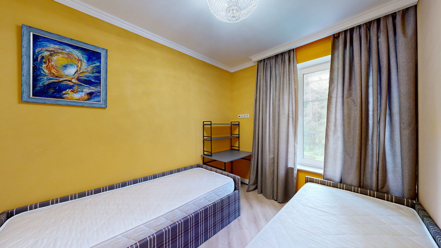На этаже три спальни, две из которых с двухместными кроватями, прикроватными тумбочками и смарт телевизорами, платяными шкафами и бельевыми комодами, третья спальня с двумя односпальными кроватями, бельевым шкафом и рабочим местом.