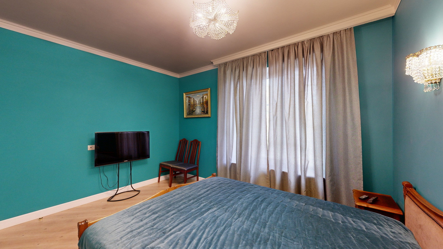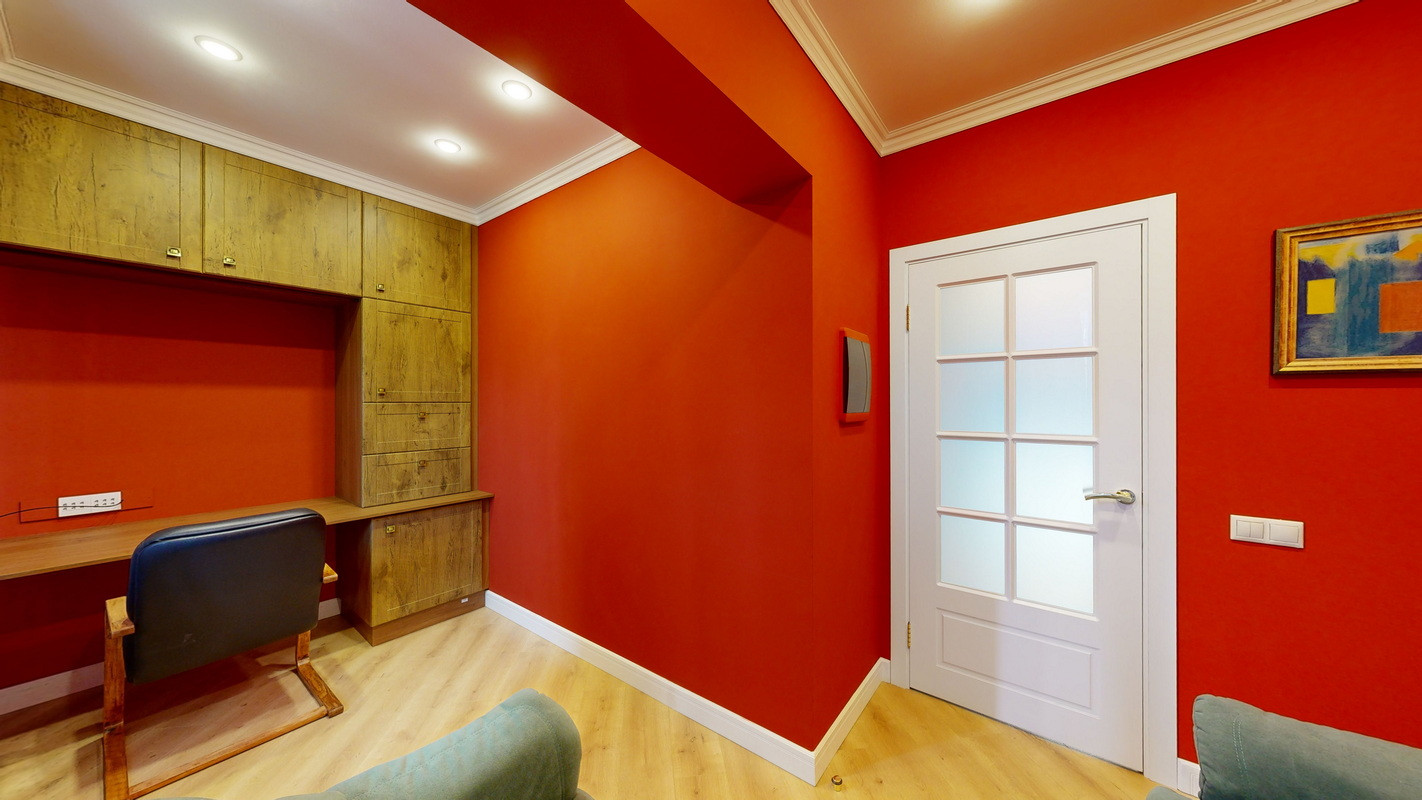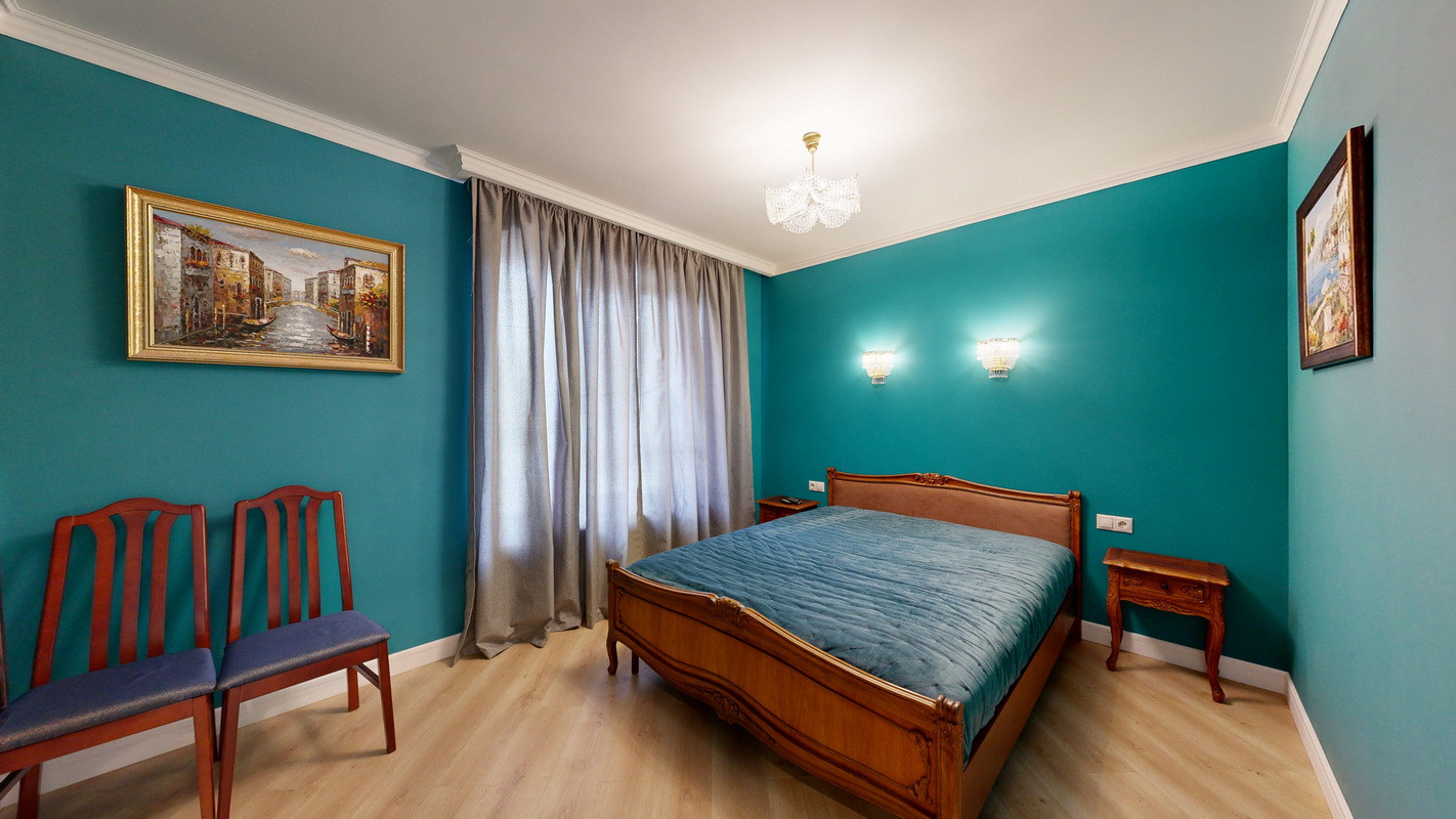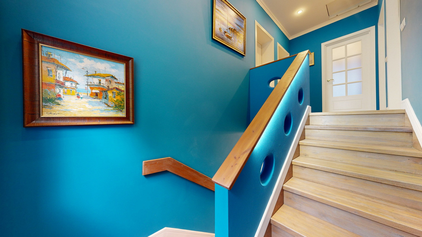 На этаже три спальни, две из которых с двухместными кроватями, прикроватными тумбочками и смарт телевизорами, платяными шкафами и бельевыми комодами, третья спальня с двумя односпальными кроватями, бельевым шкафом и рабочим местом.