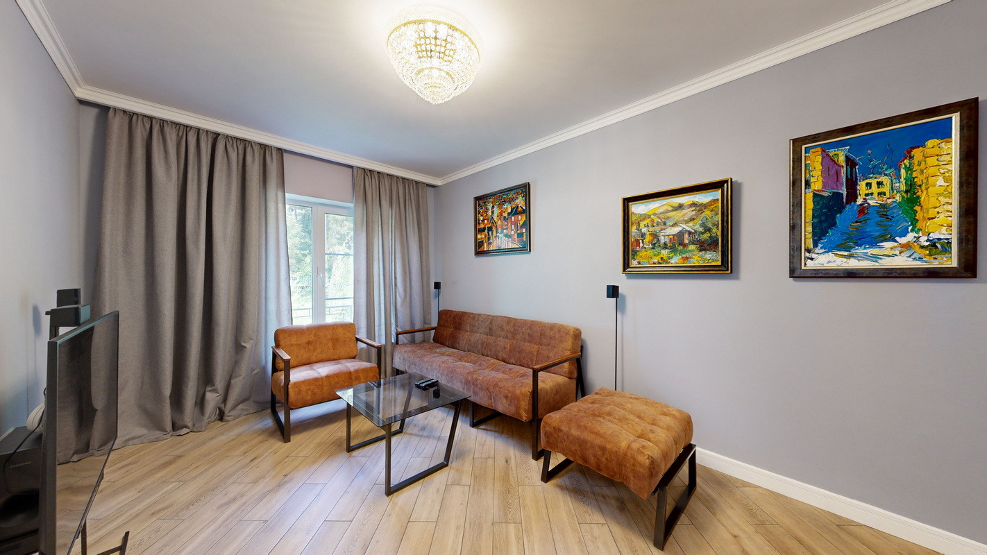 Гостиная с мягкой мебелью в стиле лофт не утяжеляющая помещение, большой смарт телевизор с домашним кинотеатром.