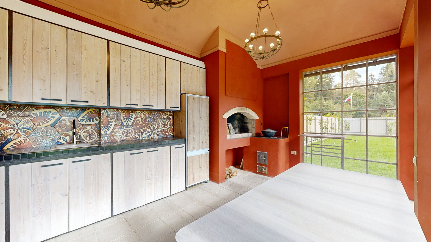Чуть поодаль от террасы находится остекленная летняя кухня с двухкамерным холодильником, холодной и горячей водой, канализацией, мангалом и тандыром, на котором также можно готовить блюда в казане. Чтобы далеко не ходить, можно собраться компанией и отведать пищу с пылу-жару за большим столом и на летней кухне, причем в любую погоду, название летняя здесь весьма условно.
