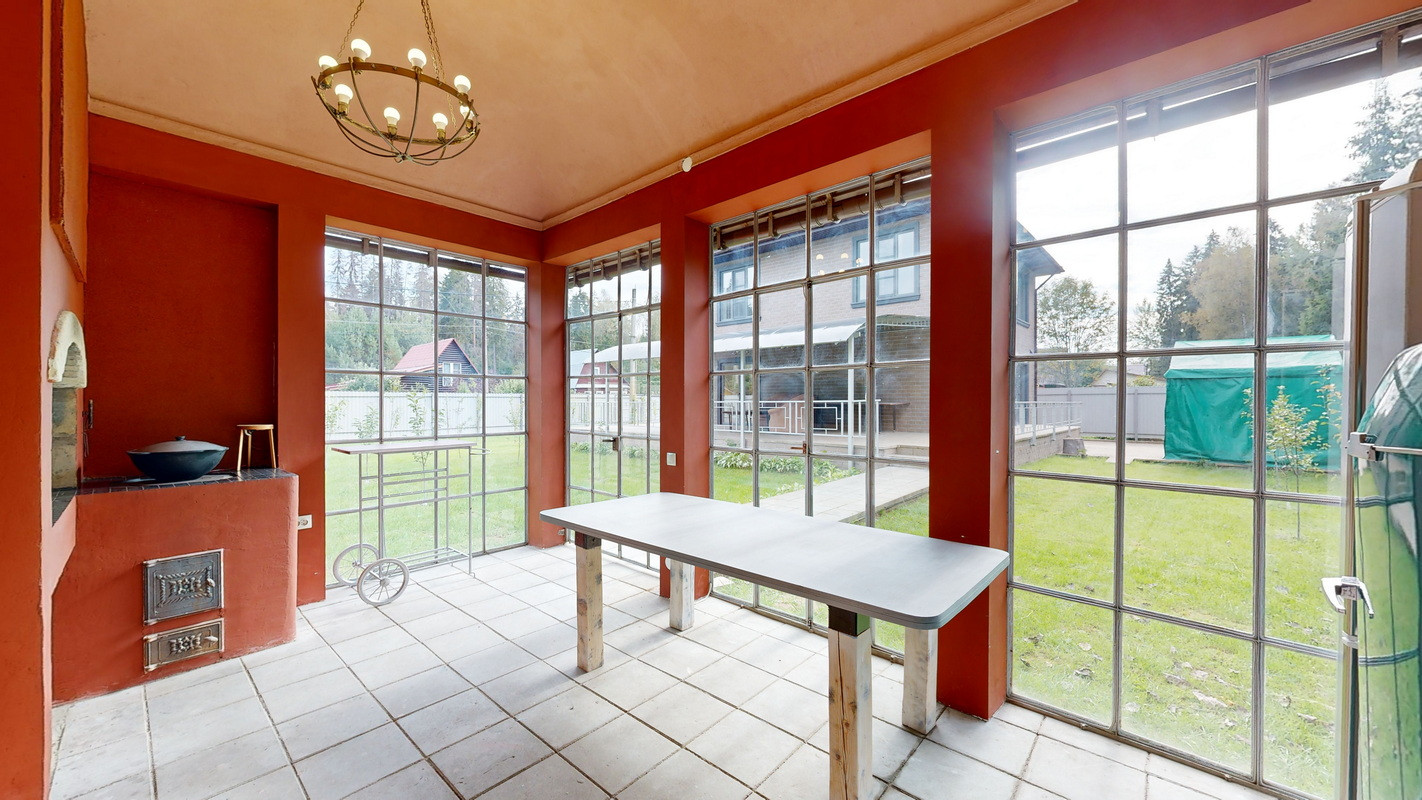 Выйдя из кухни, вы попадаете на крытую террасу, на которой прохладно летом, так-как она обращена на северо-запад, ее не заливает дождем и не засыпает снегом из-за внушительных размеров панорамной крыши. На террасе вы найдете удобную мягкую мебель, большой круглый стол для завтрака, телевизор и всепогодный обеденный стол на колесиках, который можно установить, где угодно.