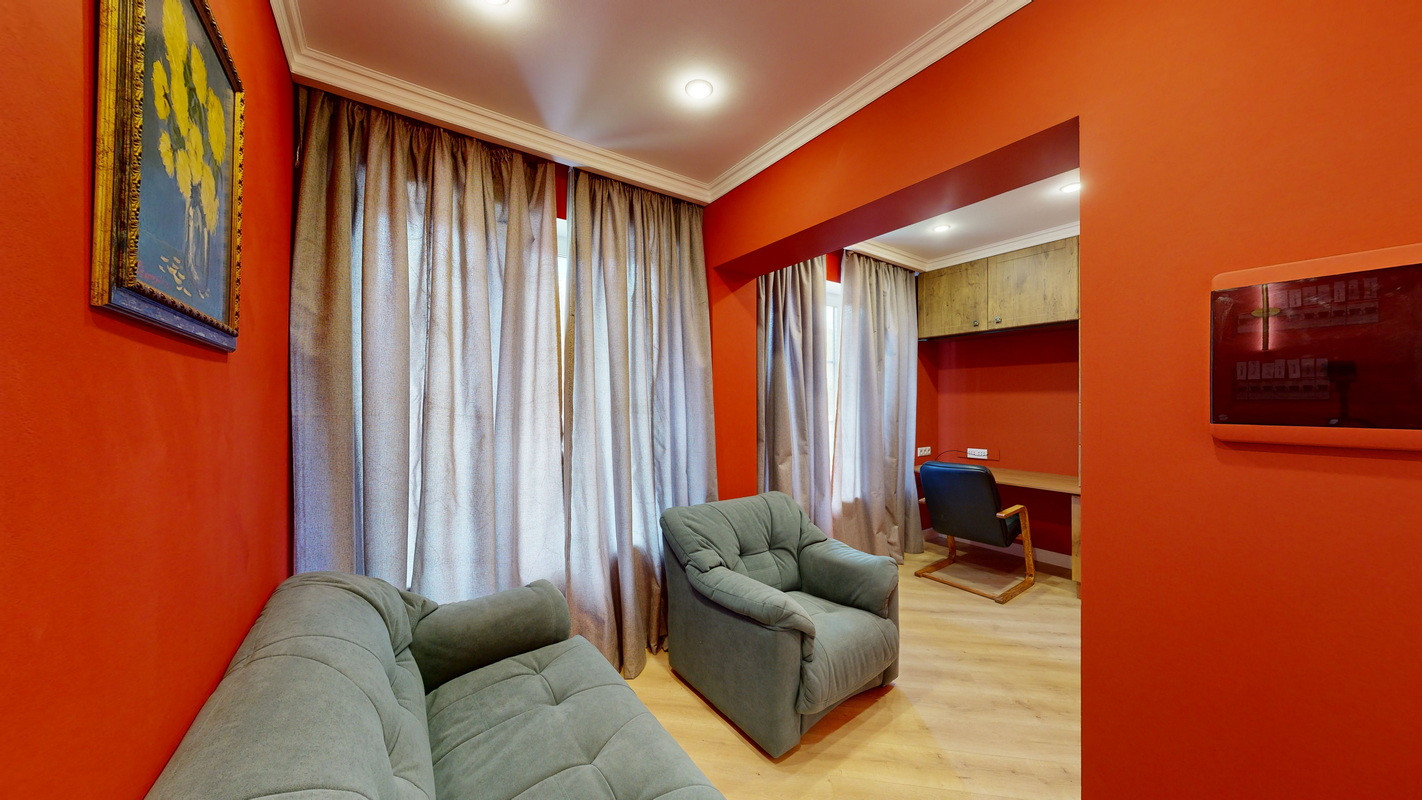 Просторный кабинет с панорамными окнами, удобная рабочая зона с вместительным шкафом, раскладной диван и кресло для отдыха.