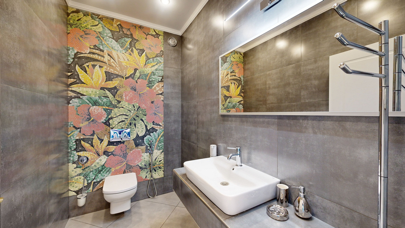 Просторный санузел, оснащенный подвесным унитазом с гигиеническим душем и накладной раковиной.