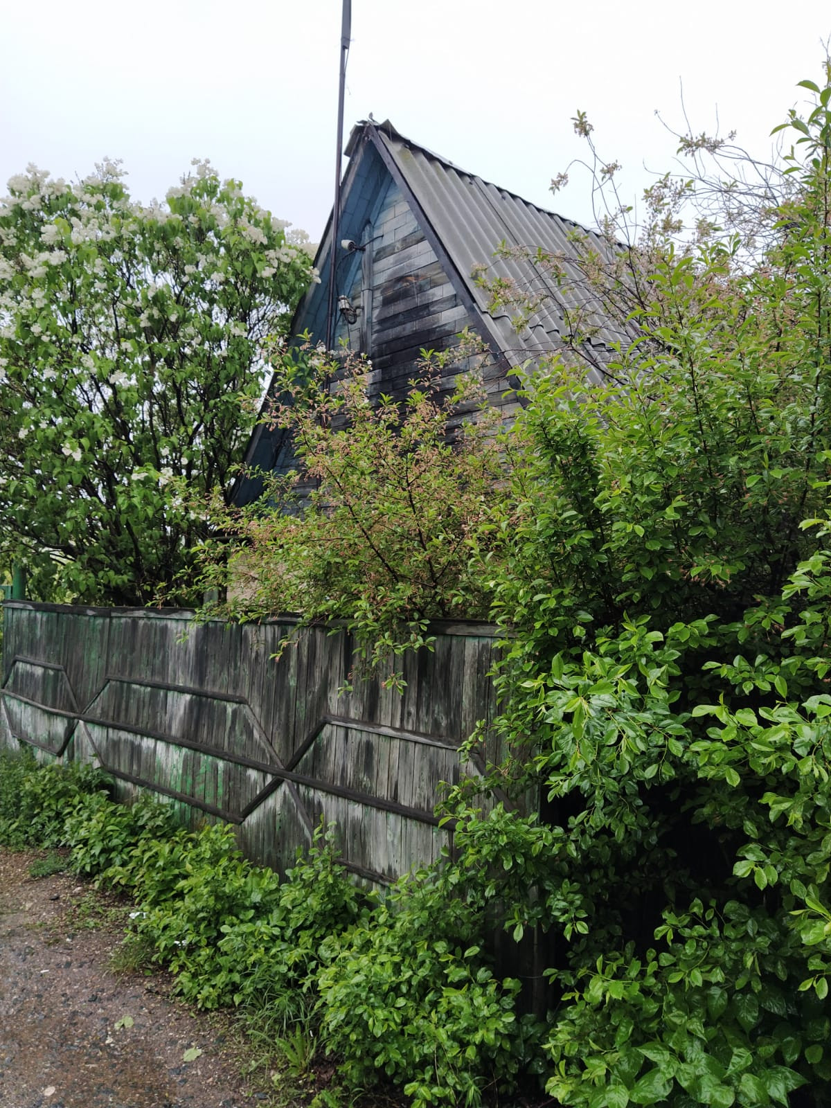 Дом оформлен как садовый. Построен из кирпича. Высокий фундамент. В нем две комнаты. Крыша-шифер. Так же есть большой навес-беседка рядом с домом.