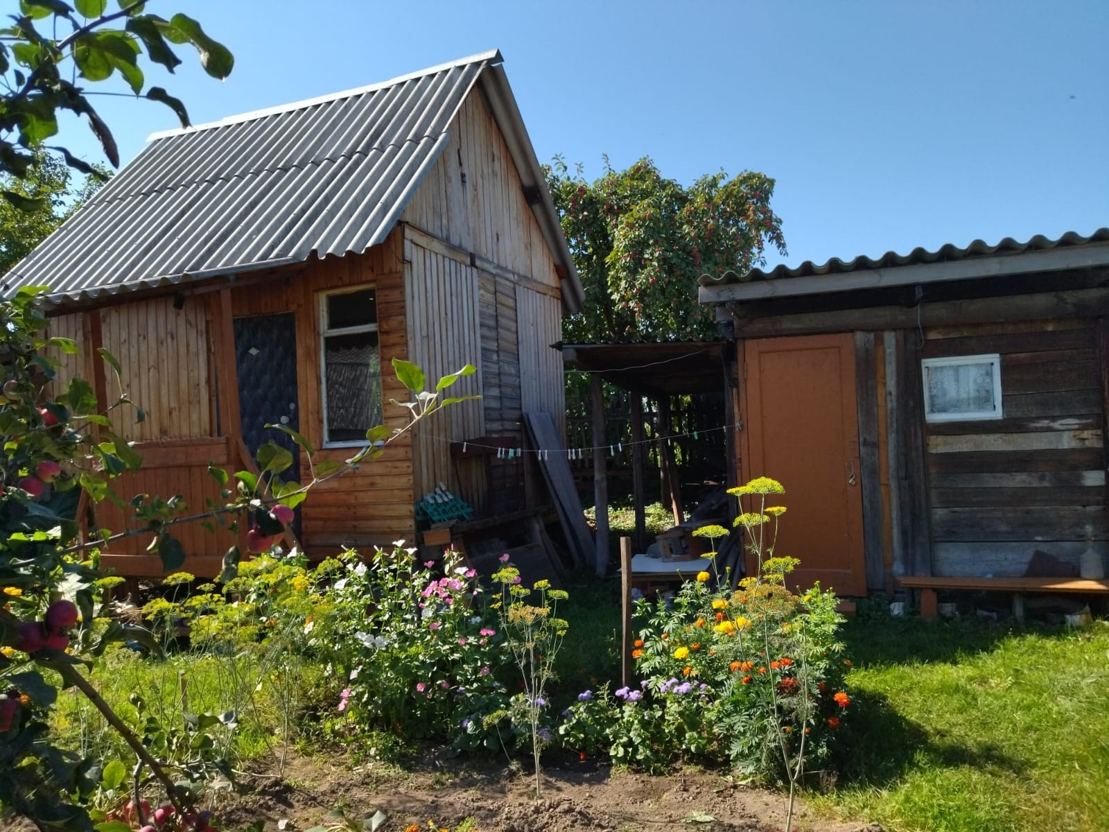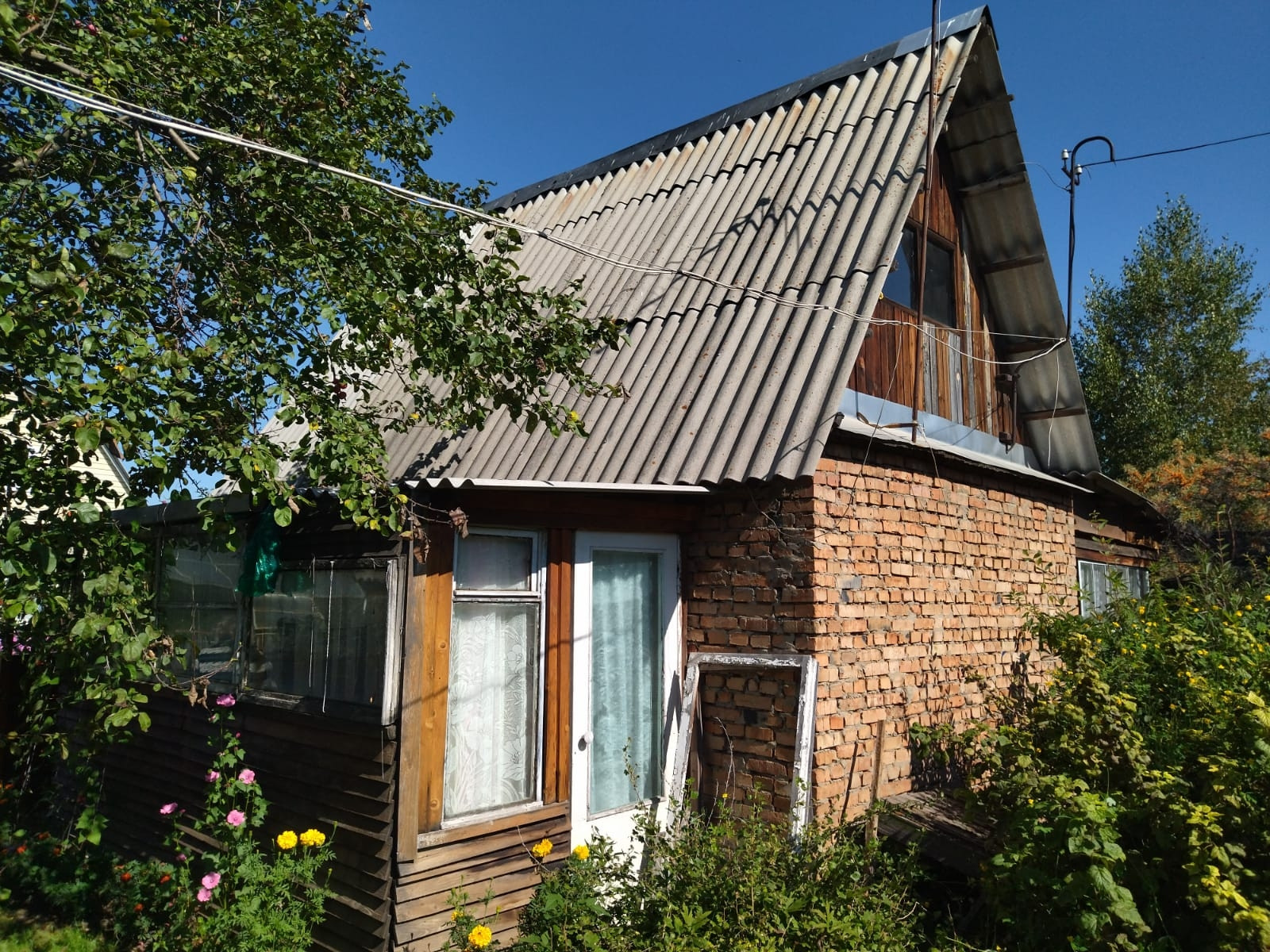 На участке 6 соток стоит кирпичный домик, хорошая теплая банька, если вы любите собираться с друзьями, для гостей построен гостевой домик, где они могут переночевать. Все огорожено, свет вода все круглый год, на участке большое количество насаждений. Рядом озеро, уточки плавают. Свежий воздух, в сезон ходит автобус, есть круглогодичный магазин, много семей живут в обществе постоянно.