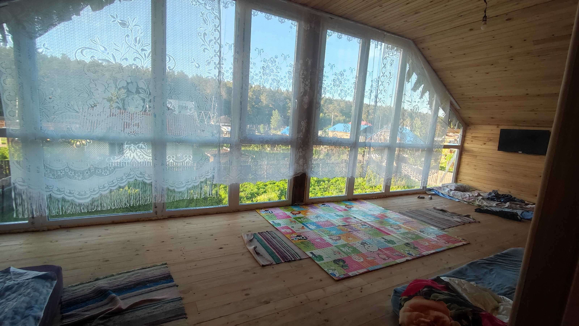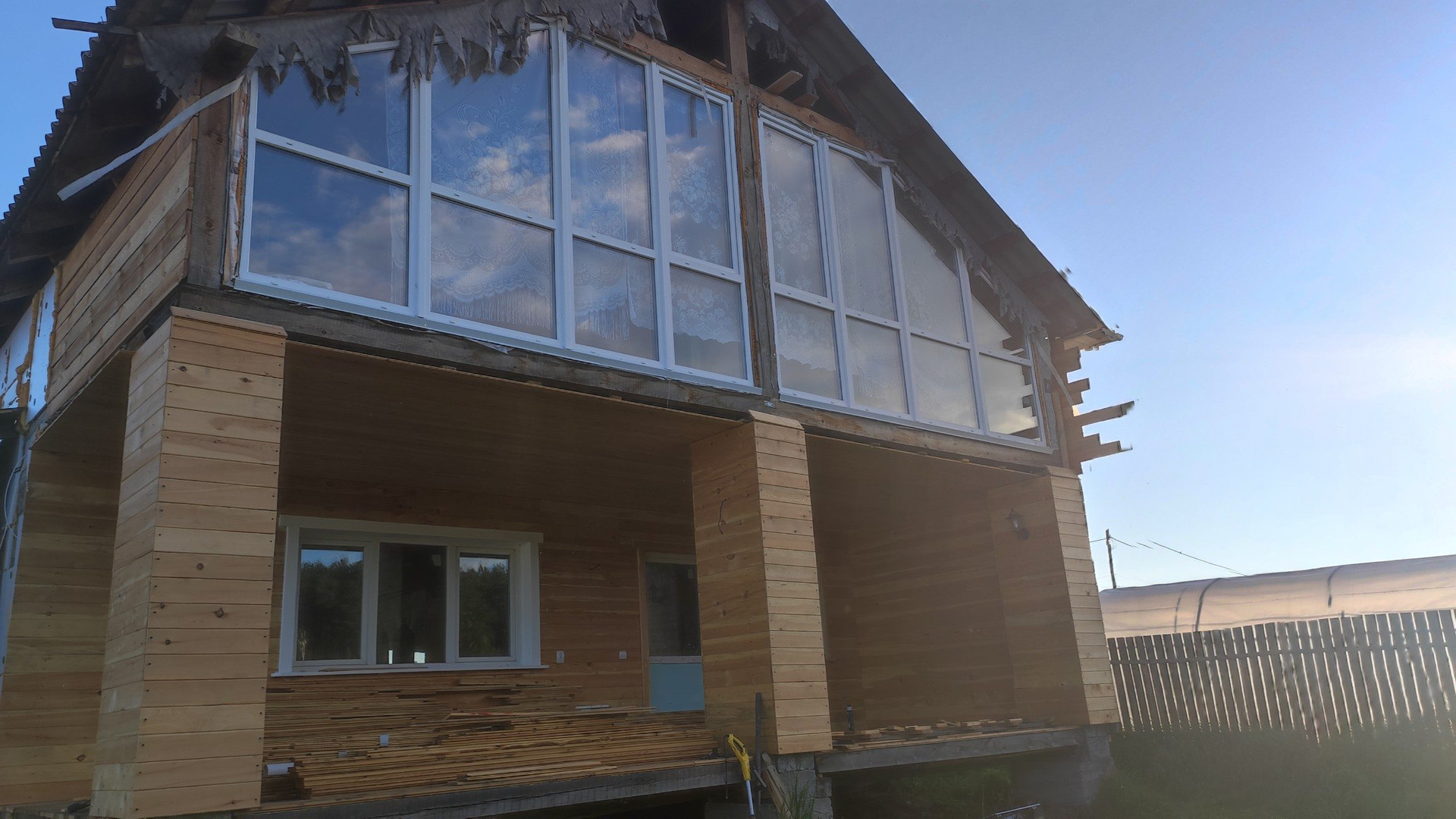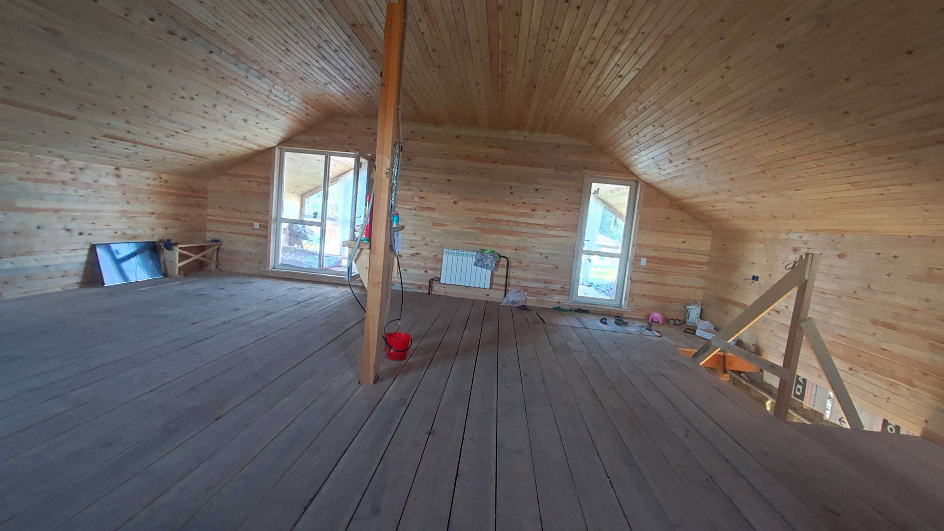На первом этаже большая кухня-столовая+гостиная и санузел. Второй этаж уже обшит деревом и плюс тёплая терасса с панорамными окнами в пол. Просто красота.