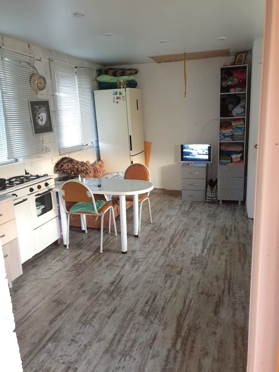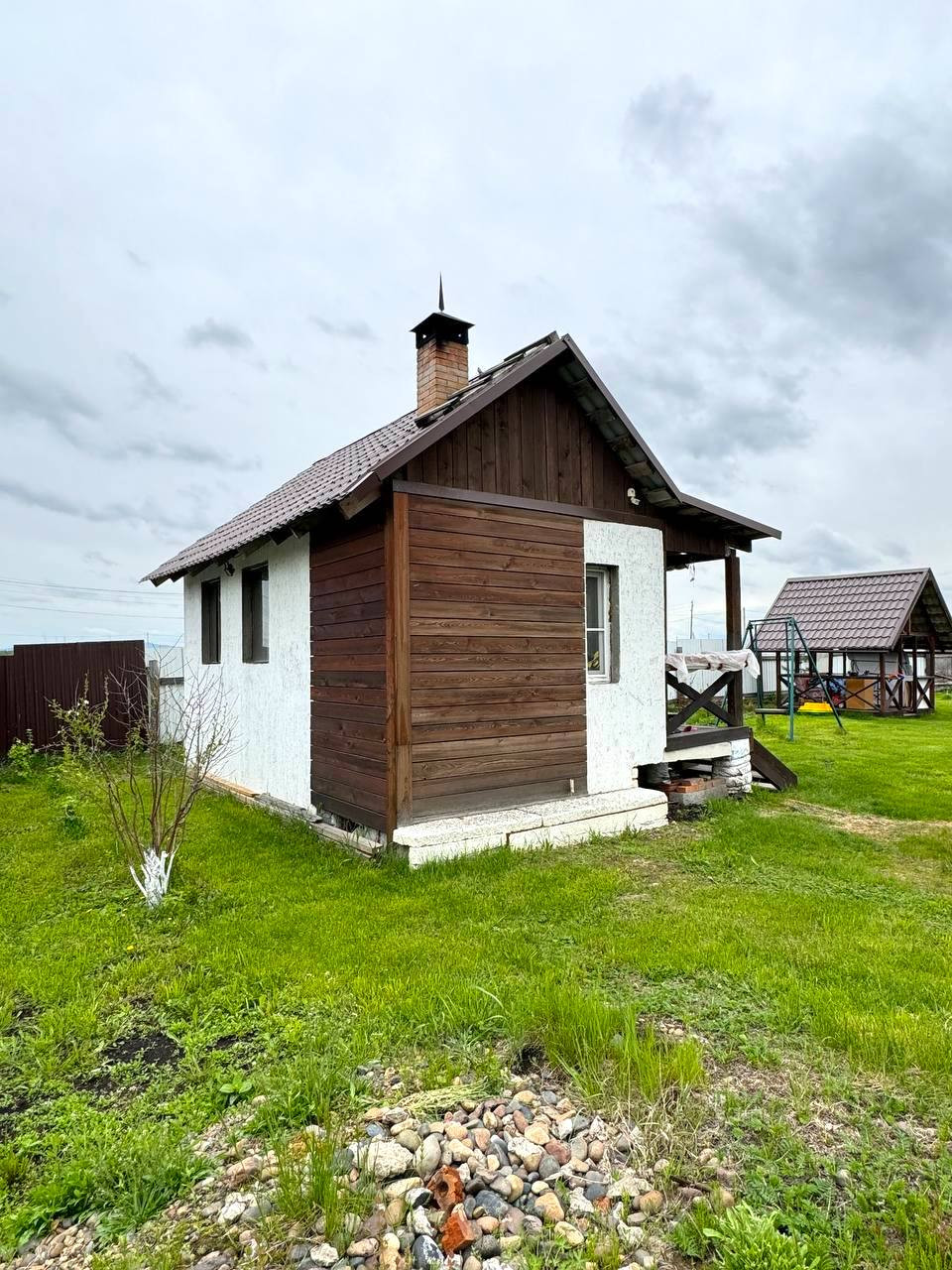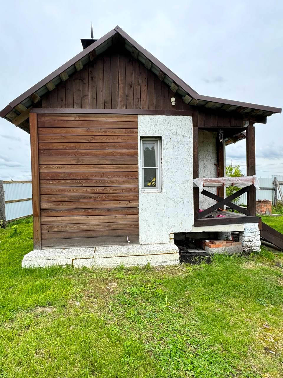 Внутри сделан косметический ремонт, окна ПВХ, натяжной потолок, на полу ламинат, а также установлена печь из кирпича.