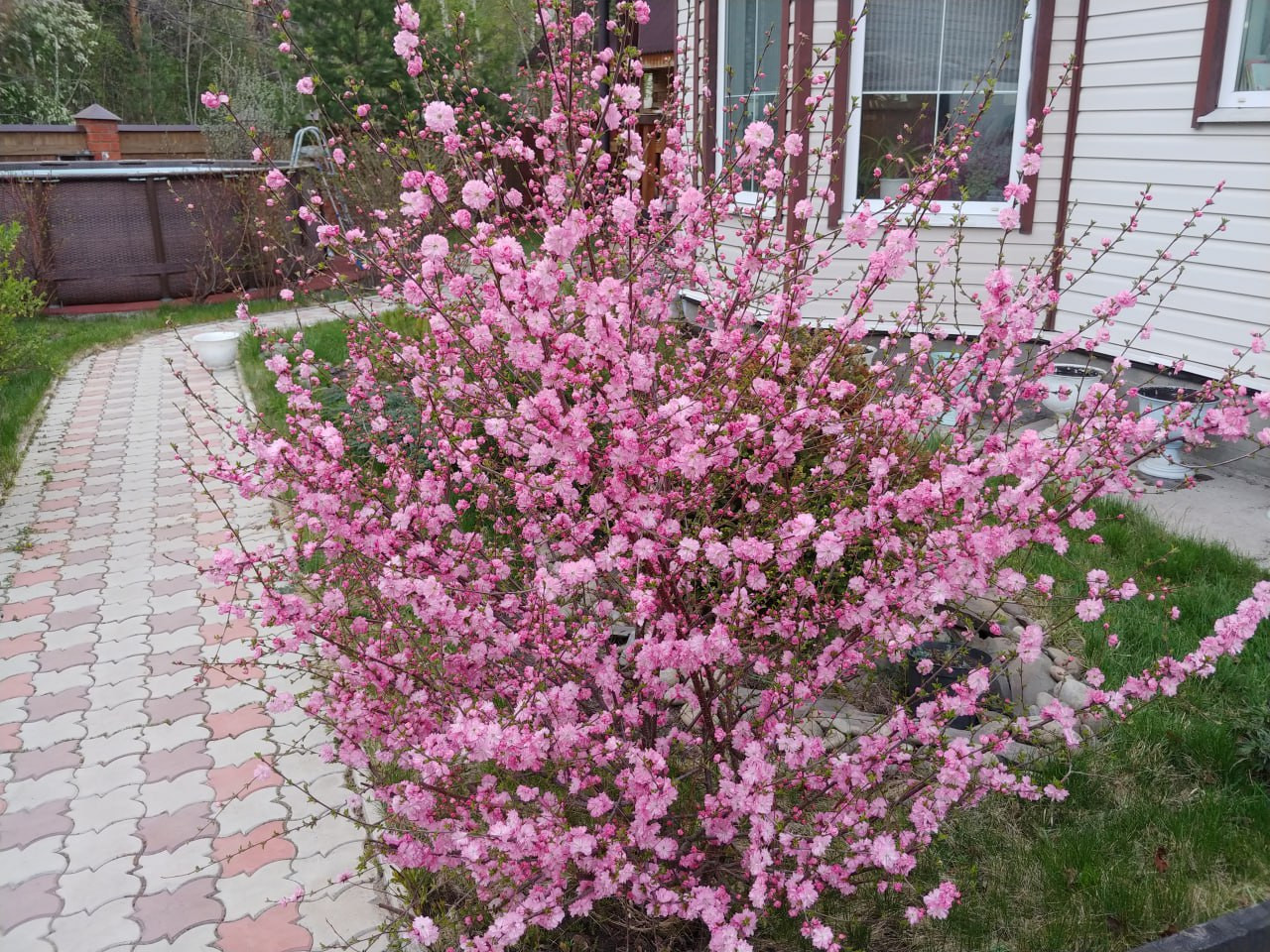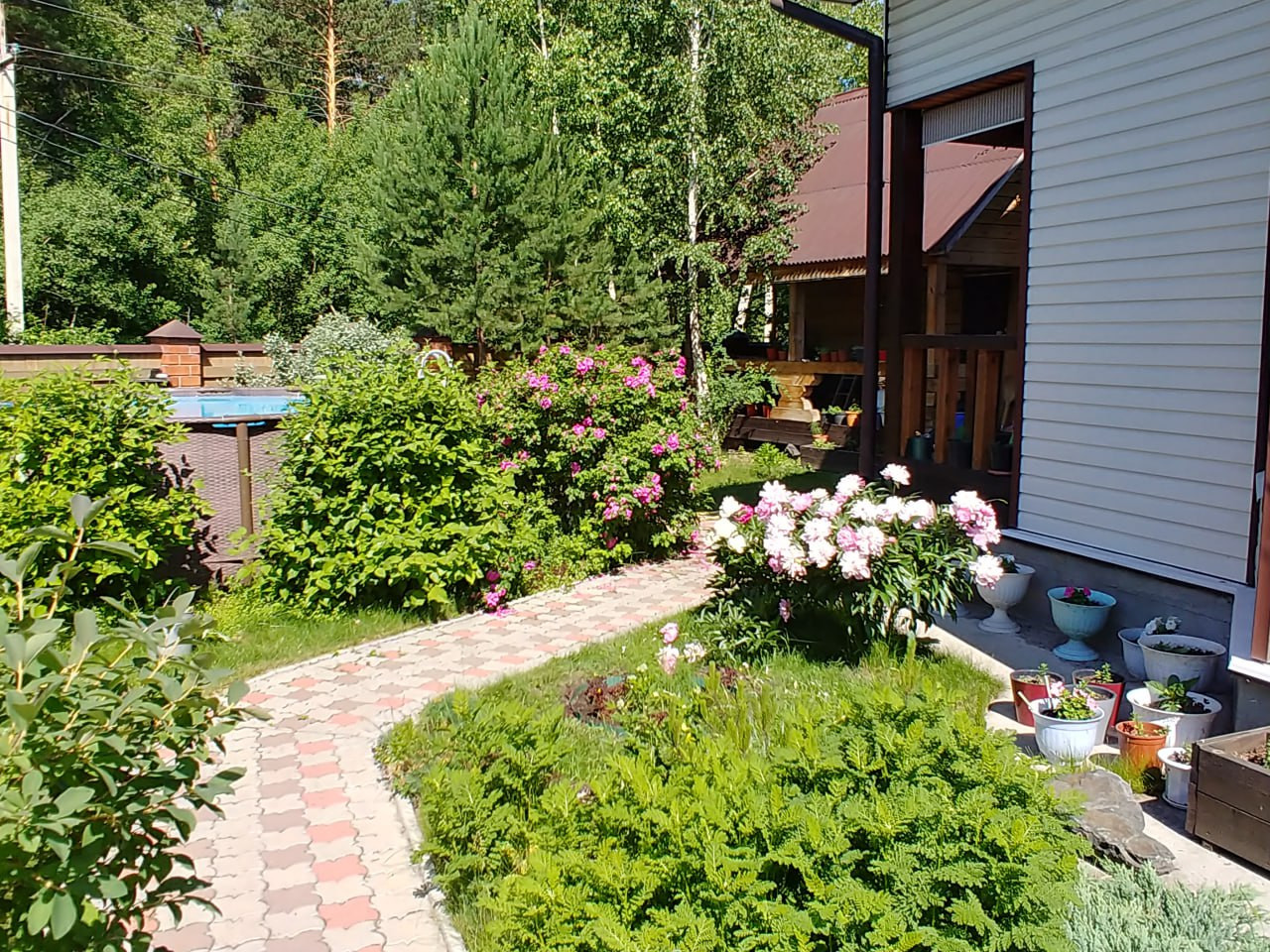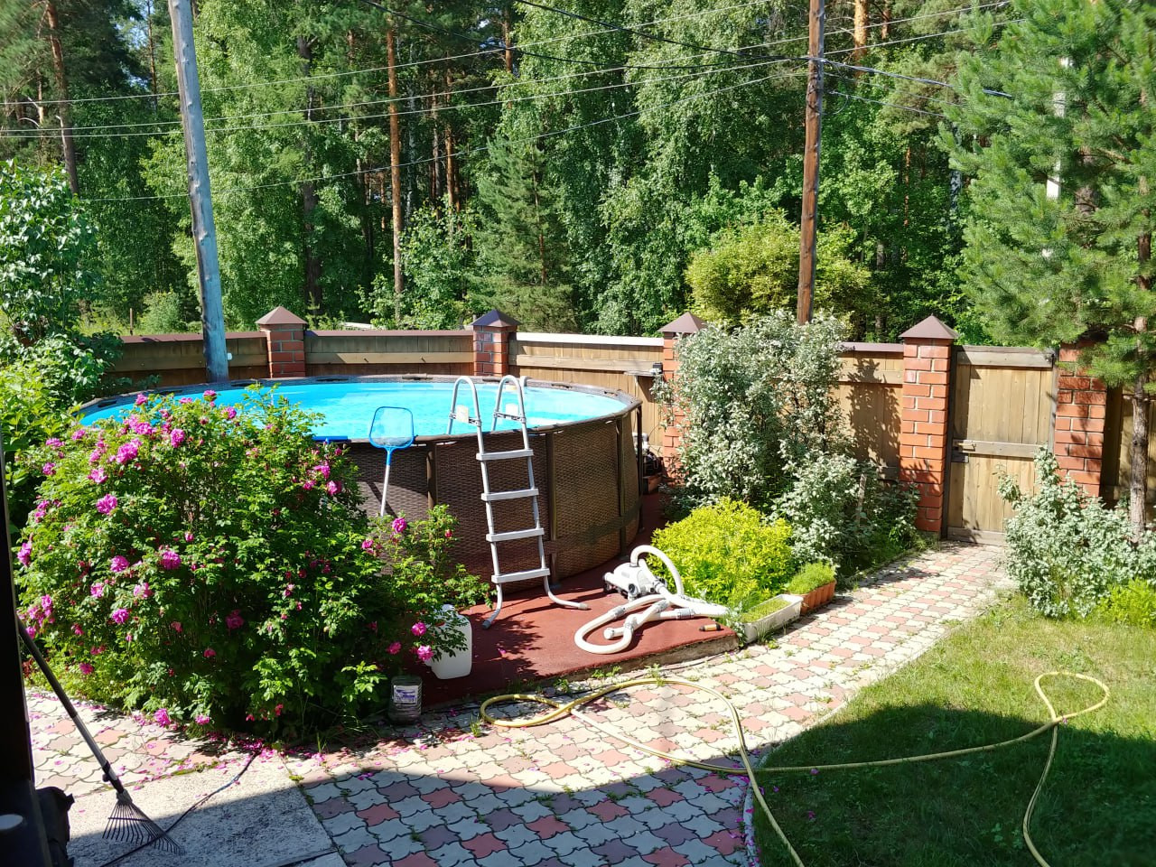 Есть большой бассейн на свежем воздухе окружённый самыми разными растениями,