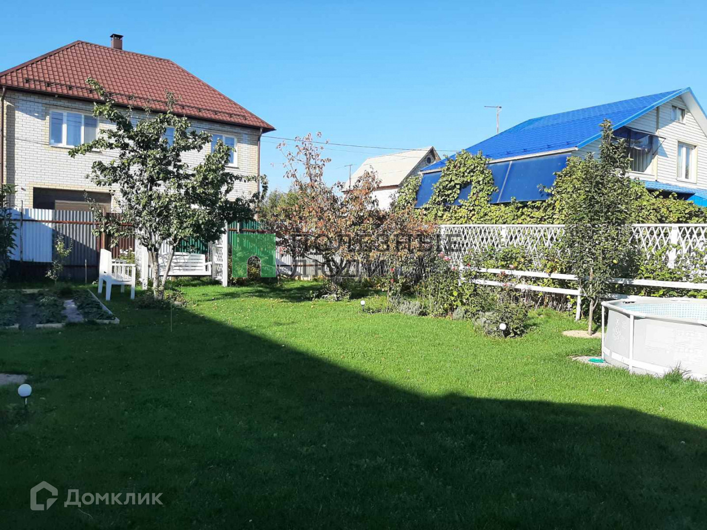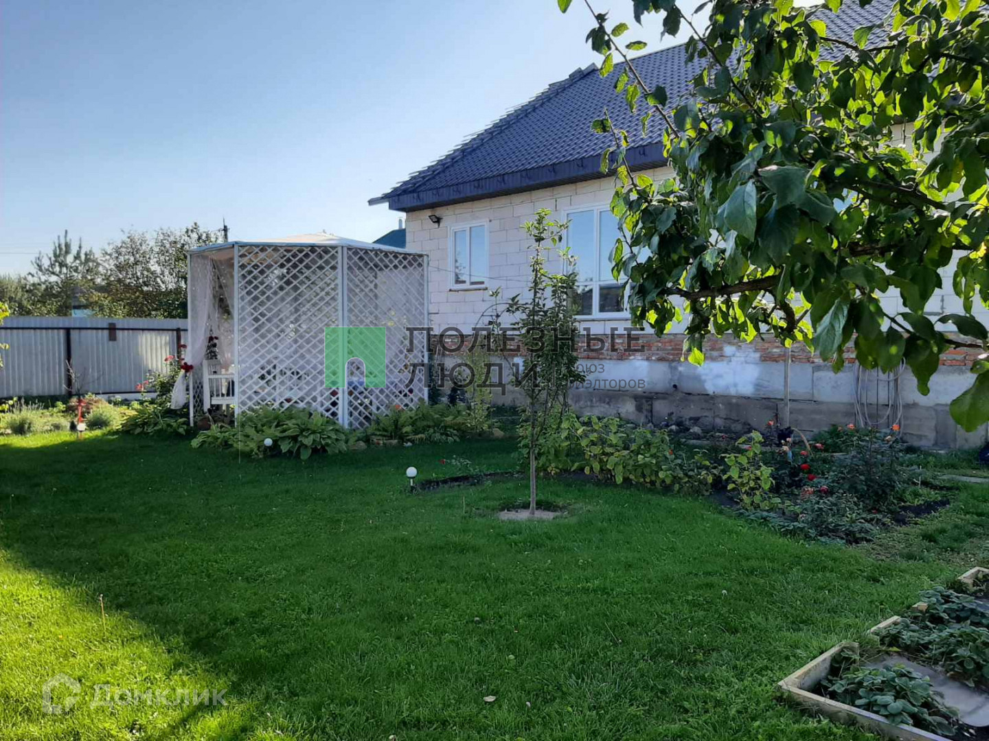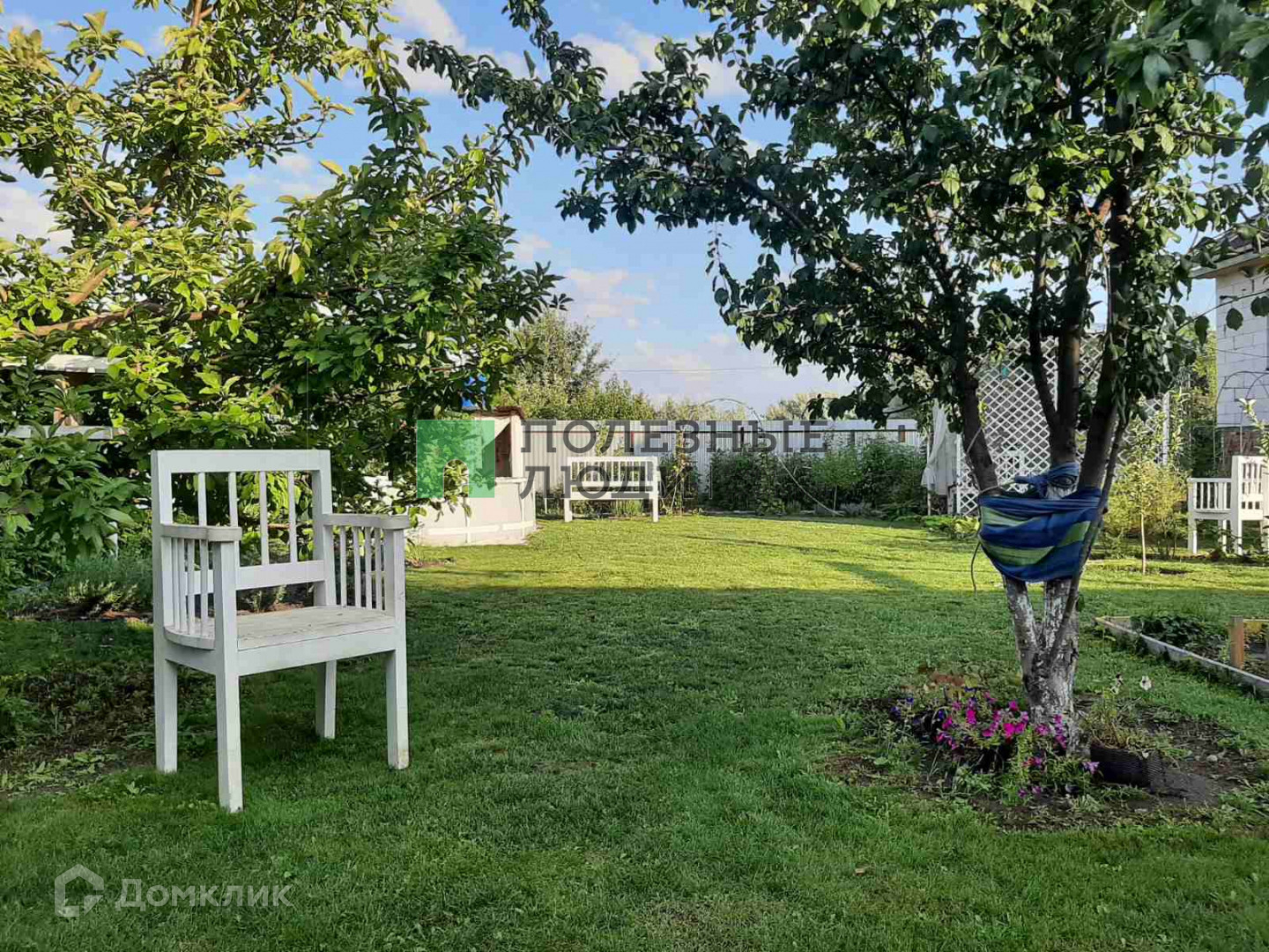 Участок засажен газоном и деревьями.