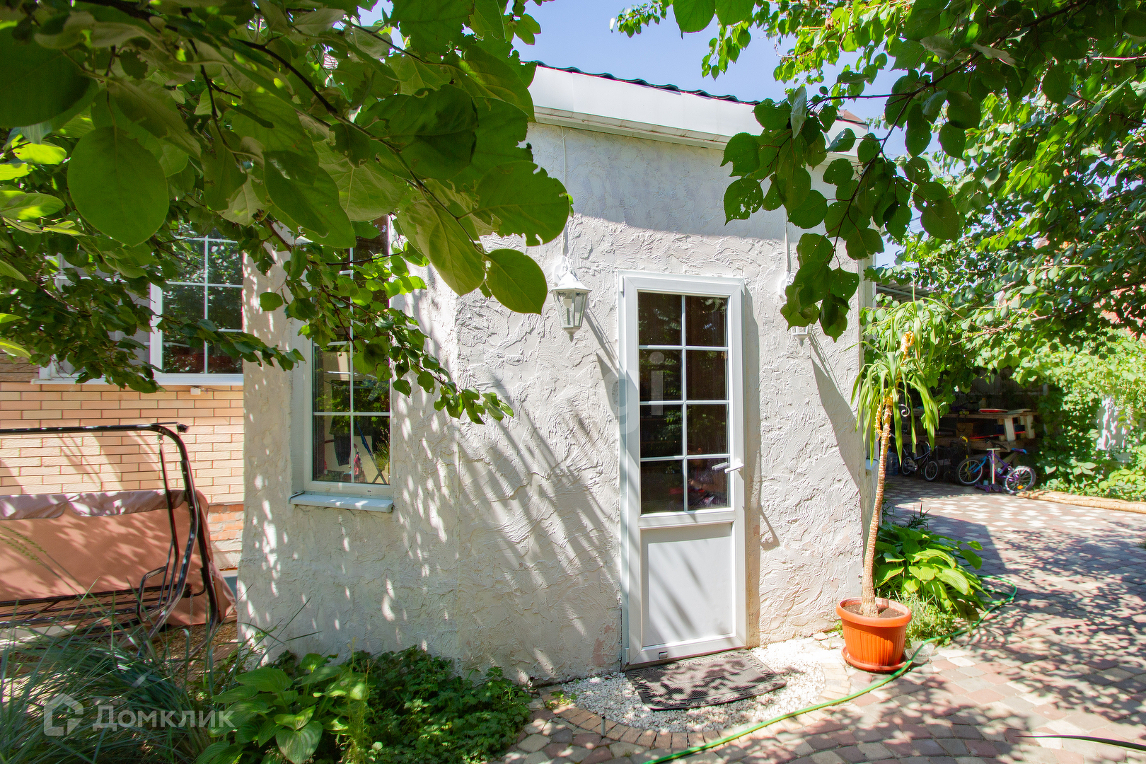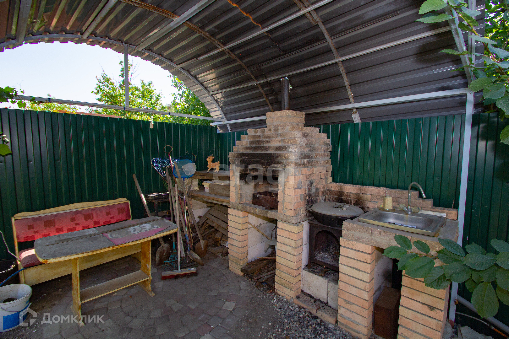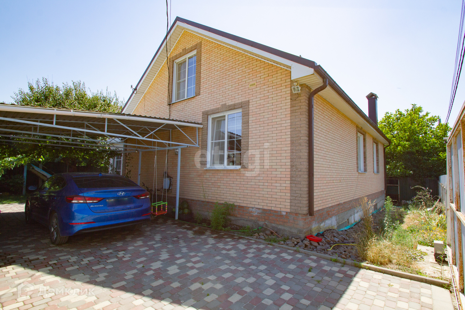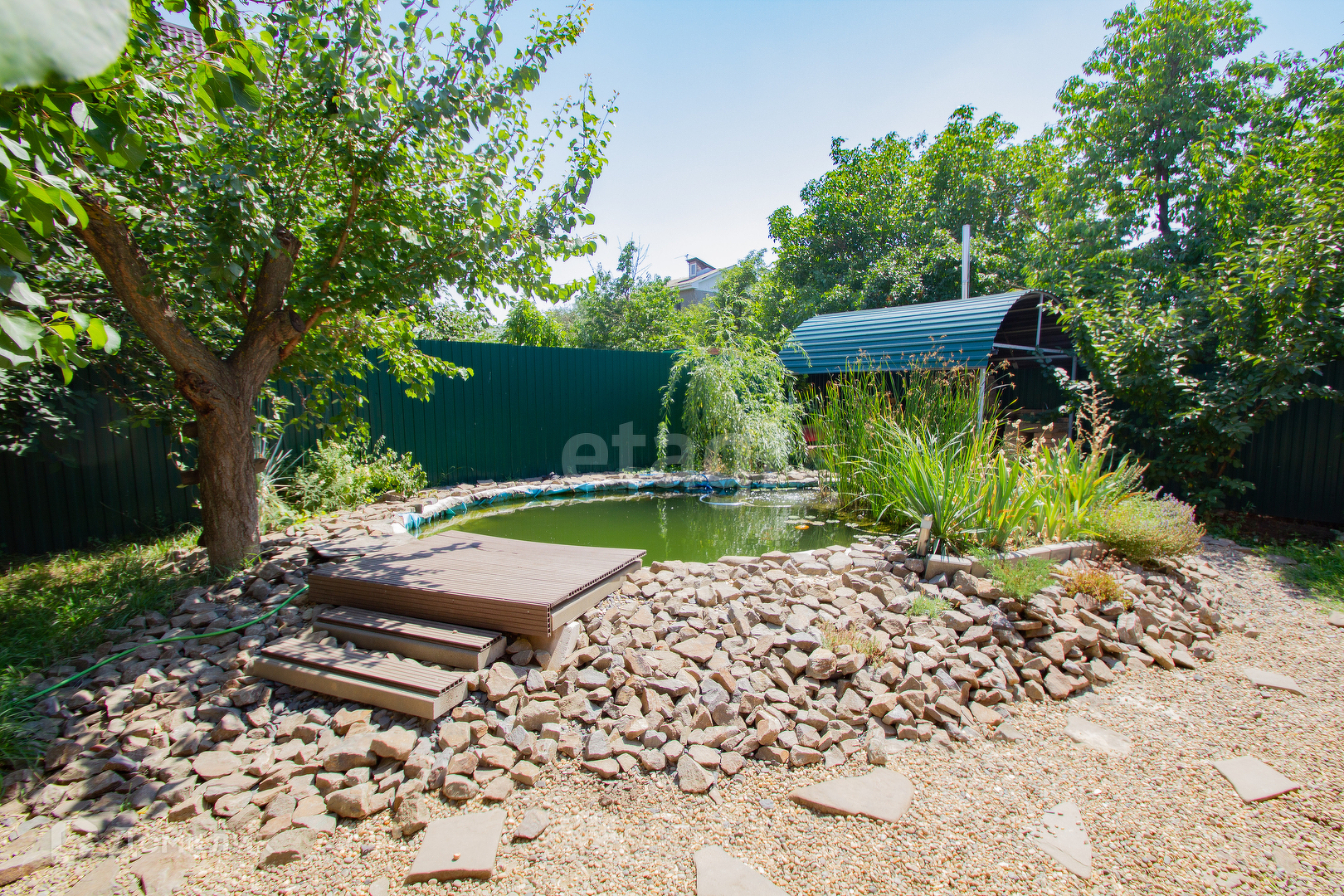 Участок 5 соток ухожен и зонирован, есть навес под парковку 3 авто, плитка, газон и детская площадка; вальер для собаки ; хоз.постройки; цветочные клумбы; плавательный ПРУД 12 м3., в котором живут рыбы.