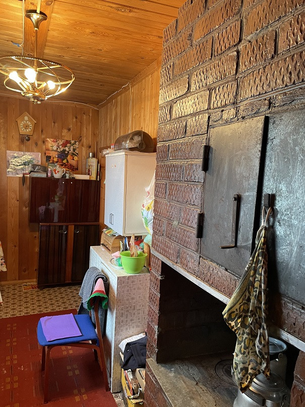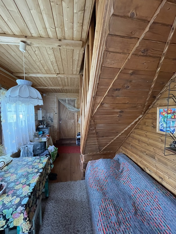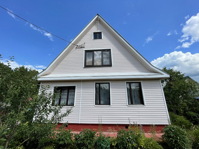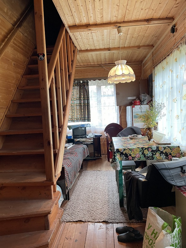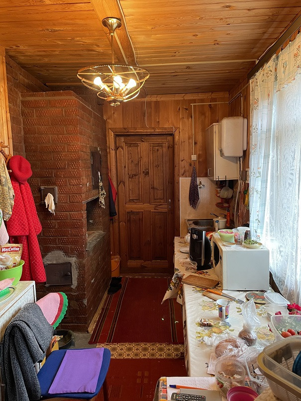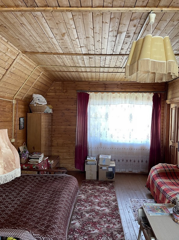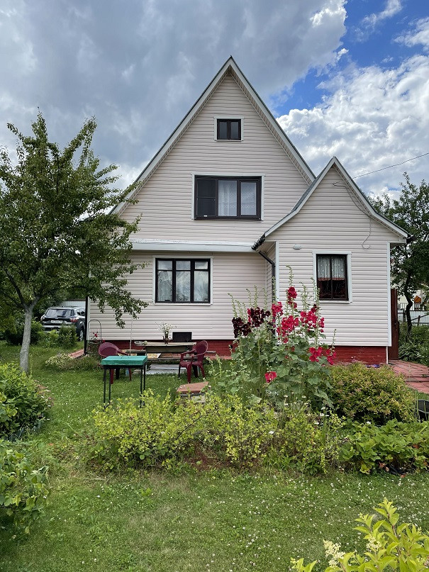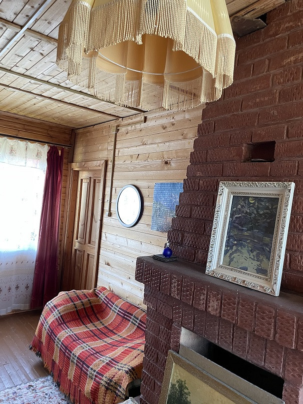 Дом на участке 7 соток, 2-х уровневый, площадь 1-го этажа 60м². Материал – бревно 25см, отделан снаружи сайдингом, изнутри отделан вагонкой. В доме есть печка, камины на 1-м и 2-м этаже. На 1-м этаже комната, кухня, терасса, прихожая, душ. Вода – скважина 7м, подаётся насосом. Есть два накопительных водонагревателя – в душе и на кухне.