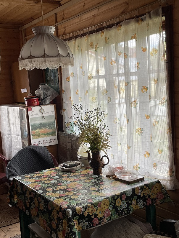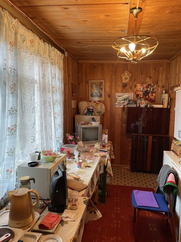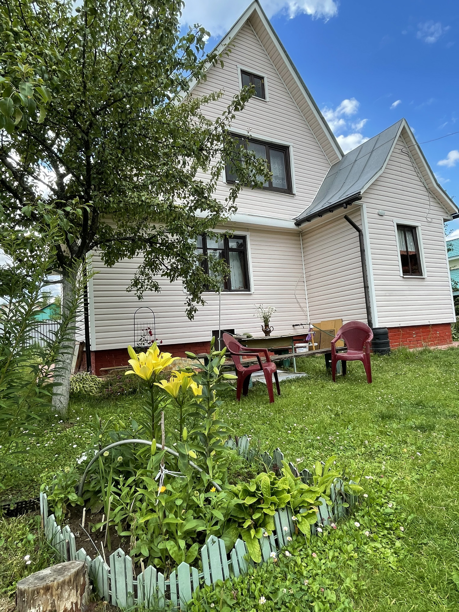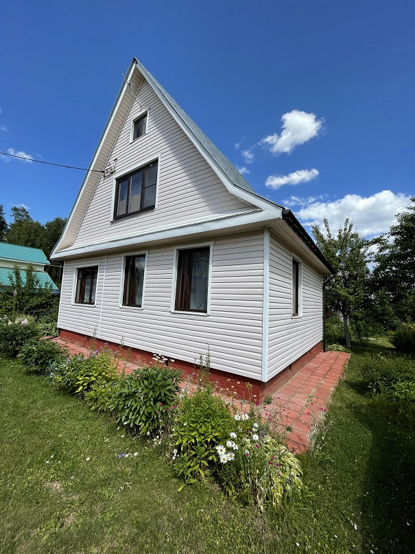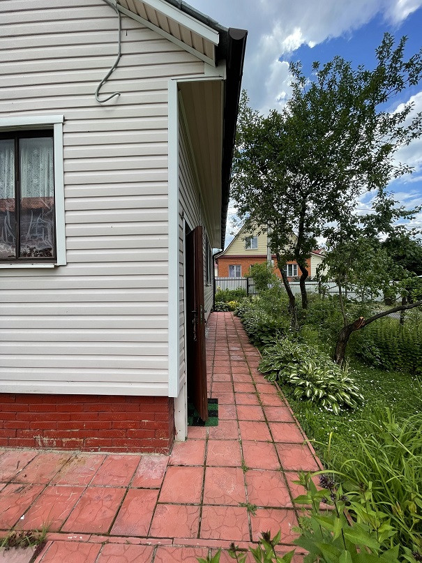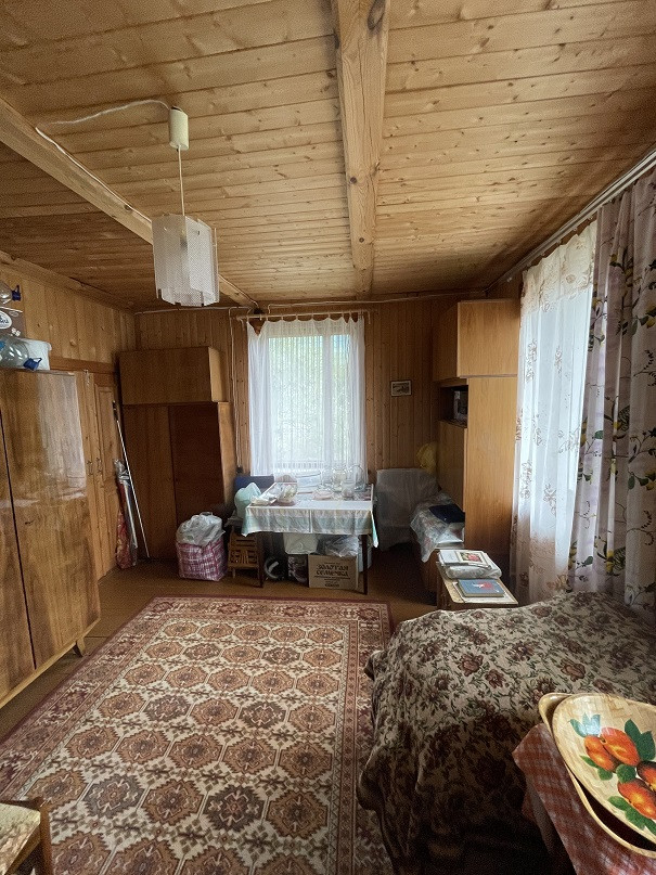 Дом на участке 7 соток, 2-х уровневый, площадь 1-го этажа 60м². Материал – бревно 25см, отделан снаружи сайдингом, изнутри отделан вагонкой. В доме есть печка, камины на 1-м и 2-м этаже. На 1-м этаже комната, кухня, терасса, прихожая, душ. Вода – скважина 7м, подаётся насосом. Есть два накопительных водонагревателя – в душе и на кухне.