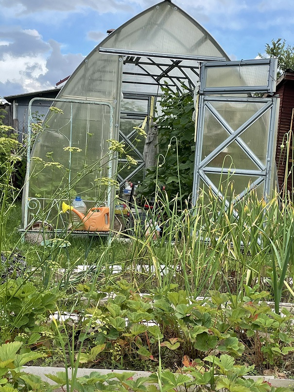 Участок сухой, огорожен по всему периметру, имеются плодовые деревья, кустарники, теплица, клубника, цветы.