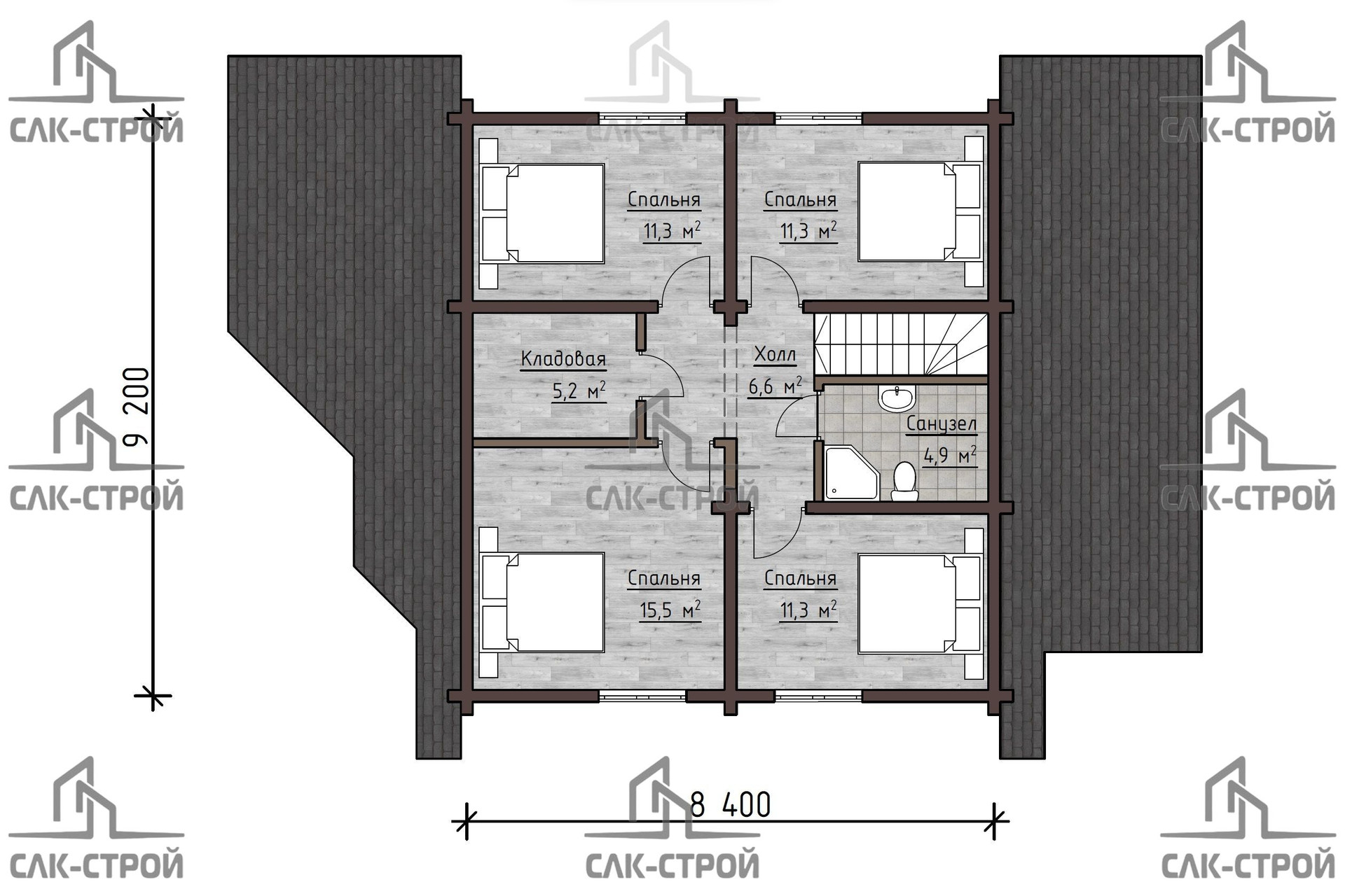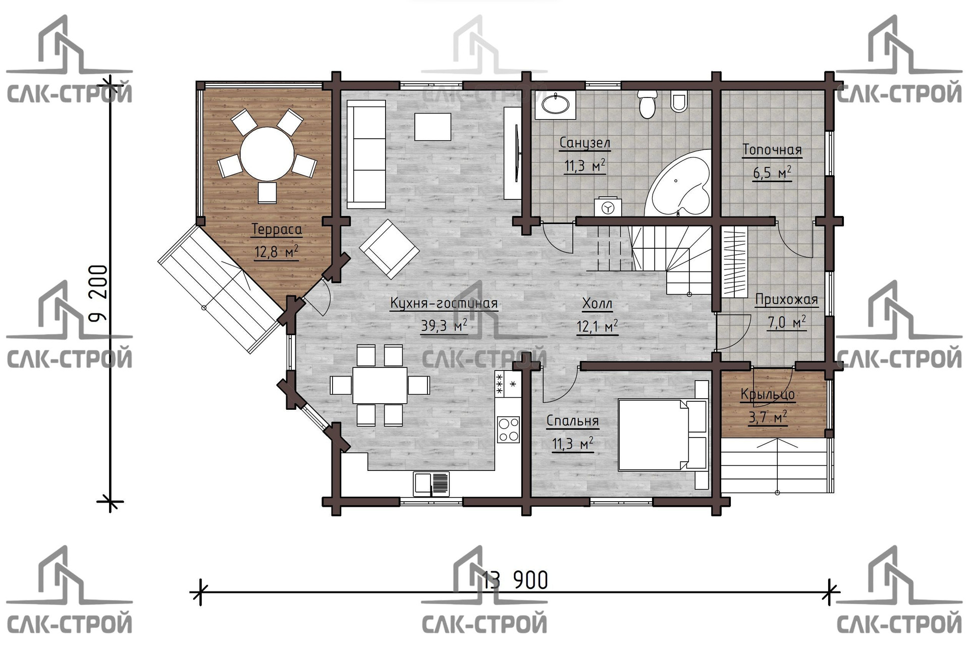 Брусовой дом общей площадью 170,1 квадратных метров - это идеальный вариант для тех, кто хочет создать уютное и комфортное жилье. На первом этаже дома располагается просторная кухня-гостиная, а также спальня, санузел и шикарная терраса. На втором этаже находятся четыре спальни и еще один санузел.