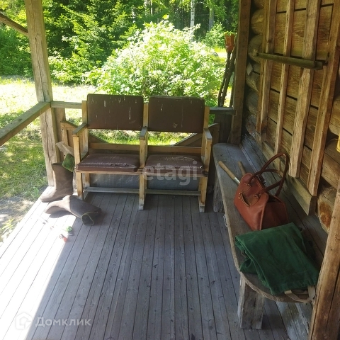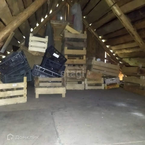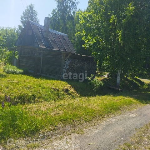 На участке небольшой домик из бревна, пристроен большой сарай.