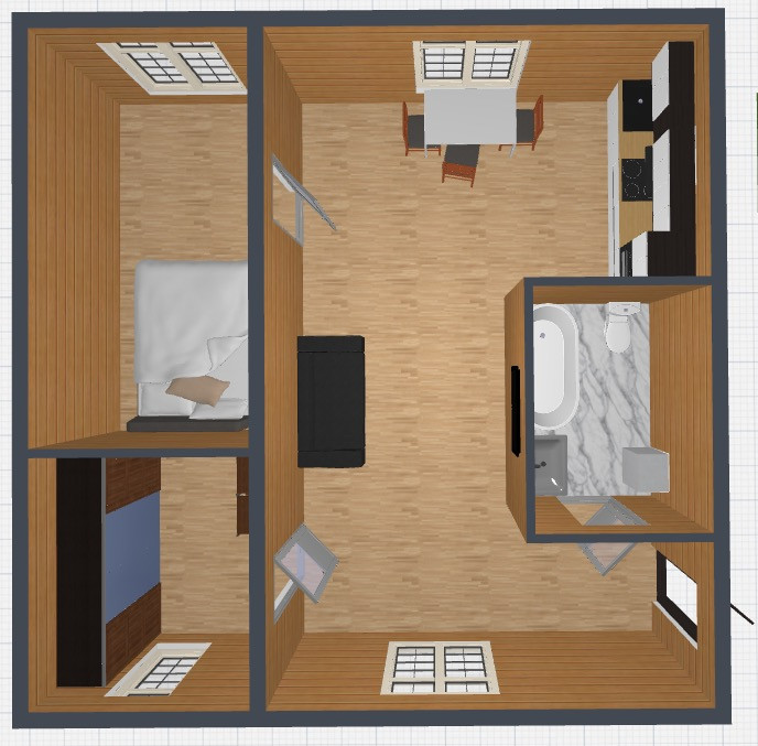 Три последние фотографии - план дома, с примерной расстановкой мебели
