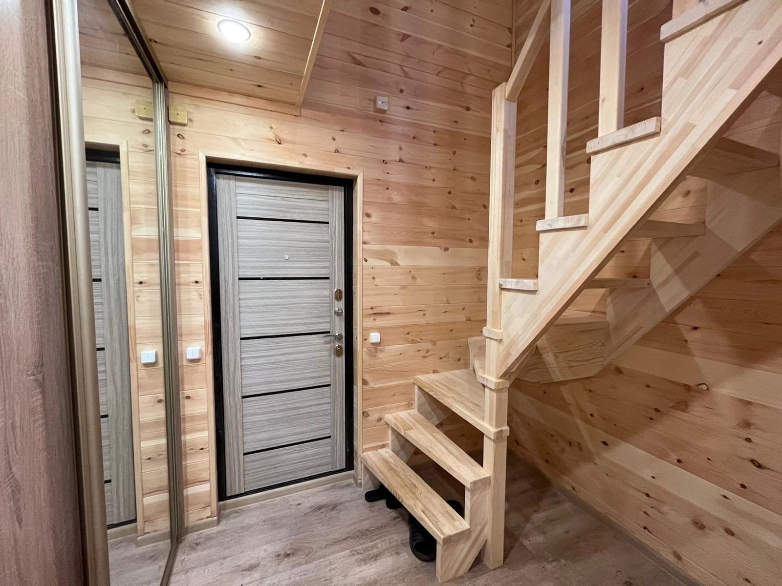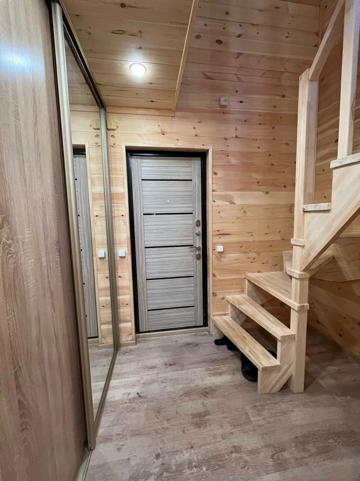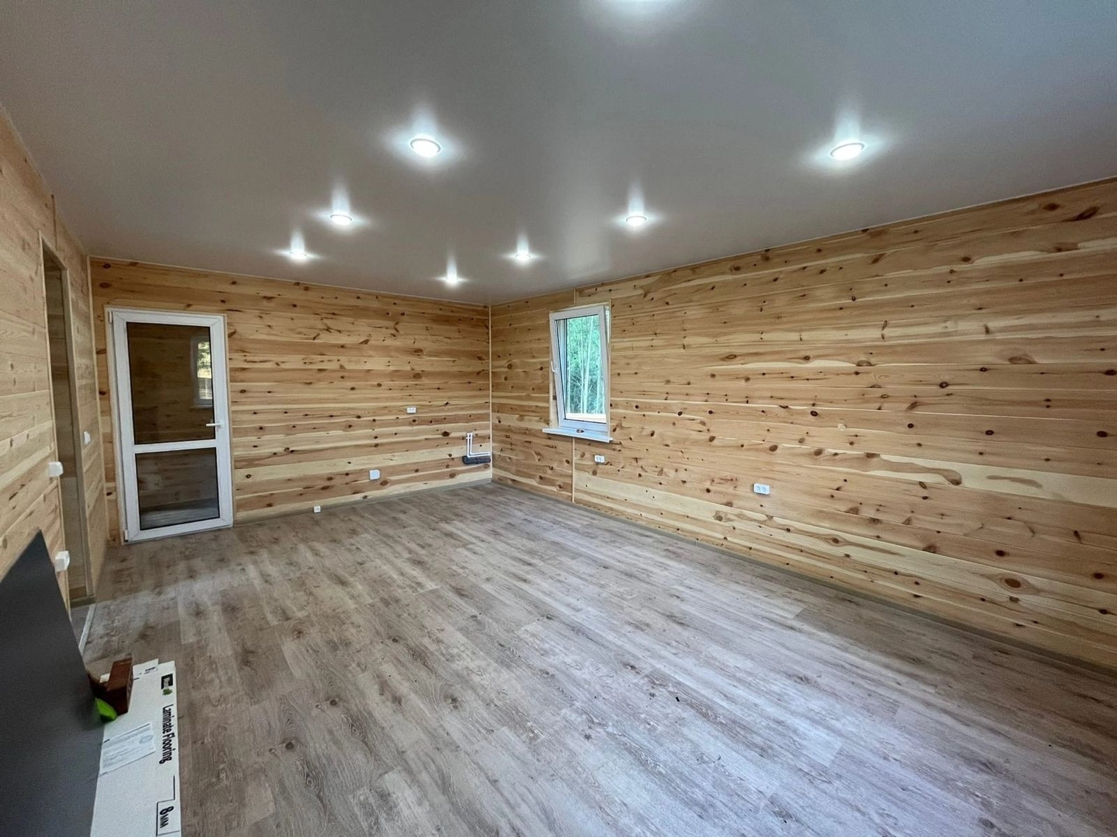 * Внутренняя отделка - евровагонка (обработана пропиткой), потолки натяжные с точечным освещением, пол - ламинат, межкомнатные двери, 5ти камерные окна, встроенная мебель. Хорошая, качественная проводка (ГОСТ 15 квт 3 фазы). Установлен санфаянс - унитаз, душевая, раковина, водонагреватель.