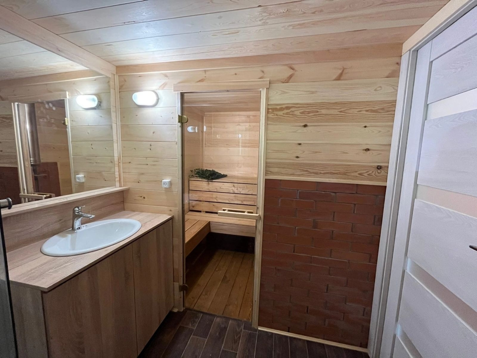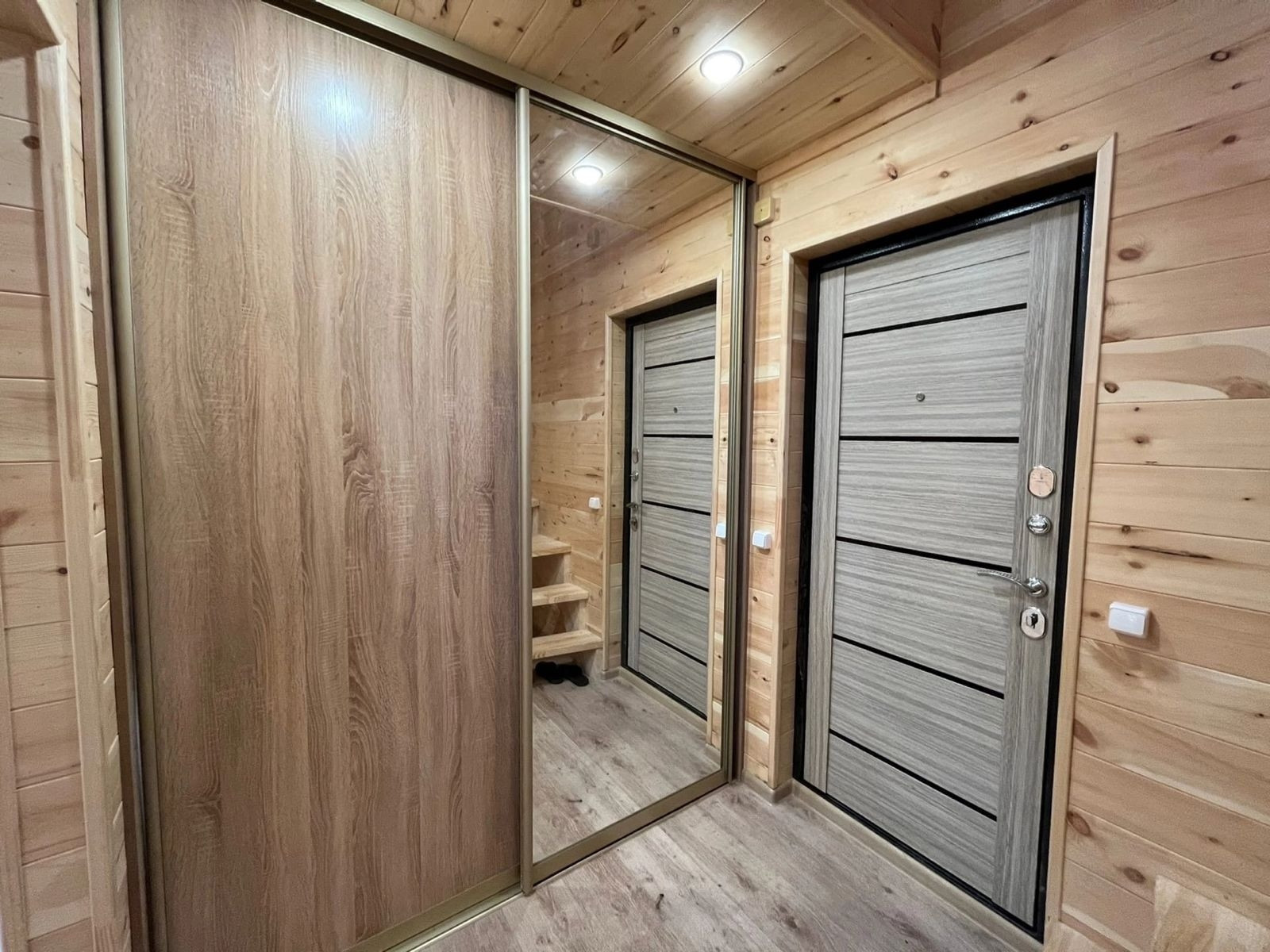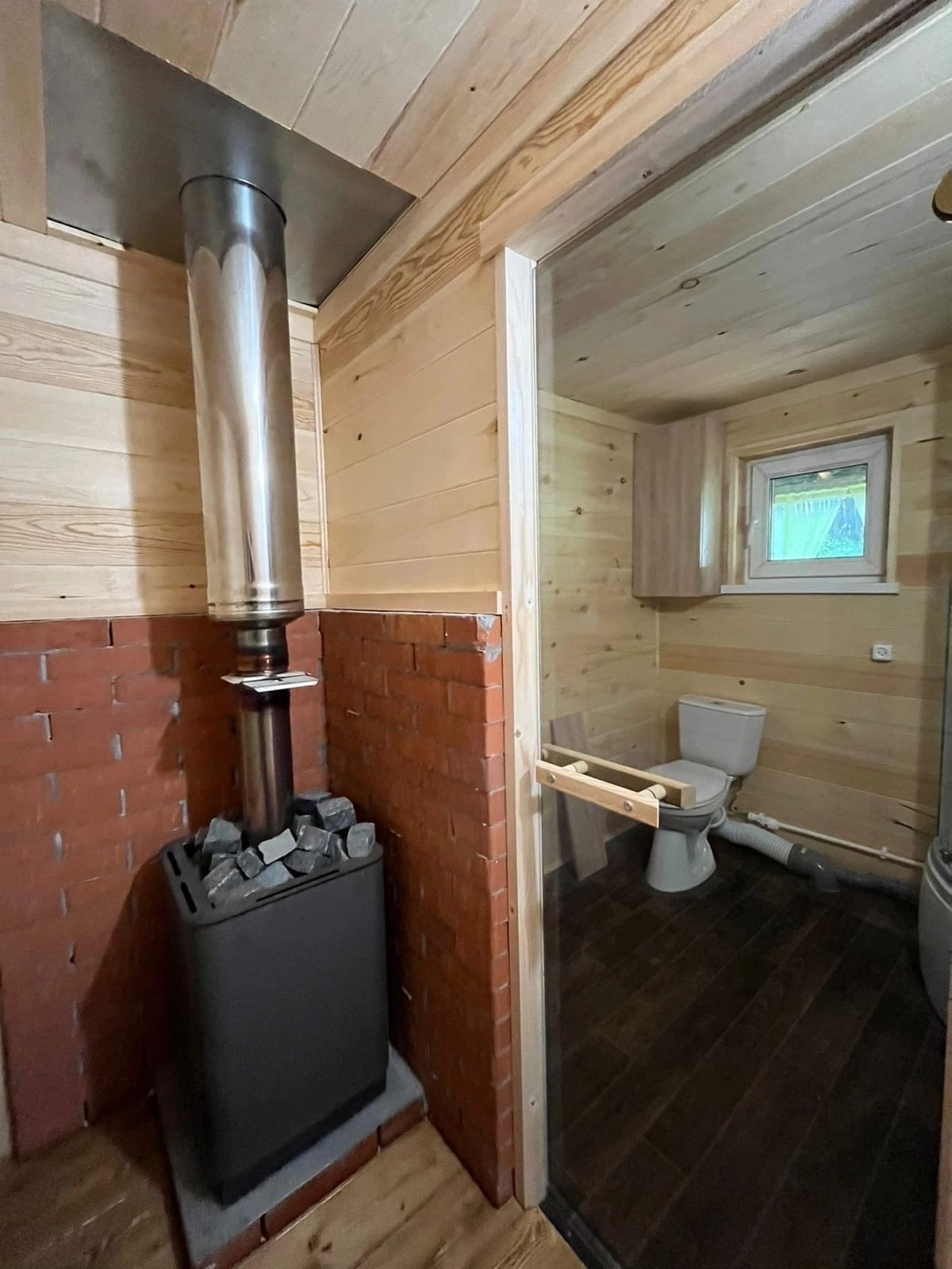 * Внутренняя отделка - евровагонка (обработана пропиткой), потолки натяжные с точечным освещением, пол - ламинат, межкомнатные двери, 5ти камерные окна, встроенная мебель. Хорошая, качественная проводка (ГОСТ 15 квт 3 фазы). Установлен санфаянс - унитаз, душевая, раковина, водонагреватель.