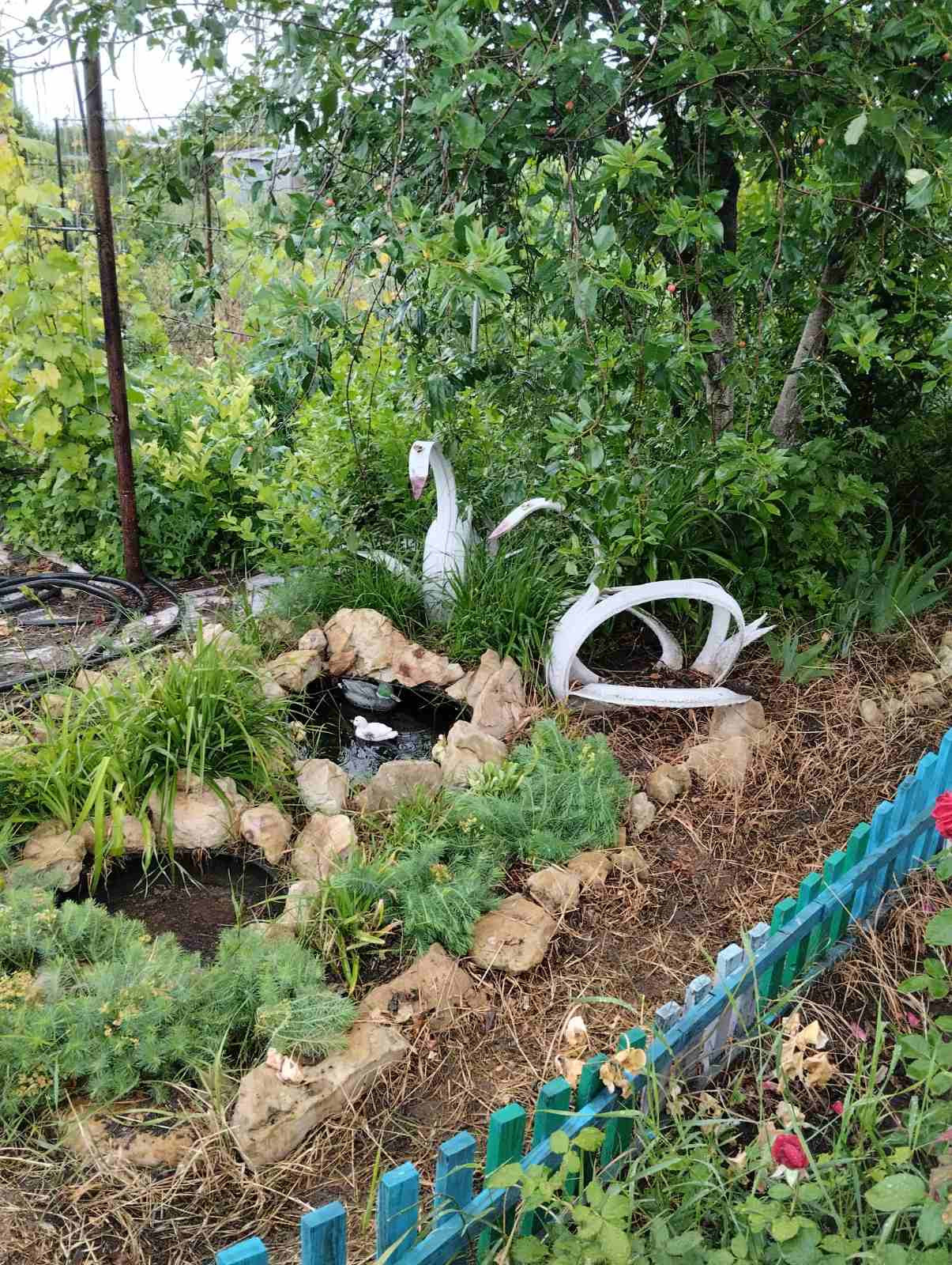 Детская площадка с качелями и песочницей, большая теплица для бассейна Возле домика декоративный пруд. Душ с водяным тенном, кладовка, туалет под одной крышей. Для запаса воды есть емкости.