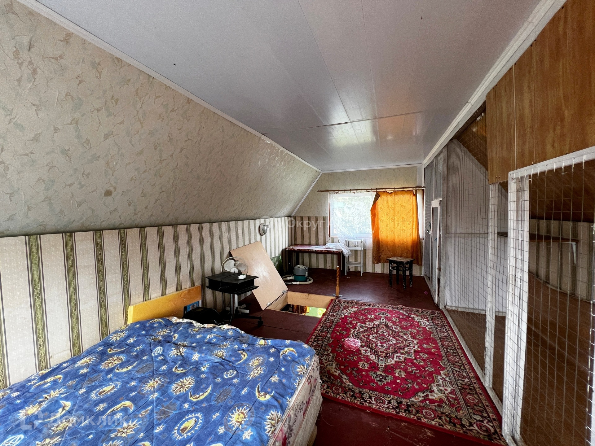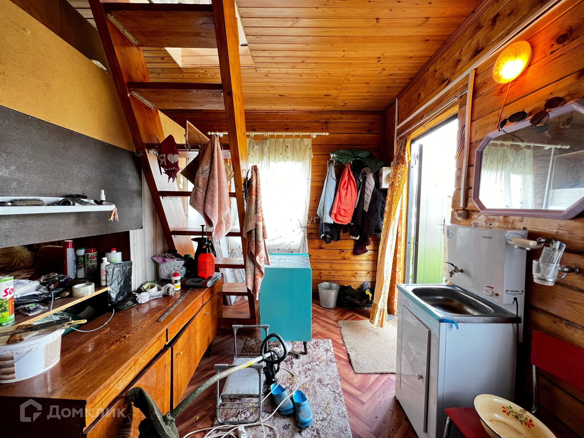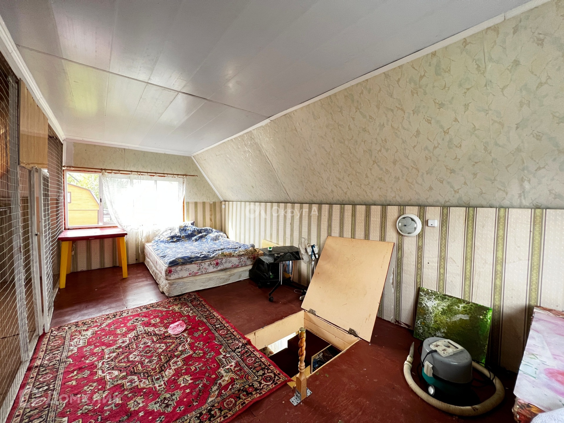На второй этаж ведет деревянная лестница. Второй этаж вмещает в себя одну просторную комнату.