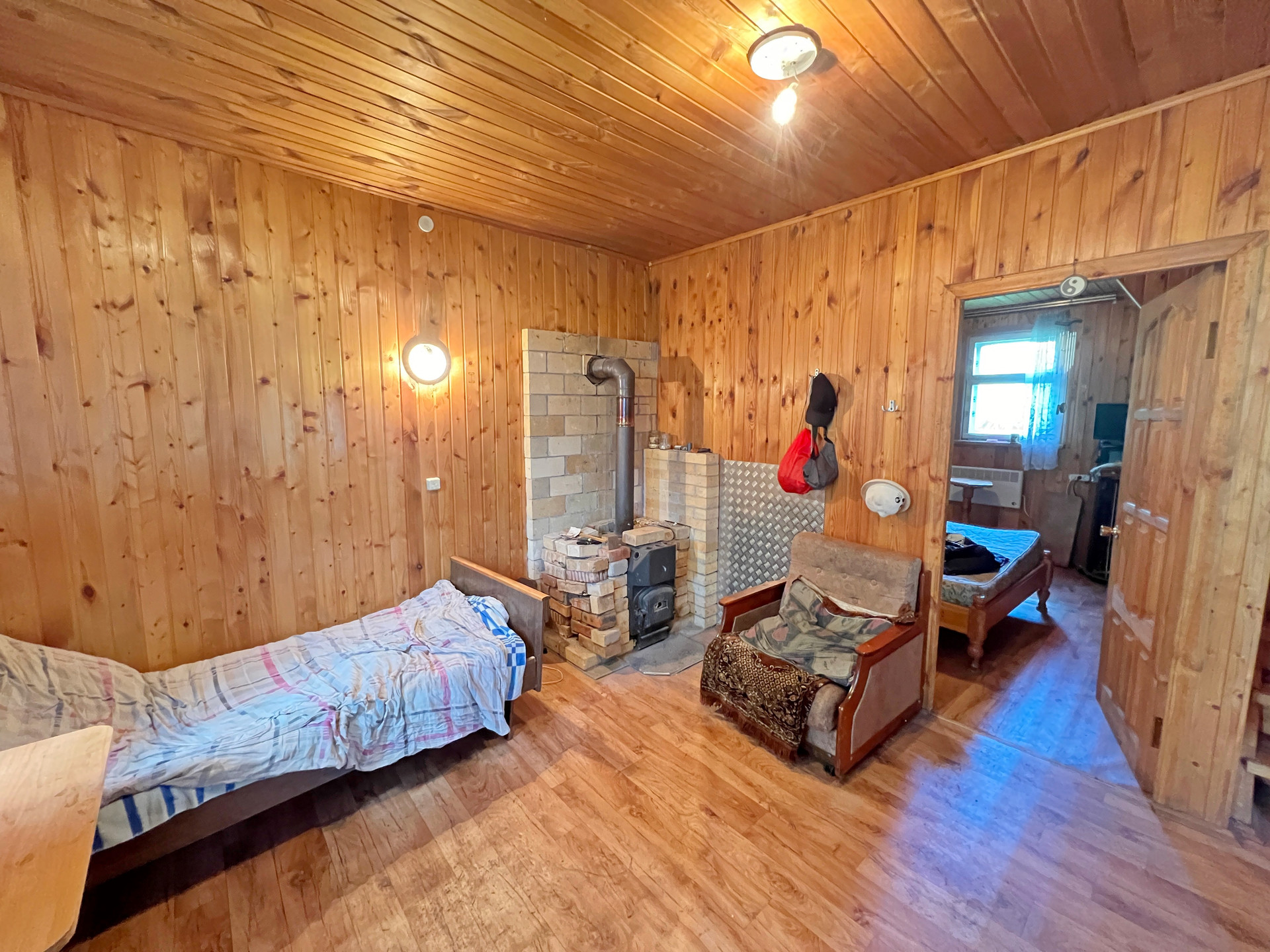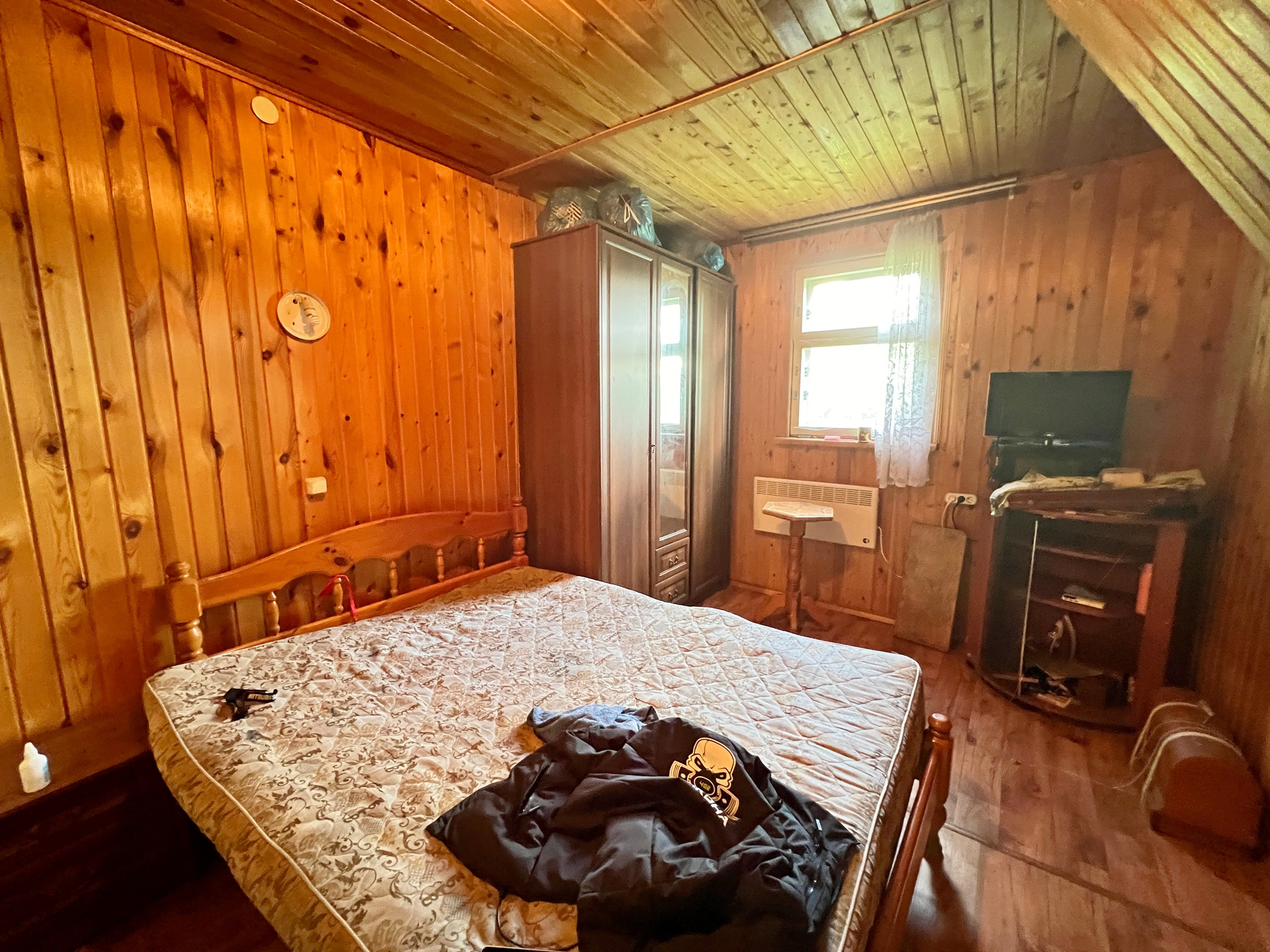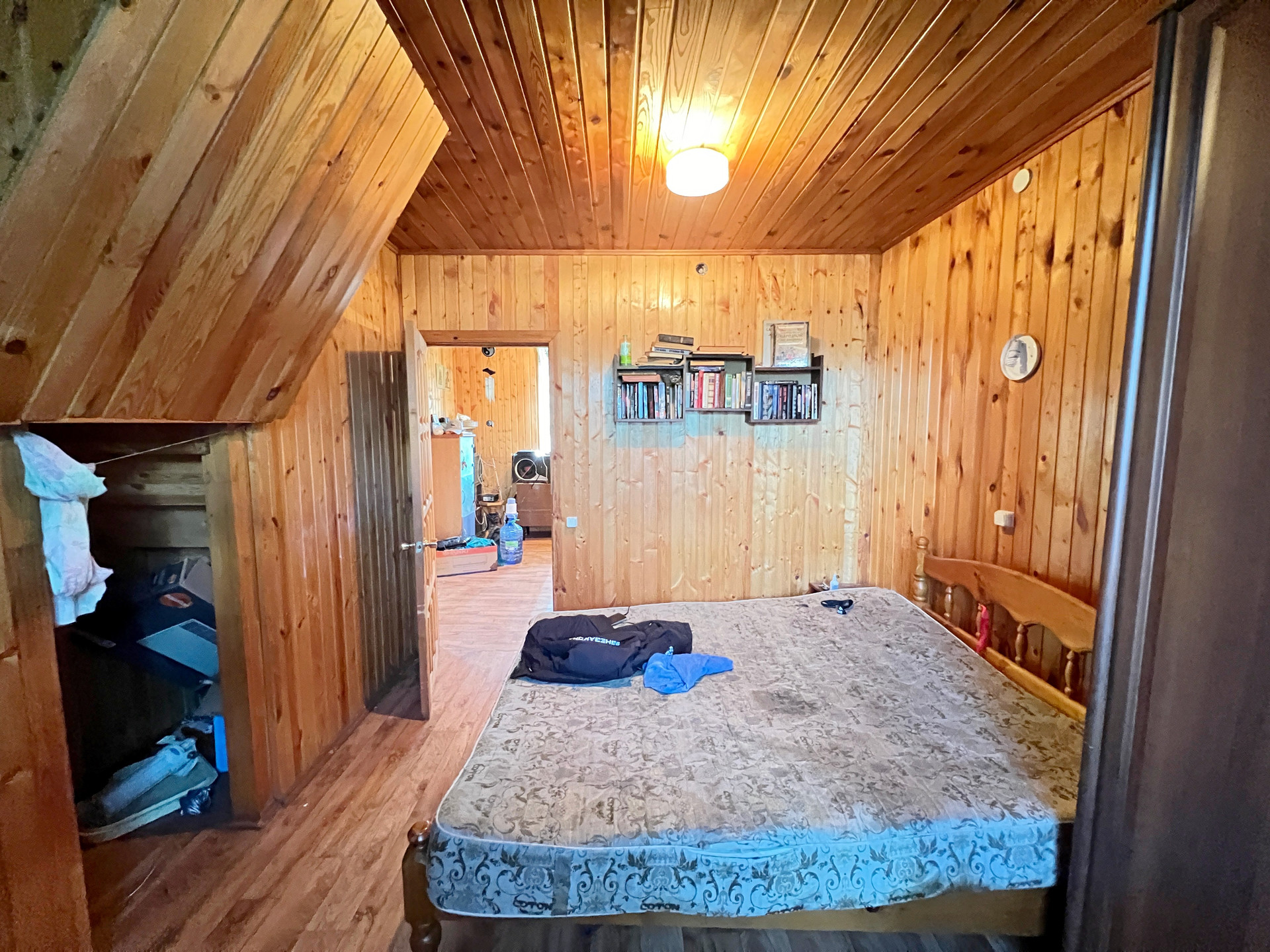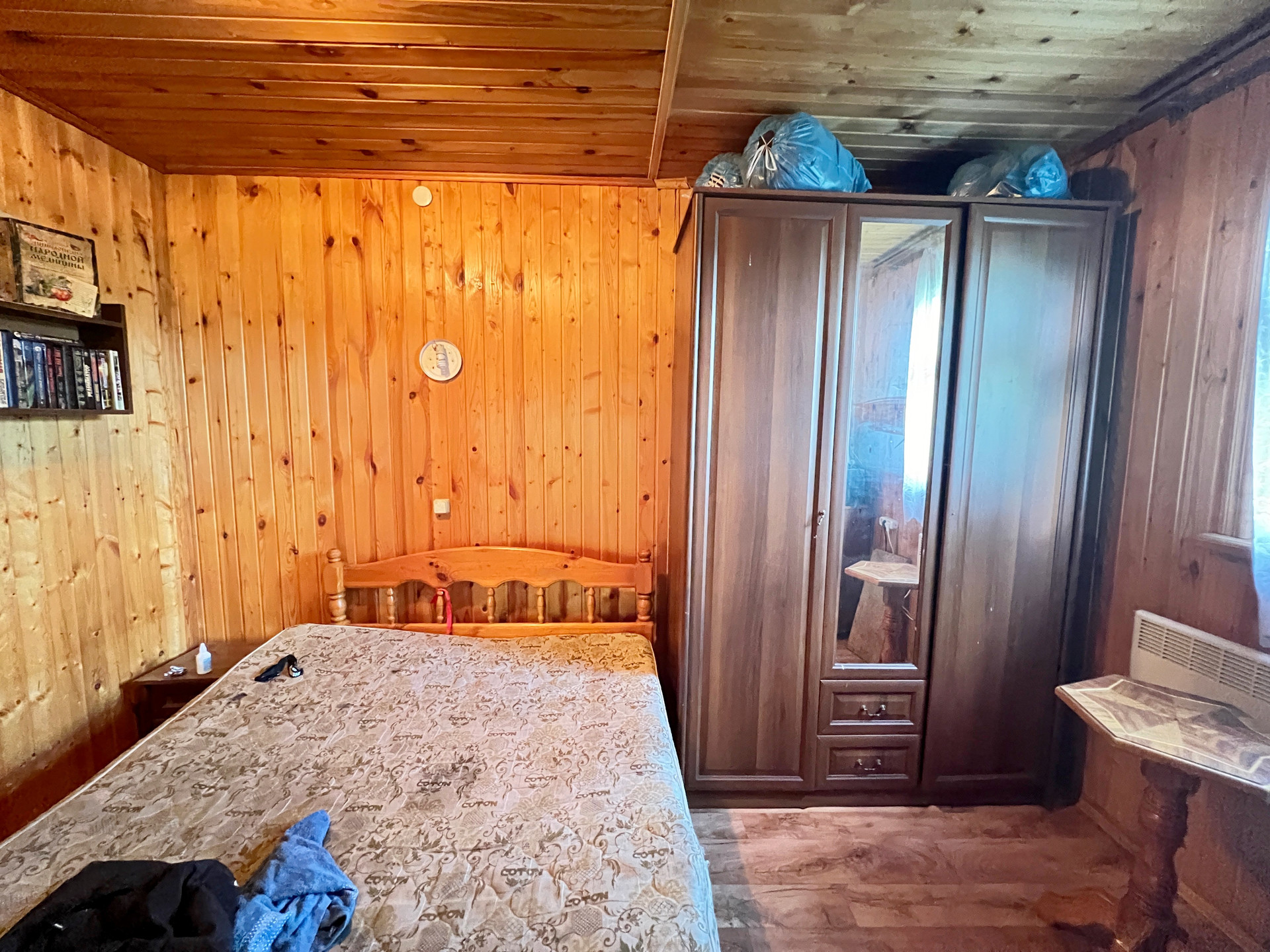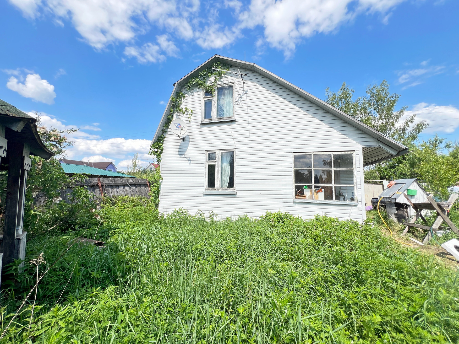 Дом 60 кв. м на ленточном фундаменте из бруса, обшит сайдингом, крыша покрыта шифером. В доме просторная веранда, на первом этаже две комнаты и кухня, туалет и душевая кабина, на втором этаже просторная спальня.