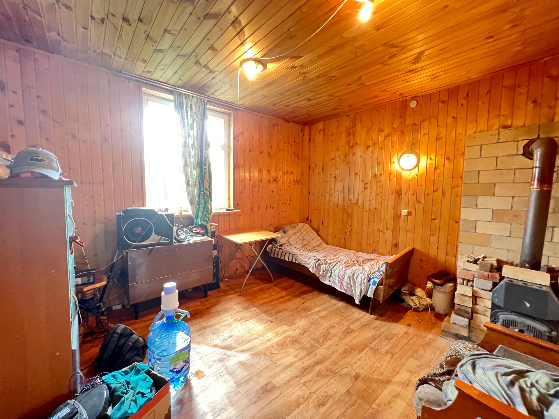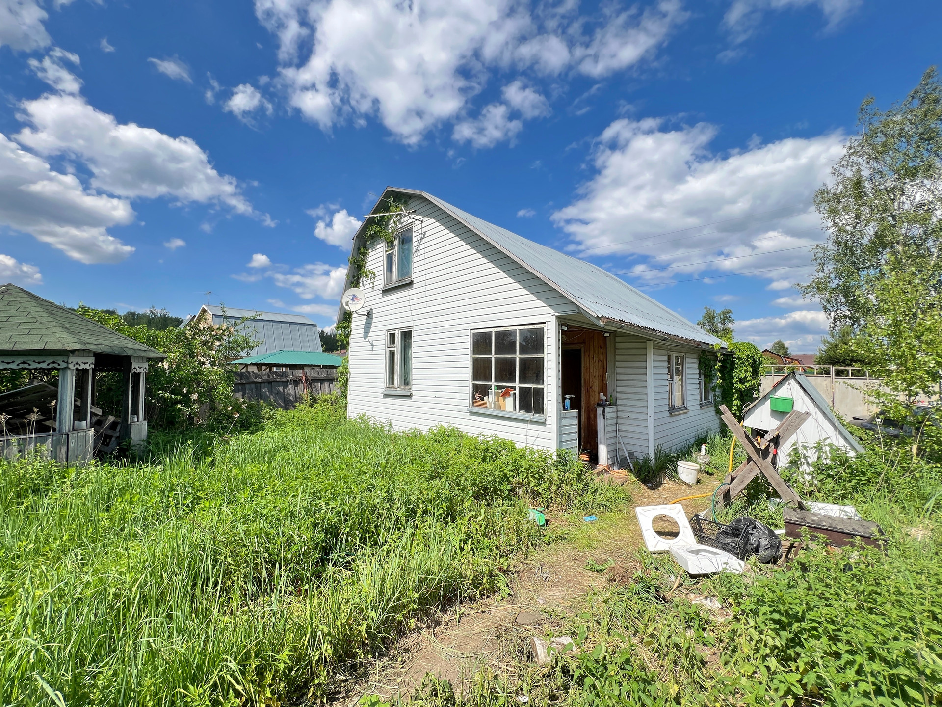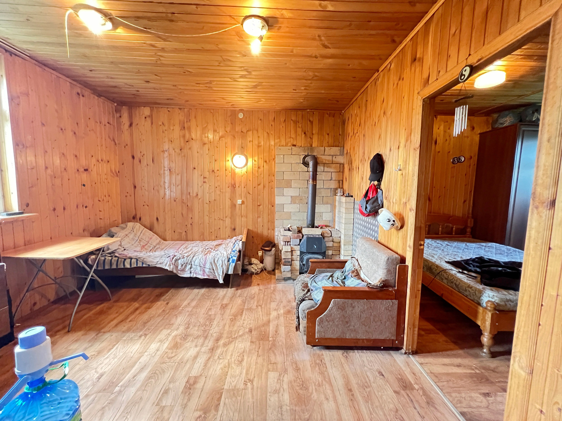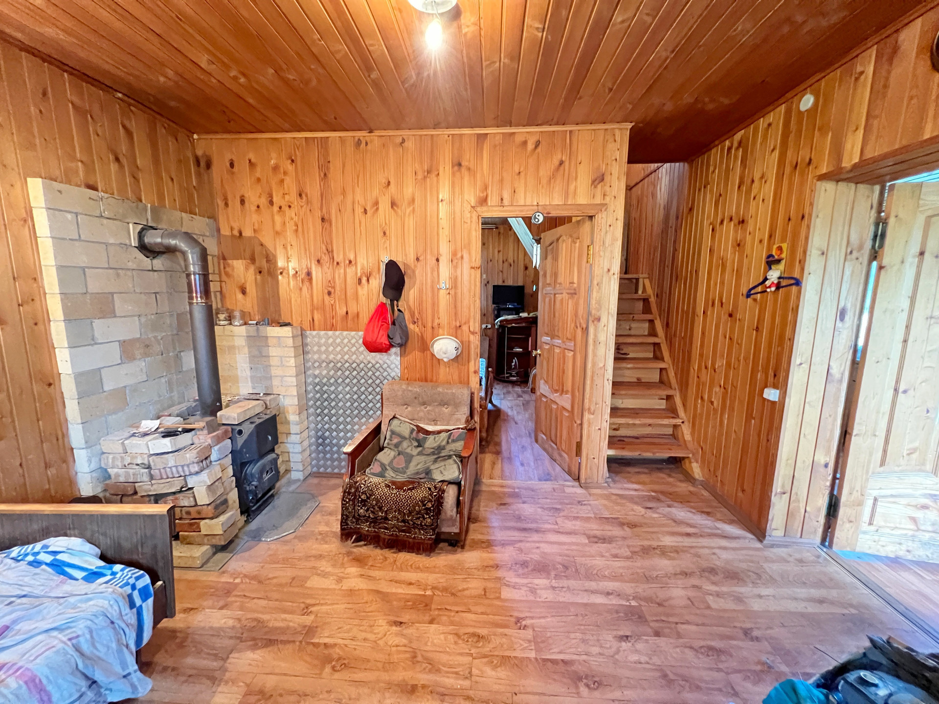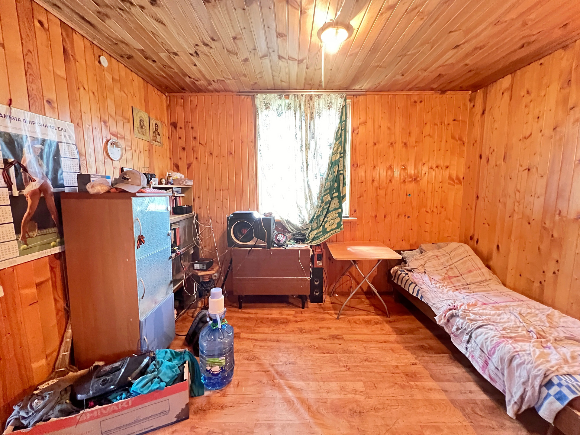 Дом 60 кв. м на ленточном фундаменте из бруса, обшит сайдингом, крыша покрыта шифером. В доме просторная веранда, на первом этаже две комнаты и кухня, туалет и душевая кабина, на втором этаже просторная спальня.