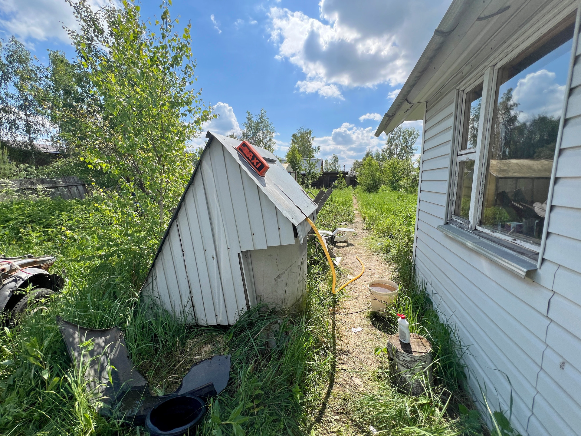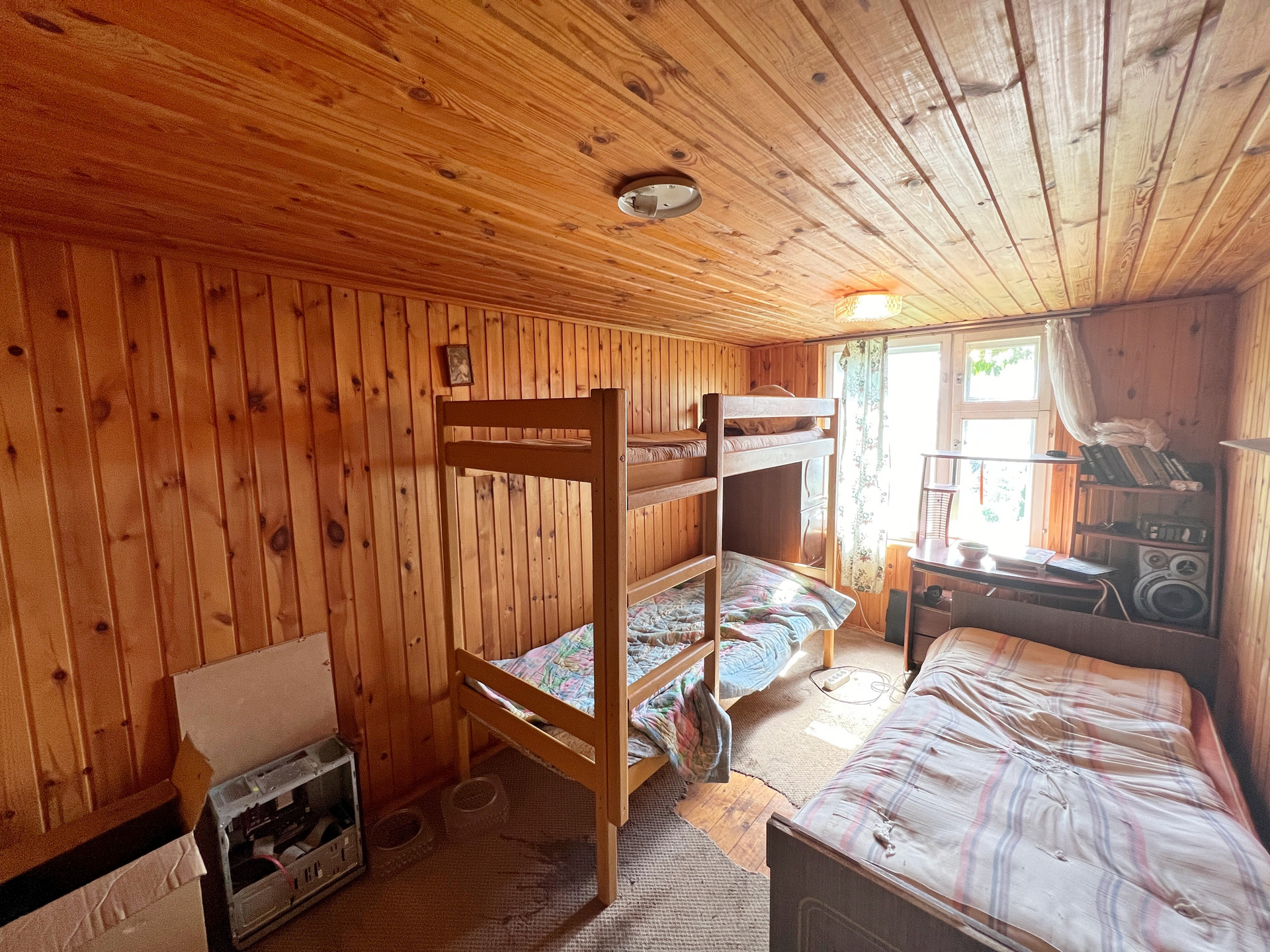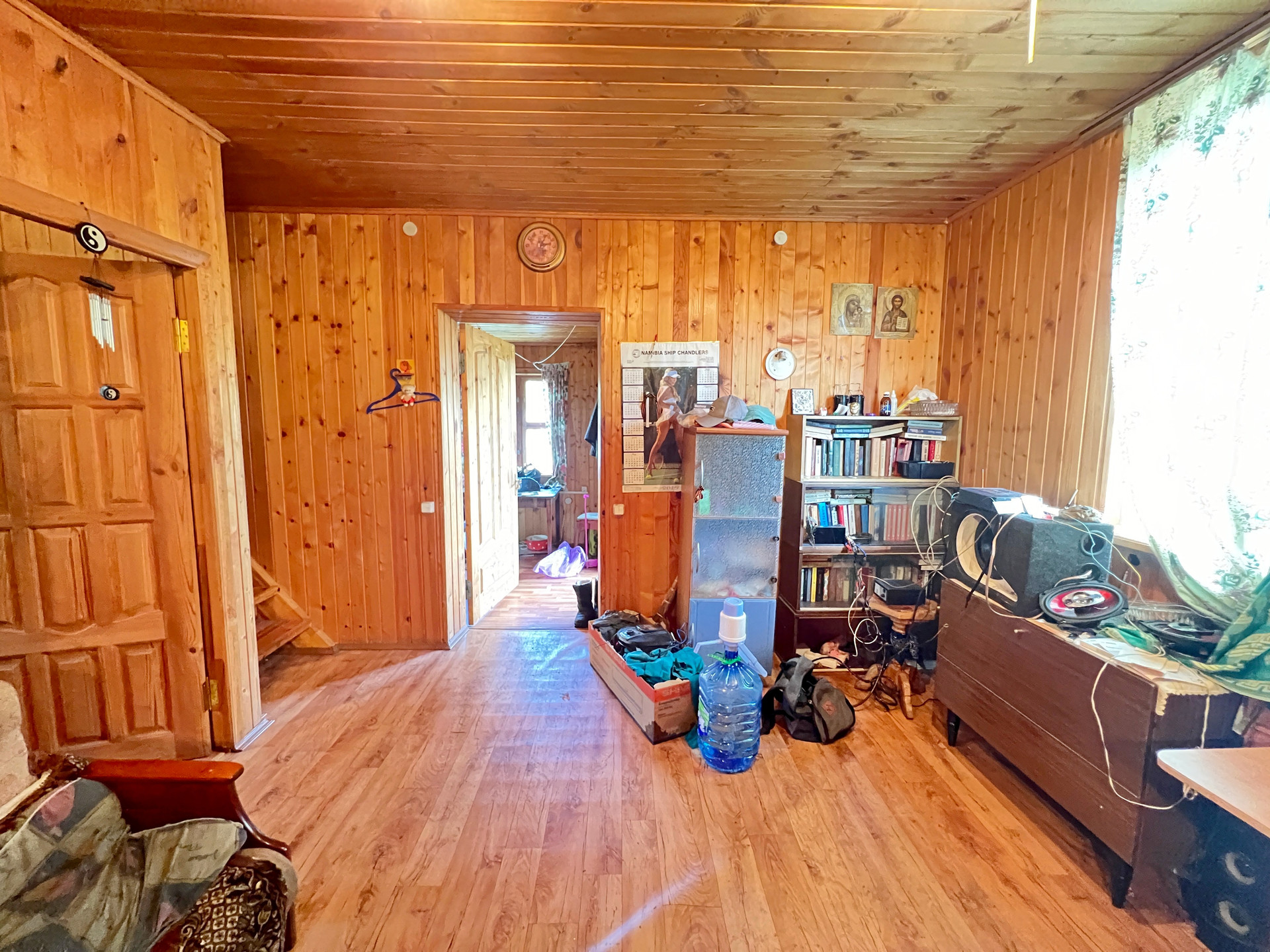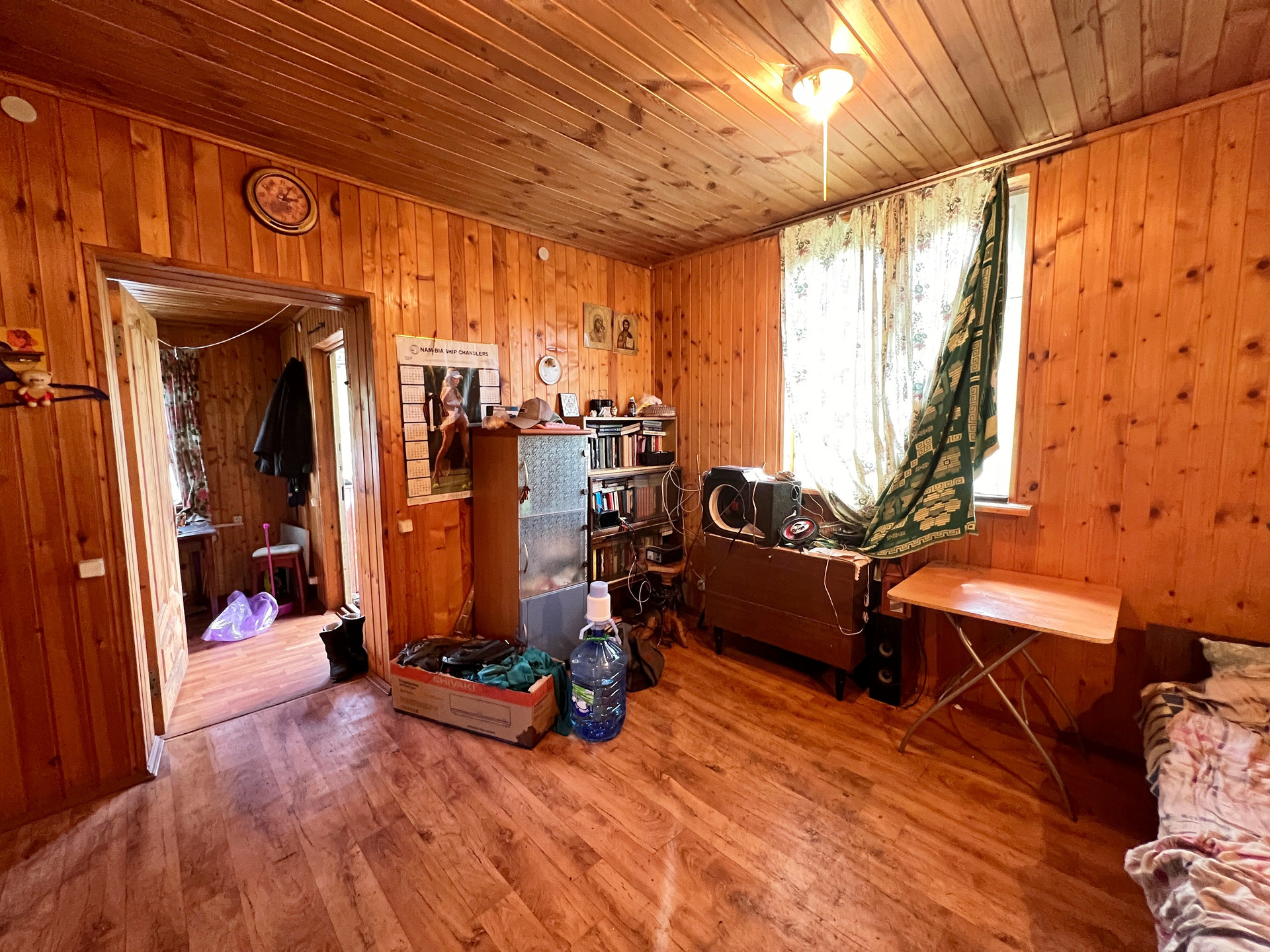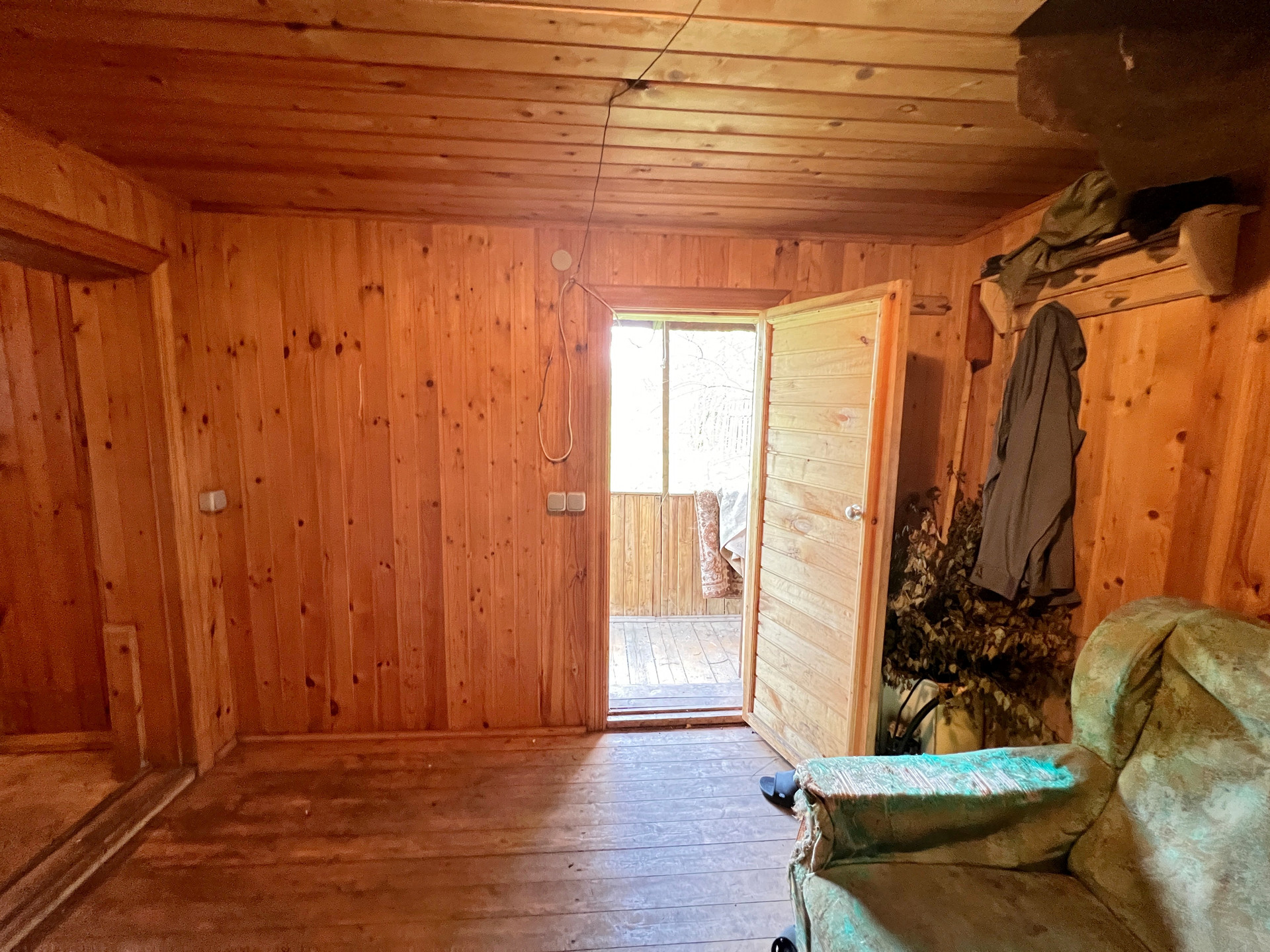 Дом 60 кв. м на ленточном фундаменте из бруса, обшит сайдингом, крыша покрыта шифером. В доме просторная веранда, на первом этаже две комнаты и кухня, туалет и душевая кабина, на втором этаже просторная спальня.