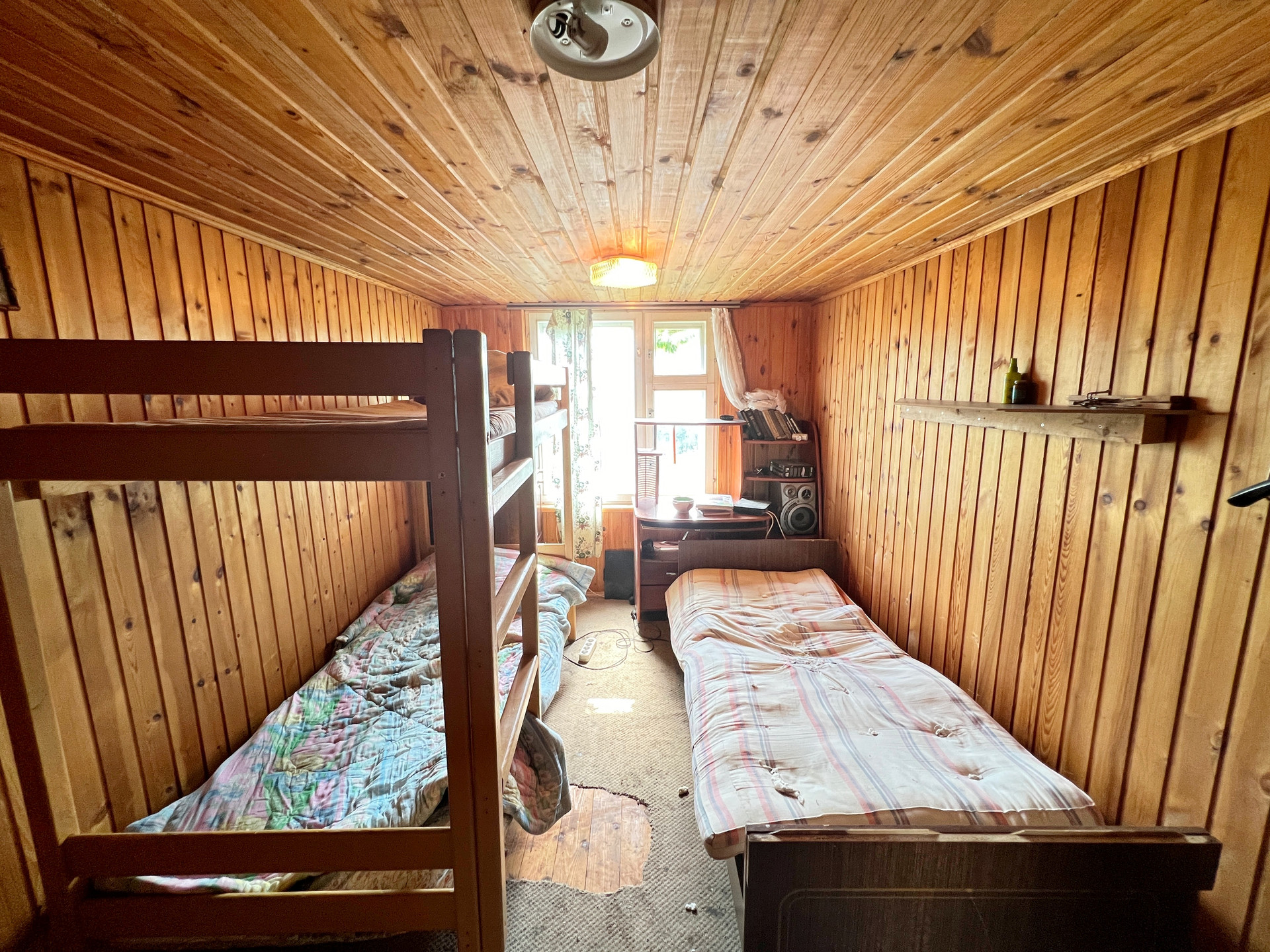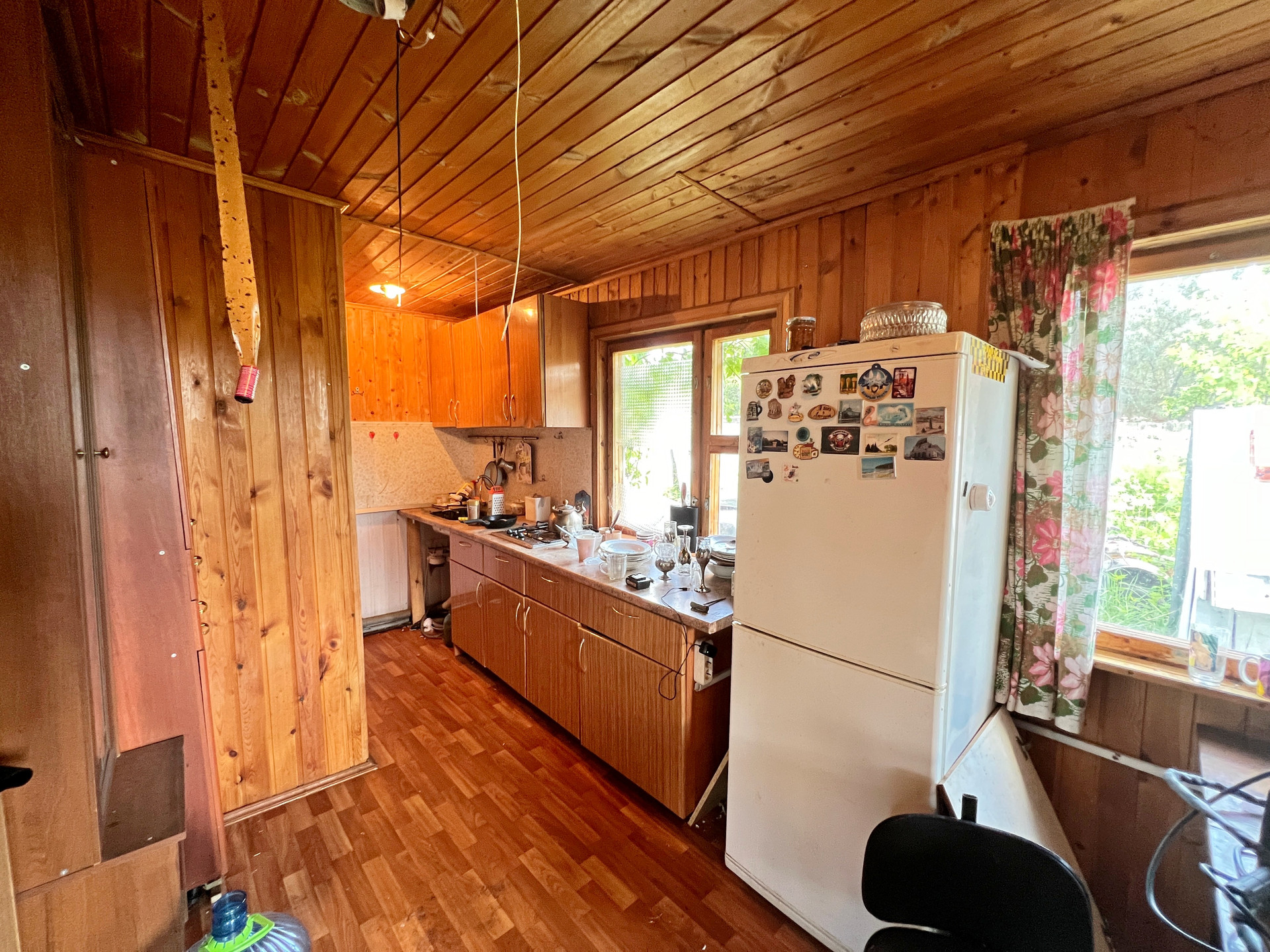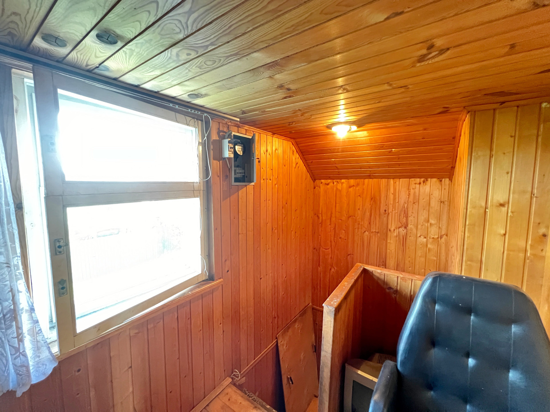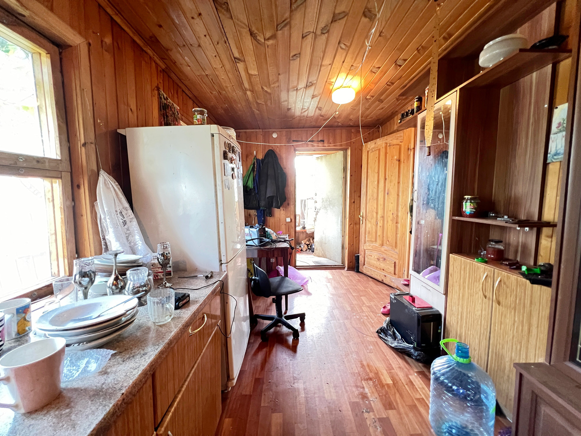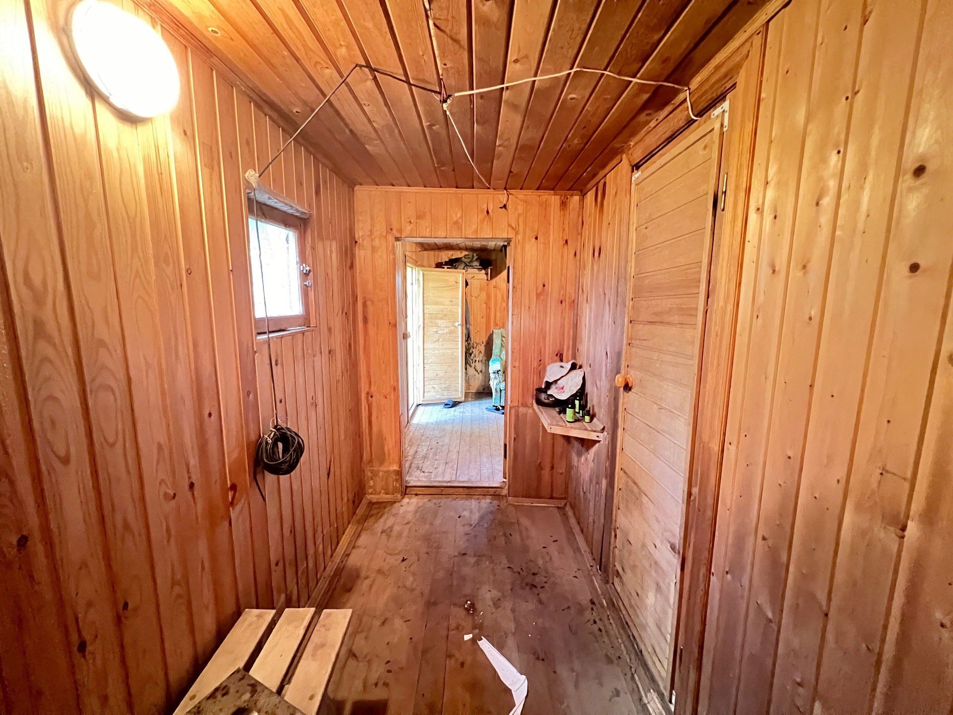 Дом 60 кв. м на ленточном фундаменте из бруса, обшит сайдингом, крыша покрыта шифером. В доме просторная веранда, на первом этаже две комнаты и кухня, туалет и душевая кабина, на втором этаже просторная спальня.