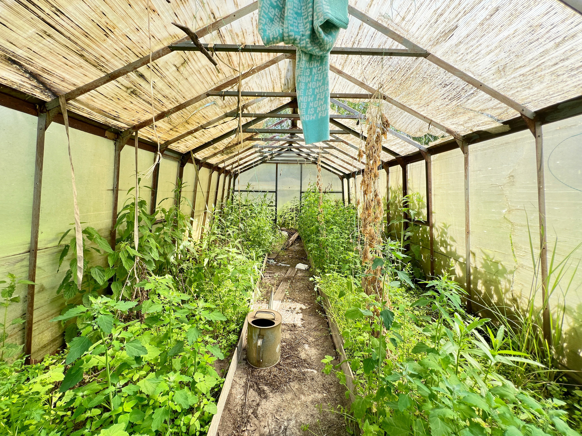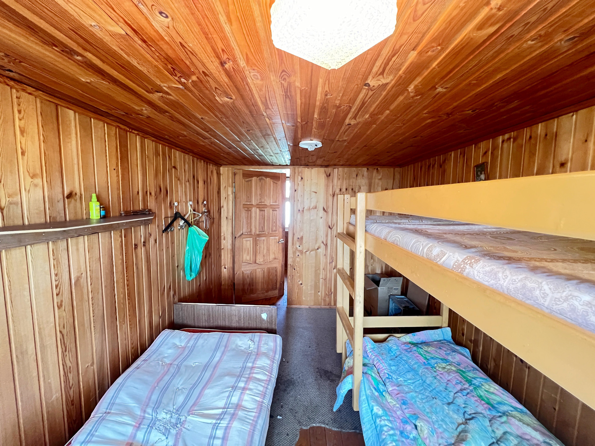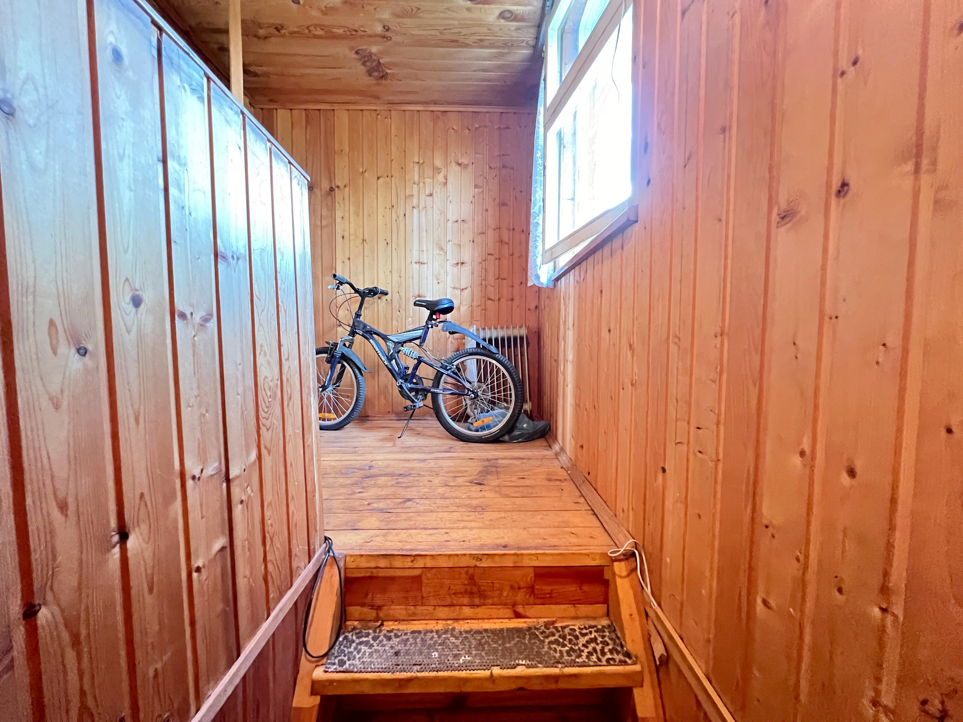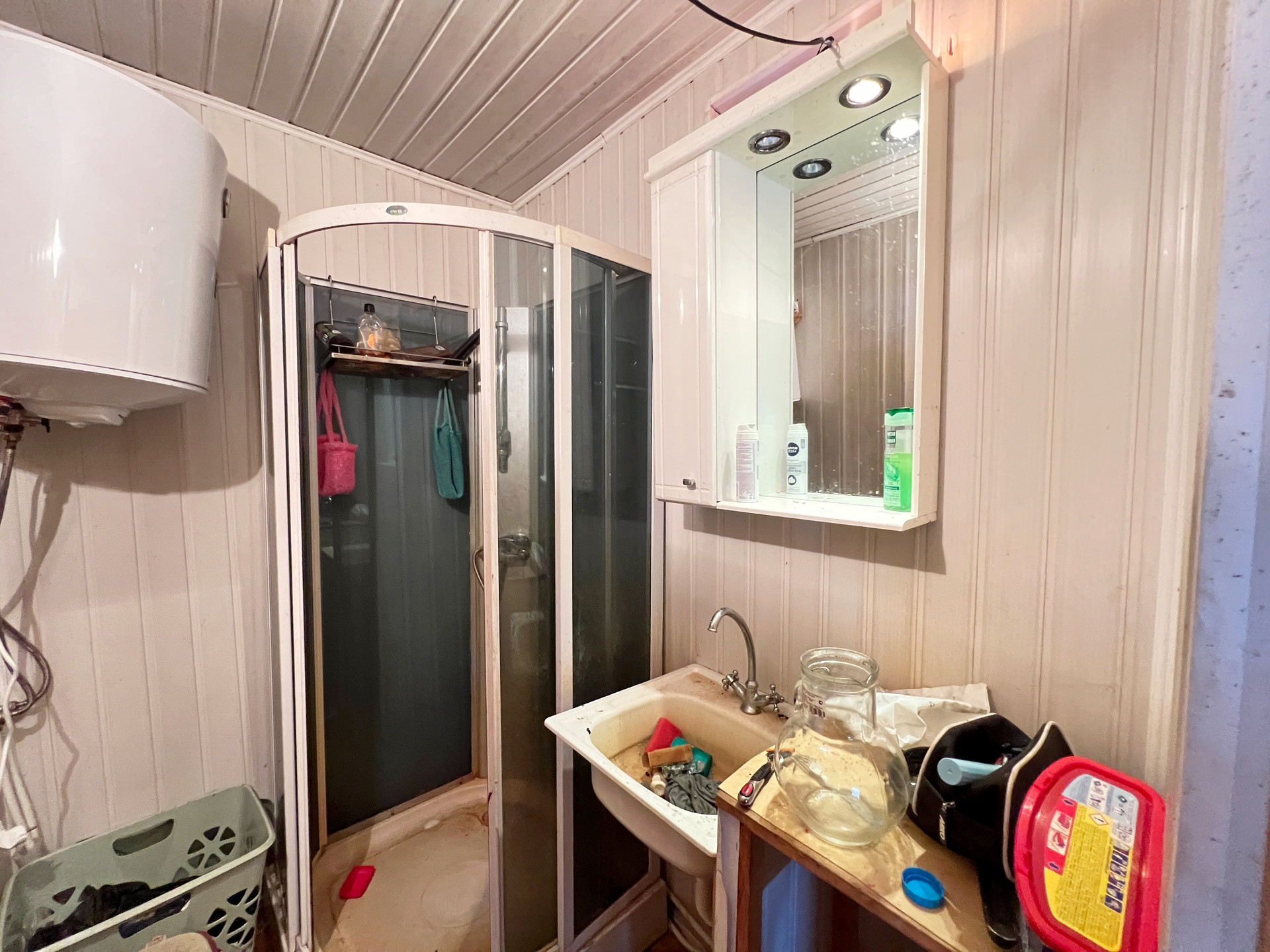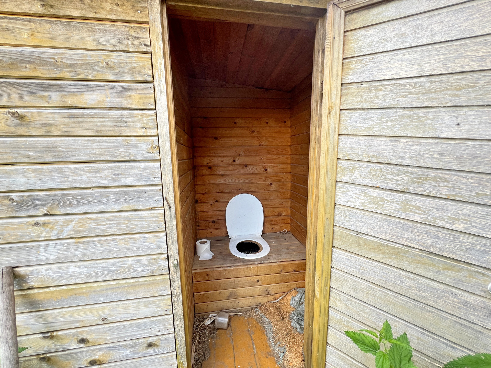 Дом 60 кв. м на ленточном фундаменте из бруса, обшит сайдингом, крыша покрыта шифером. В доме просторная веранда, на первом этаже две комнаты и кухня, туалет и душевая кабина, на втором этаже просторная спальня.