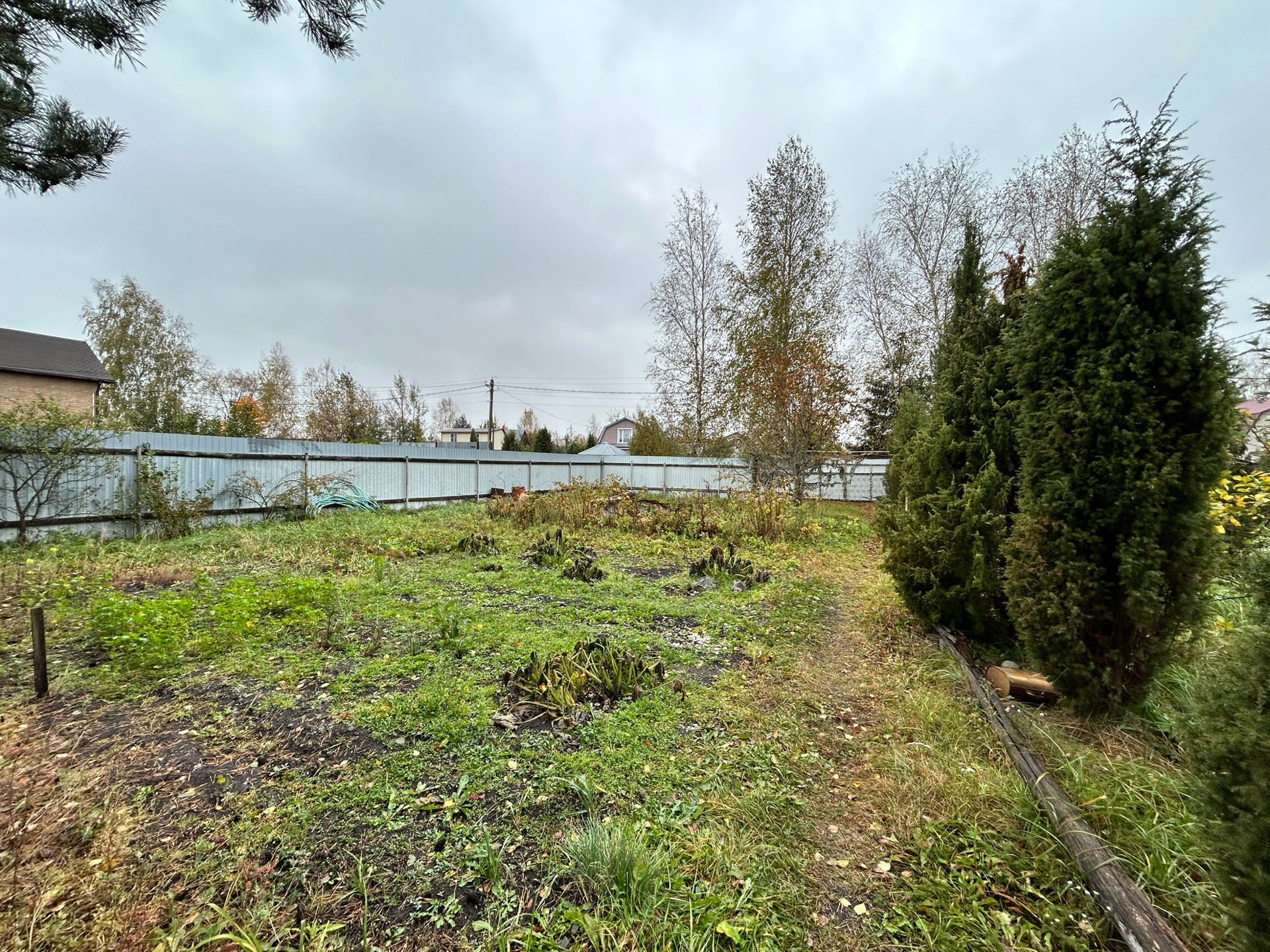1) Участок правильной формы, огорожен со всех сторон забором из профлиста, сделан заезд .