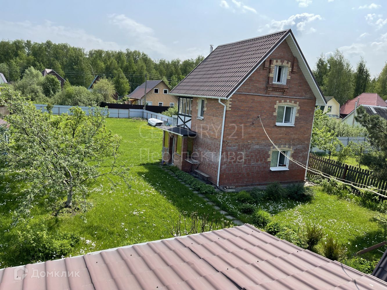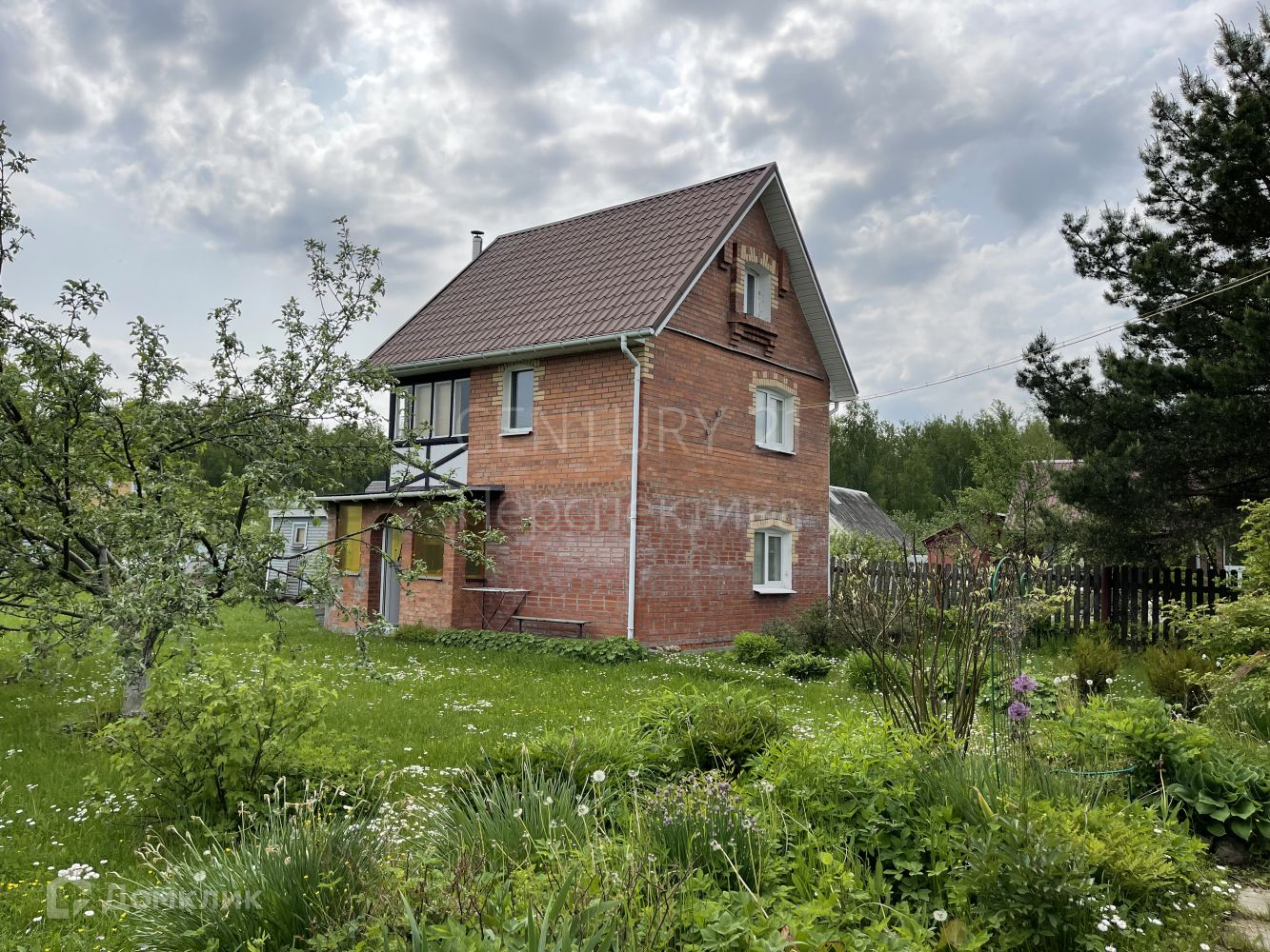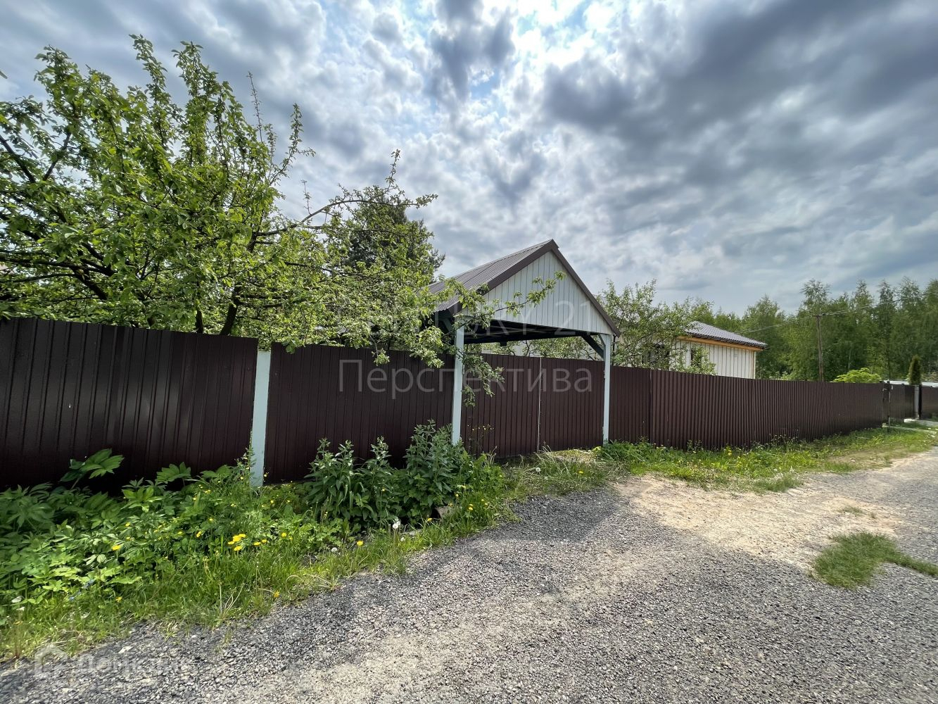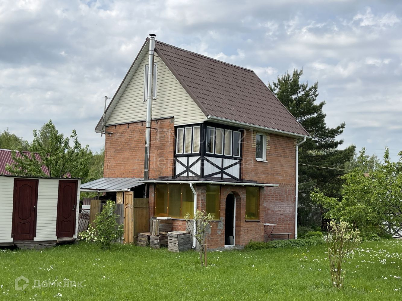 На участке: кирпичный 3-х этажный дом с балконом, отопление - электрические конвекторы, удобства - на улице. Также на участке - садовый каркасно-щитовой домик, 2 этажа, с террасой, без отопления; навес для машины; колодец с питьевой водой, вода в дом не заведена. Электричество есть. Въезд на территорию СНТ - шлагбаум.