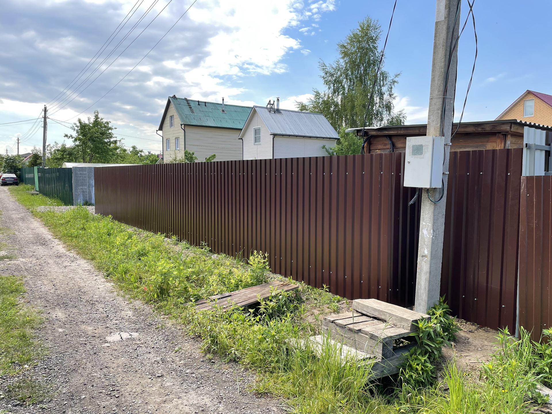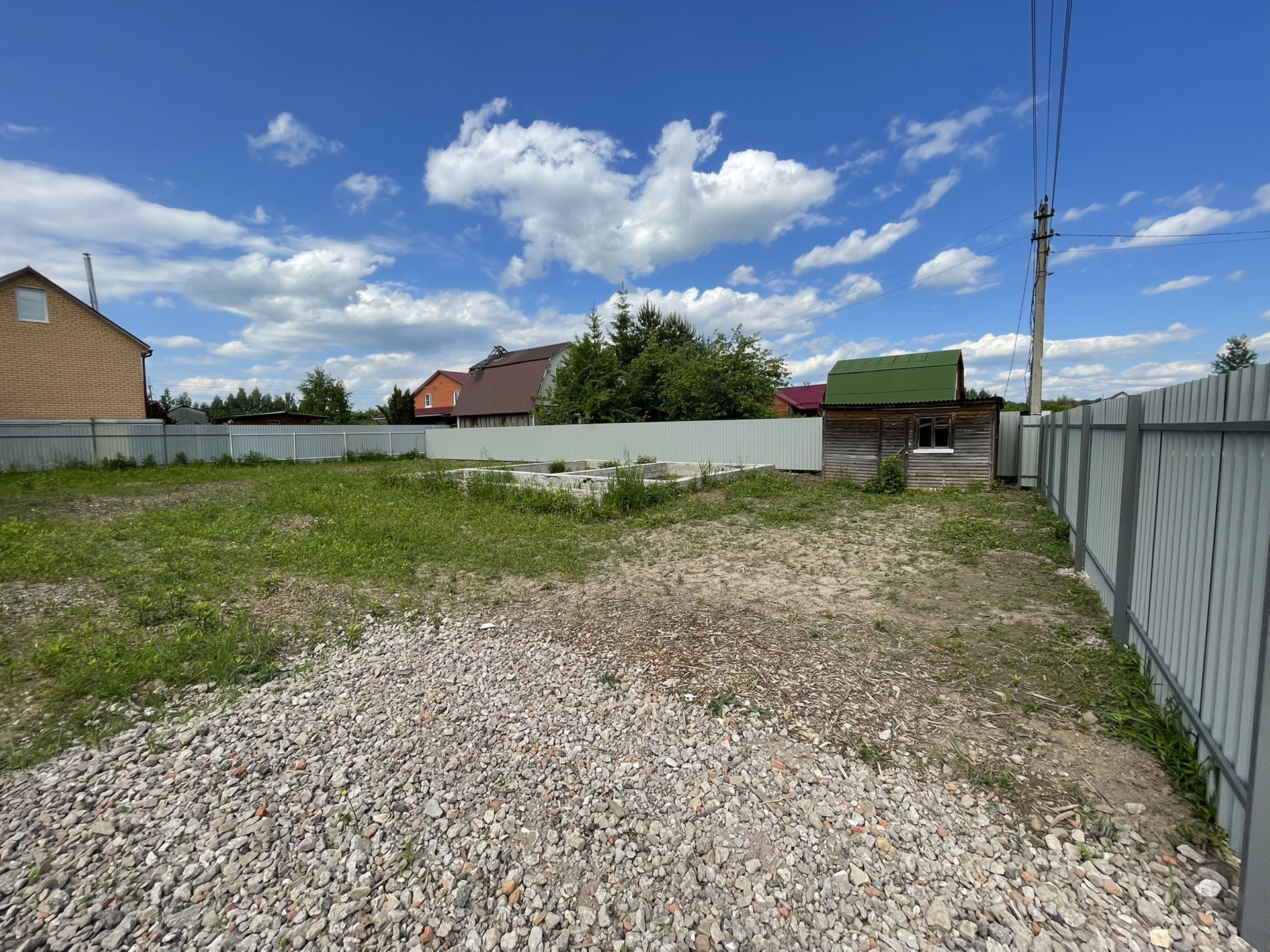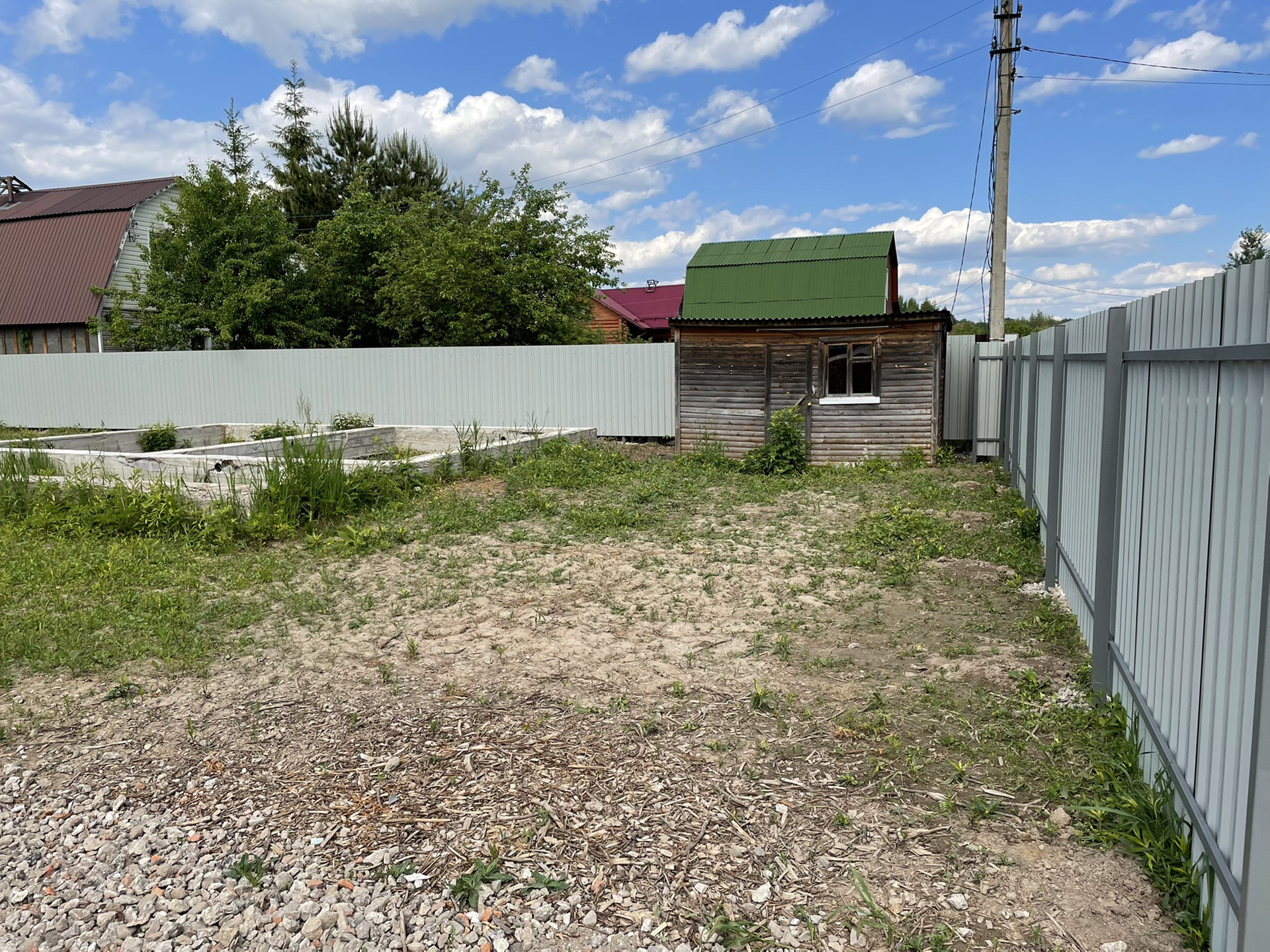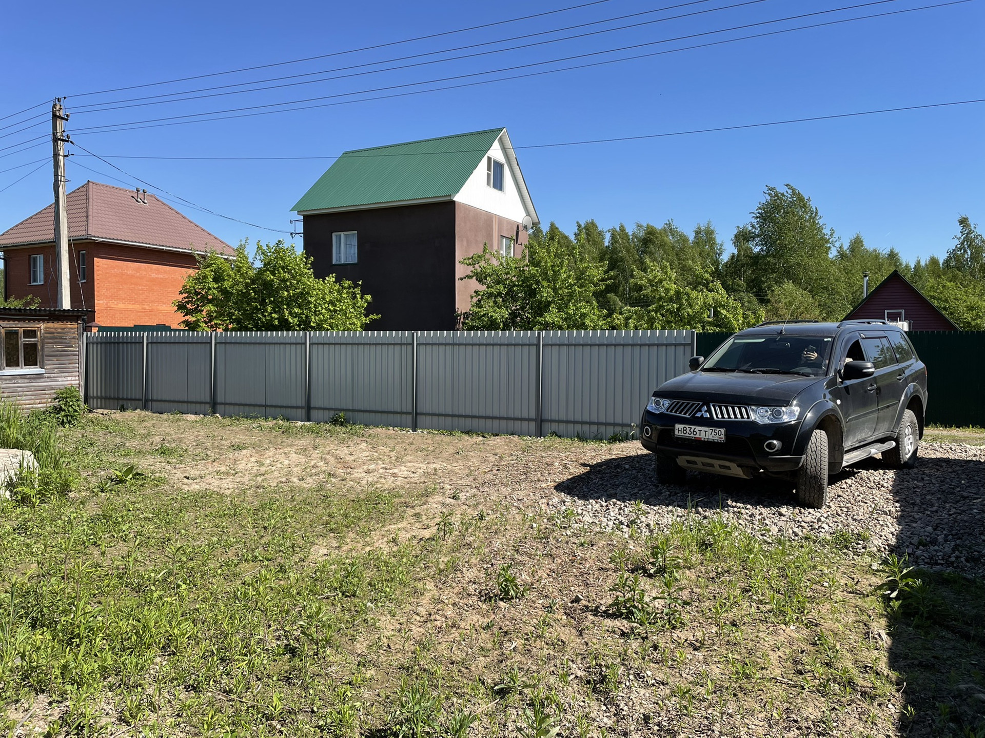 Участок 20м х 30м, ровный. Огорожен забором 1,8м (профлист). Ворота откатные 4м.